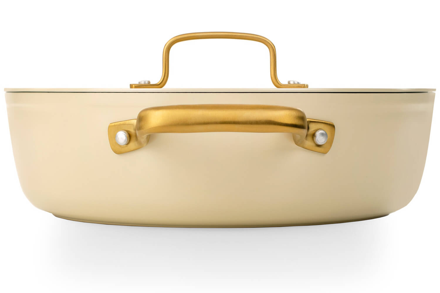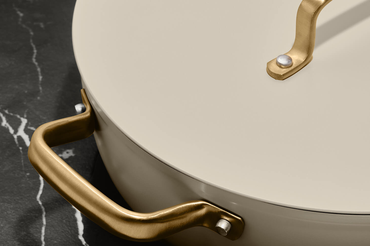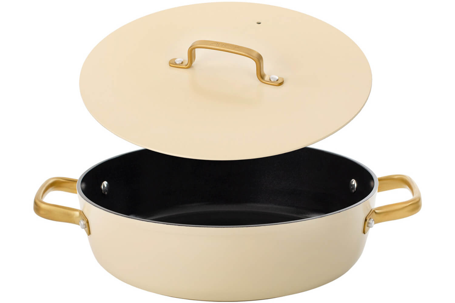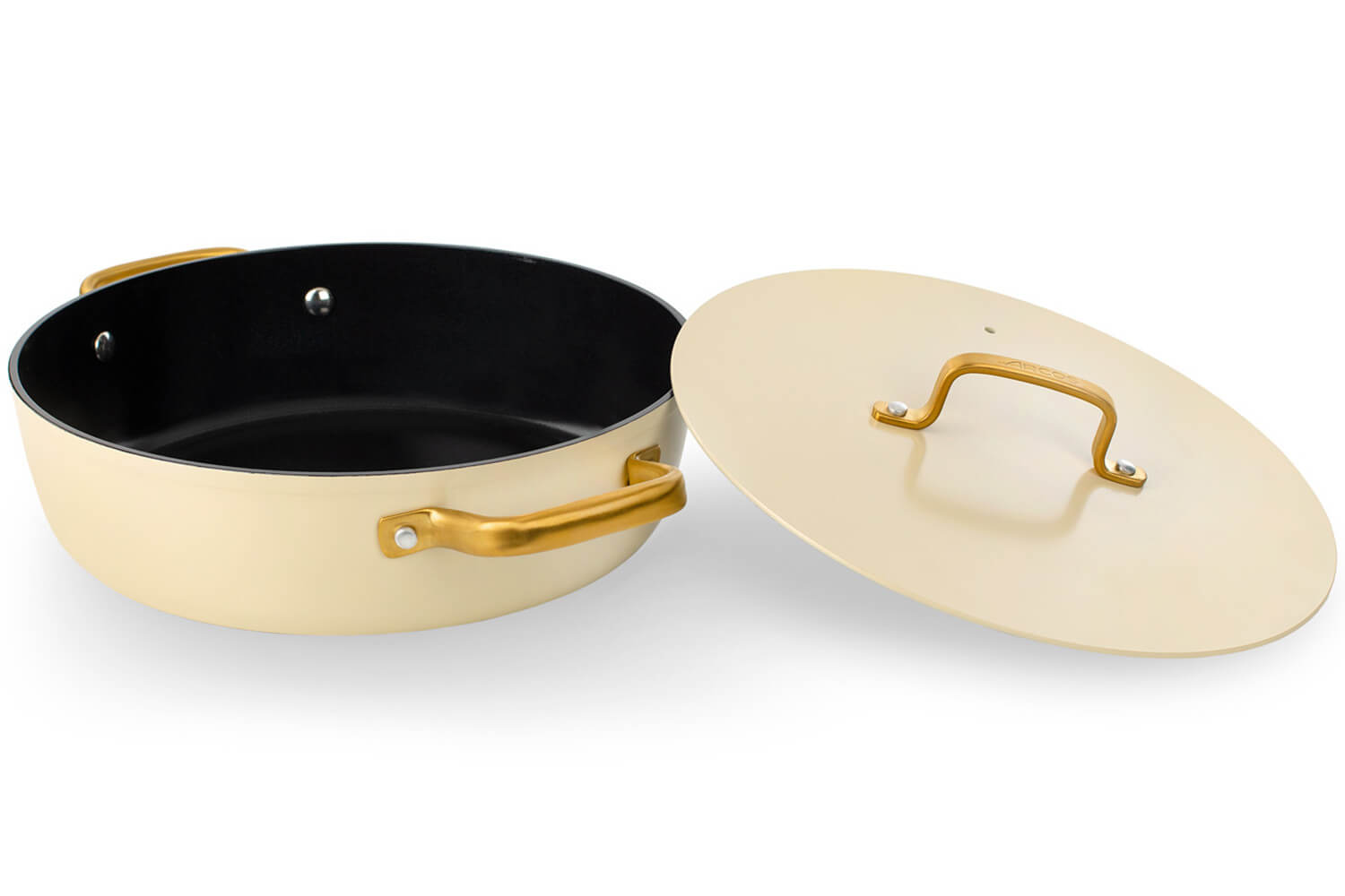 Le sautoir et le couvercle sont dotés d'élégantes anses dorées en PVD (Physical Vapor Deposition), un revêtement technique appliqué sur l’inox par dépôt physique en phase vapeur. Ce procédé rend les anses hautement résistantes à la chaleur, à l'usure et à la corrosion. En plus, leur forme ergonomique permet une prise en main stable, même avec un torchon ou une manique.