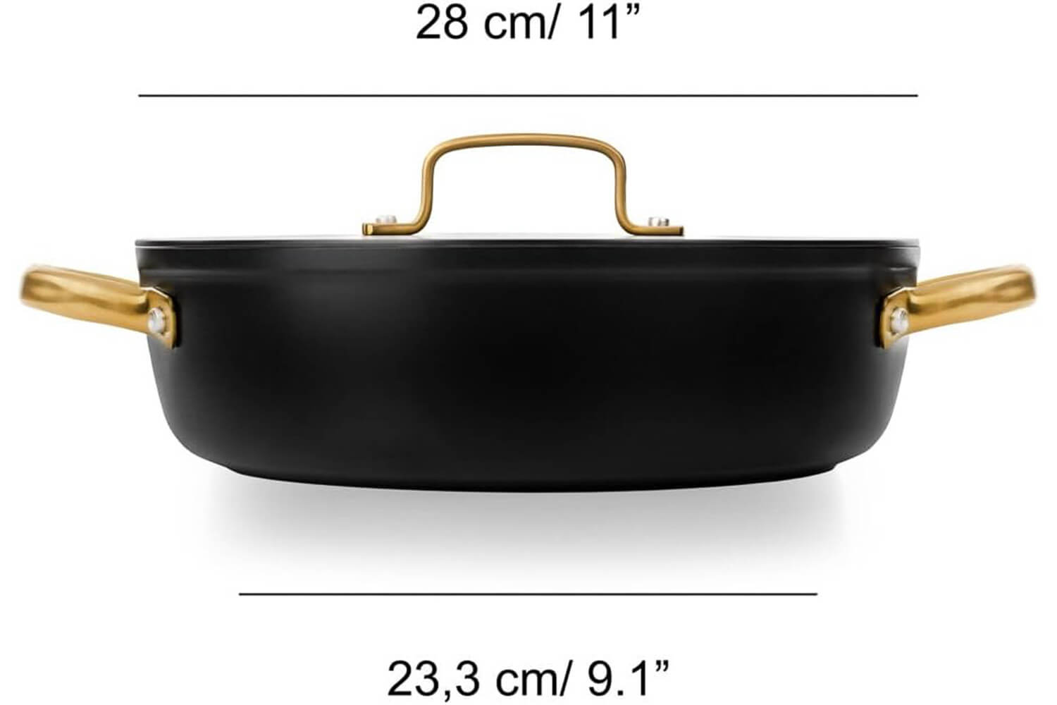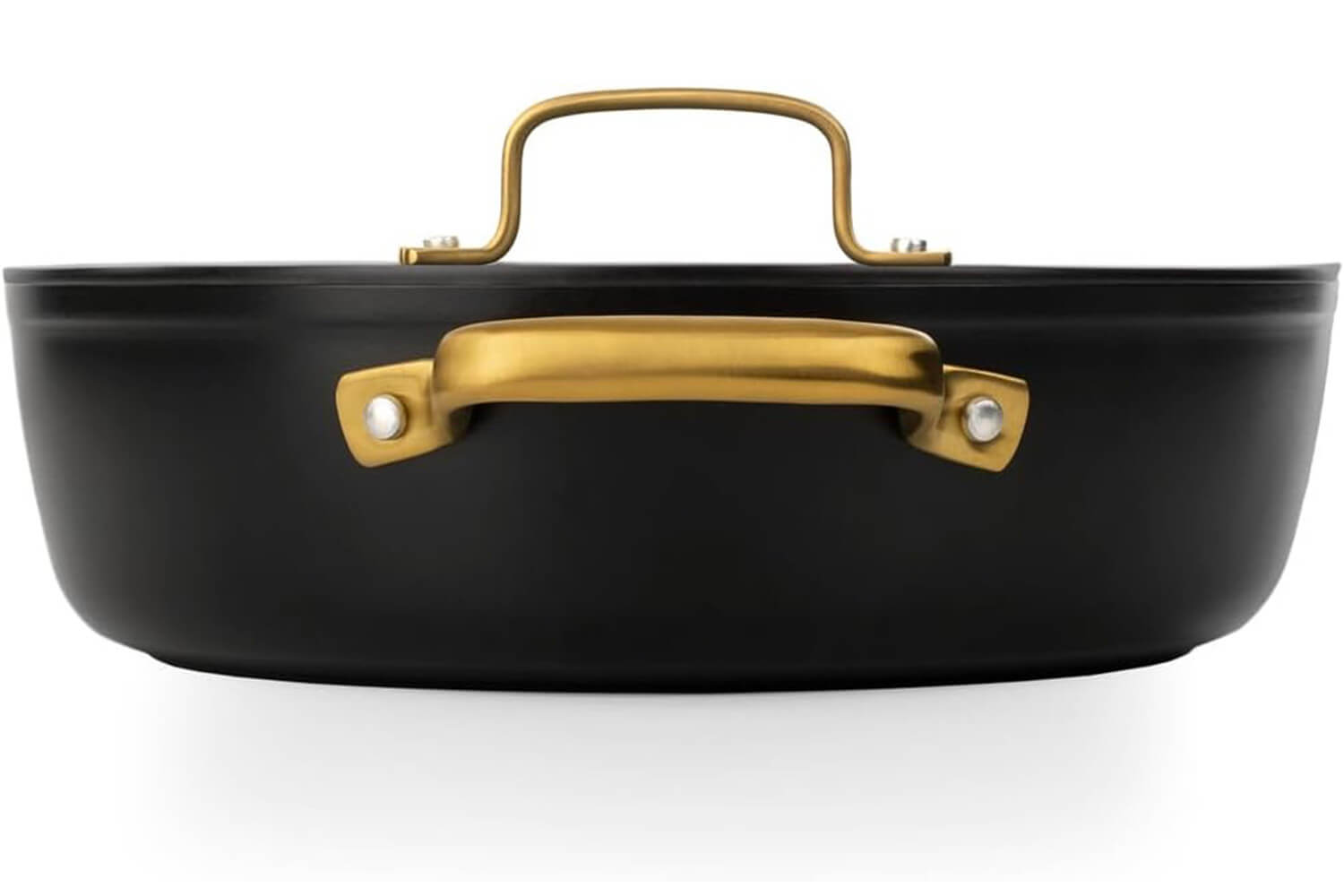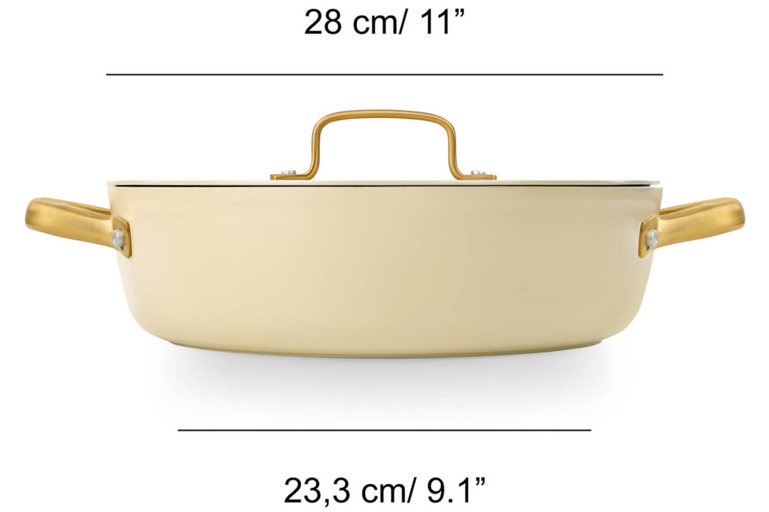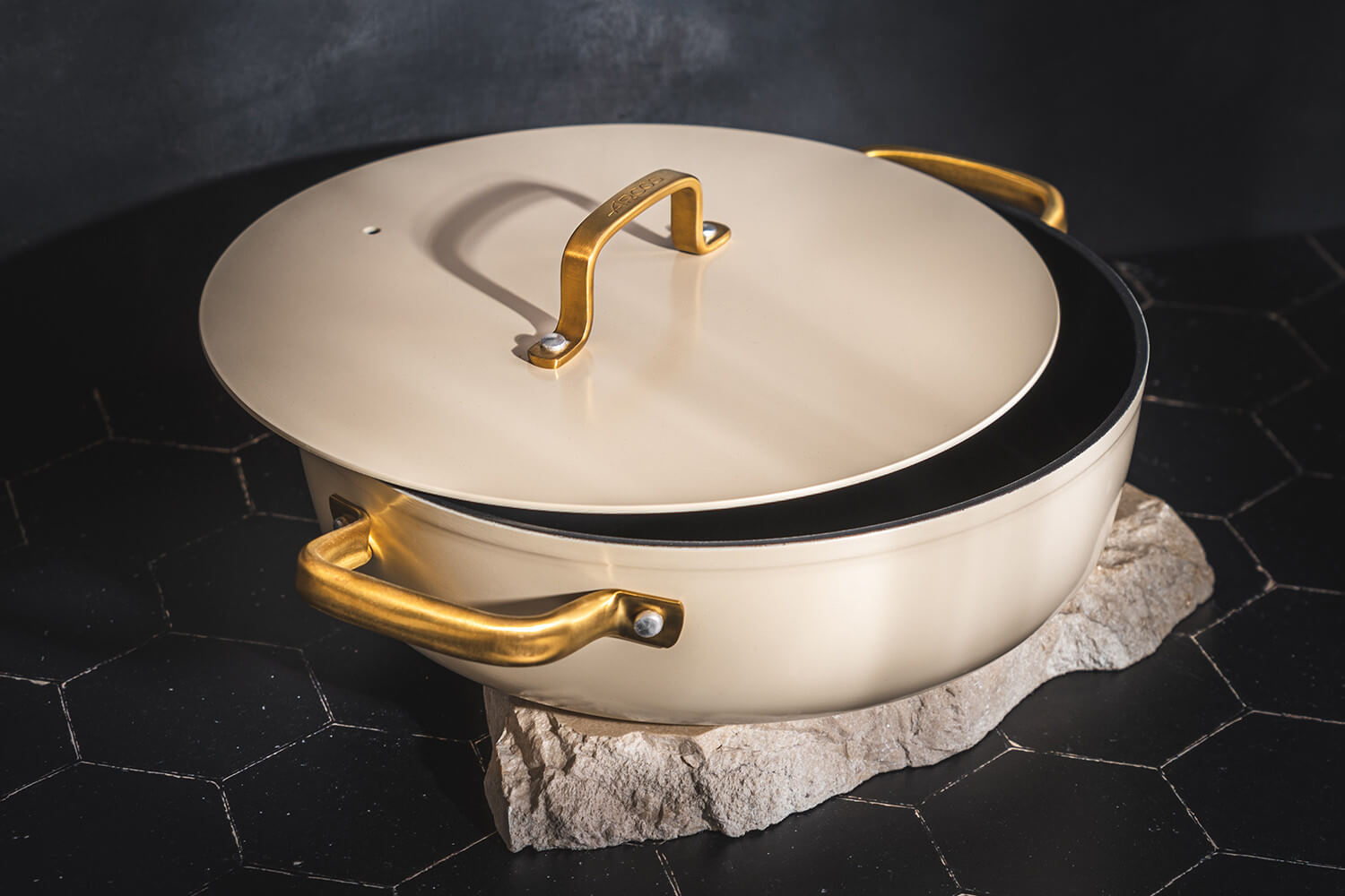 Le sautoir et le couvercle sont dotés d'élégantes anses dorées en PVD (Physical Vapor Deposition), un revêtement technique appliqué sur l’inox par dépôt physique en phase vapeur. Ce procédé rend les anses hautement résistantes à la chaleur, à l'usure et à la corrosion. En plus, leur forme ergonomique permet une prise en main stable, même avec un torchon ou une manique.