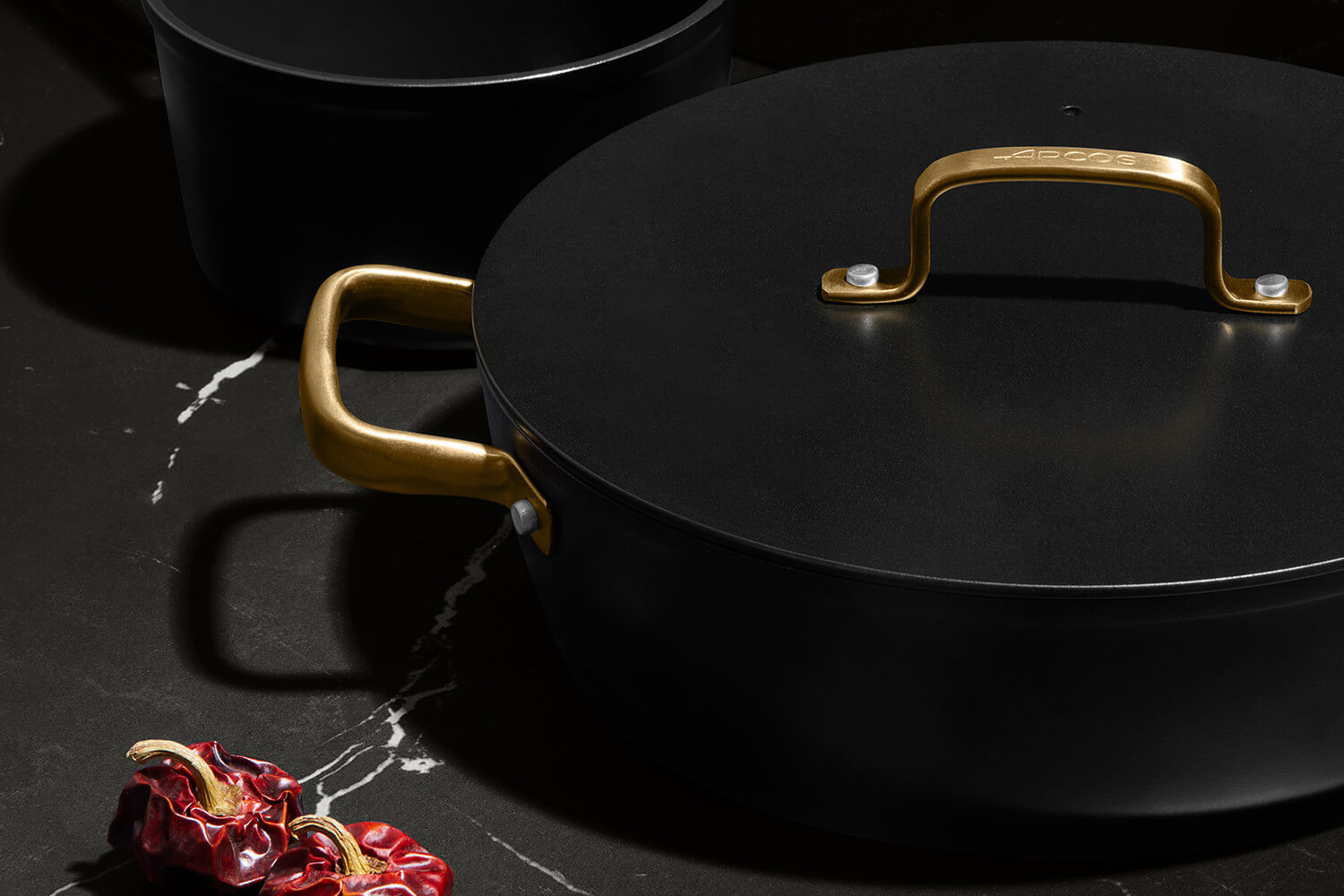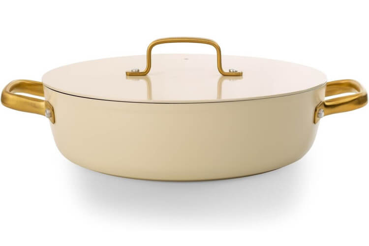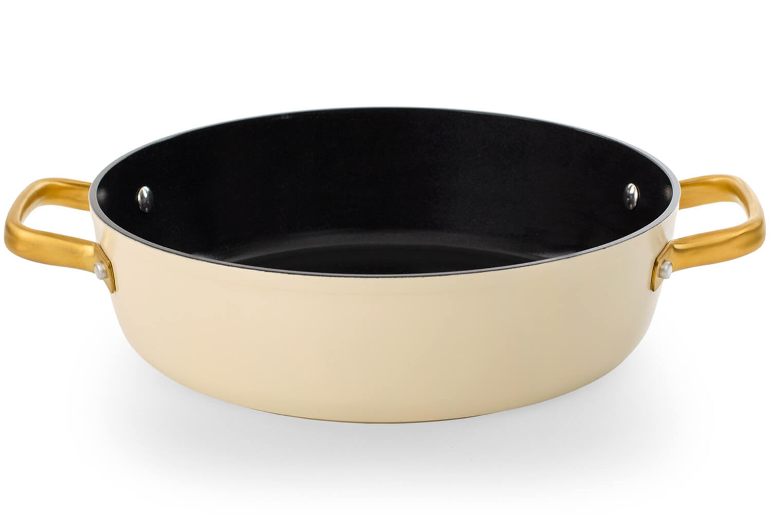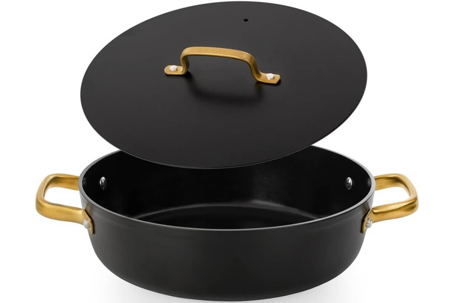 Le sautoir et le couvercle sont dotés d'élégantes anses dorées en PVD (Physical Vapor Deposition), un revêtement technique appliqué sur l’inox par dépôt physique en phase vapeur. Ce procédé rend les anses hautement résistantes à la chaleur, à l'usure et à la corrosion. En plus, leur forme ergonomique permet une prise en main stable, même avec un torchon ou une manique.