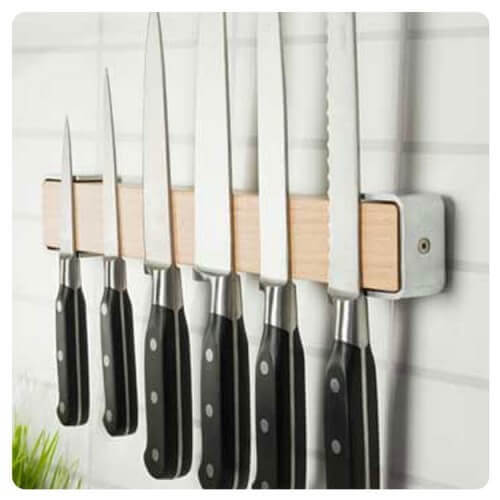La longueur de la barre est de 34cm x 50mm, vous pouvez ainsi y poser environ 6 couteaux de cuisine. De quoi y mettre les couteaux que vous utilisez le plus souvent comme vos couteaux de chef, couteaux d'office, couteau santoku et couteau à pain par exemple.