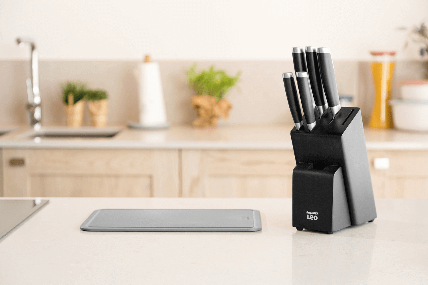 Le bloc 5 couteaux Graphite Leo dispose d’une base antidérapante comprenant 4 pieds, qui stabilisent votre bloc sur le plan de travail. Pour compléter l'ensemble, un espace de rangement est prévu pour le couteau santoku et les ciseaux à volaille.