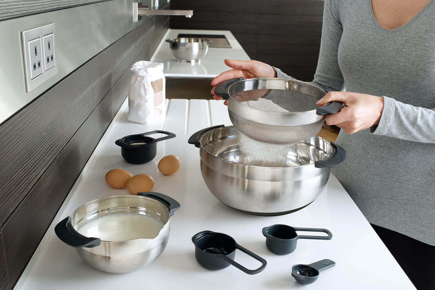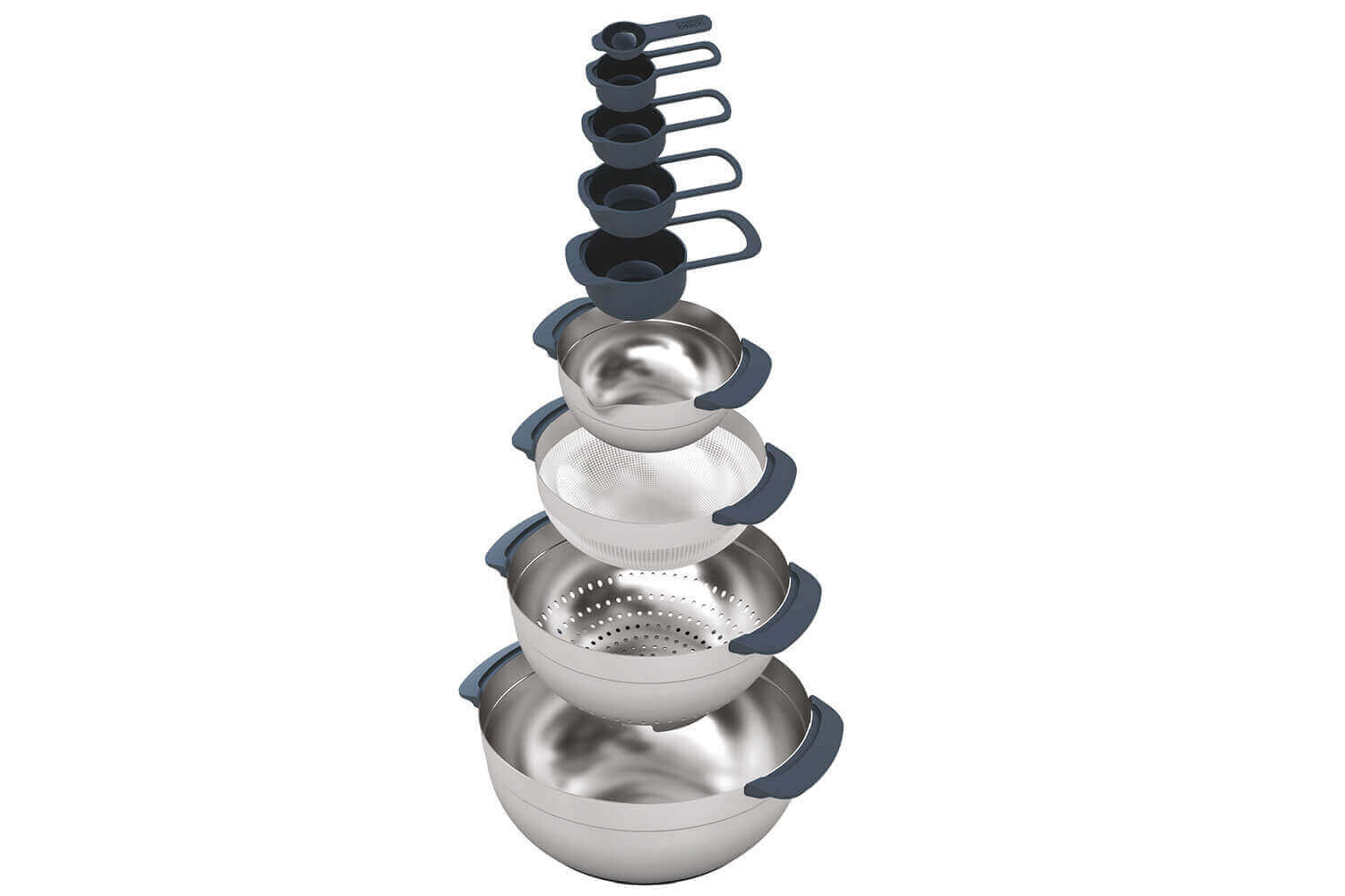 Chaque élément du set est doté de poignées pour en faciliter la manipulation. Ces poignées ainsi que les cuillères doseuses sont en matière synthétique robuste et légère très hygiénique. Les autres bols et passoires sont pour leur part en acier inoxydable 18/8 de haute qualité.