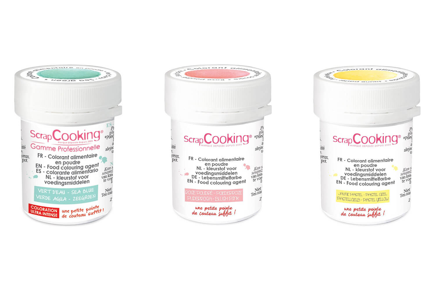 Ces colorants artificiels sont contenus dans des pots de 5g chacun. Sous forme de poudre, ces colorants sont si puissants qu'une pointe de couteau suffit dans votre préparation ! Leur haute qualité leur permet de résister à la lumière et à la cuisson.