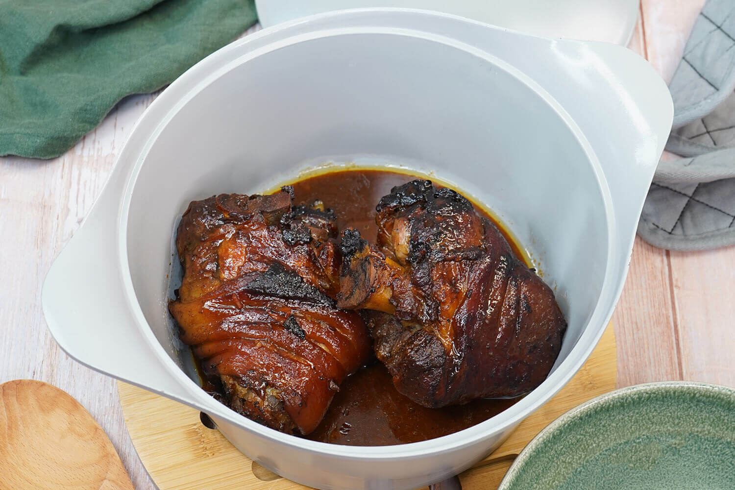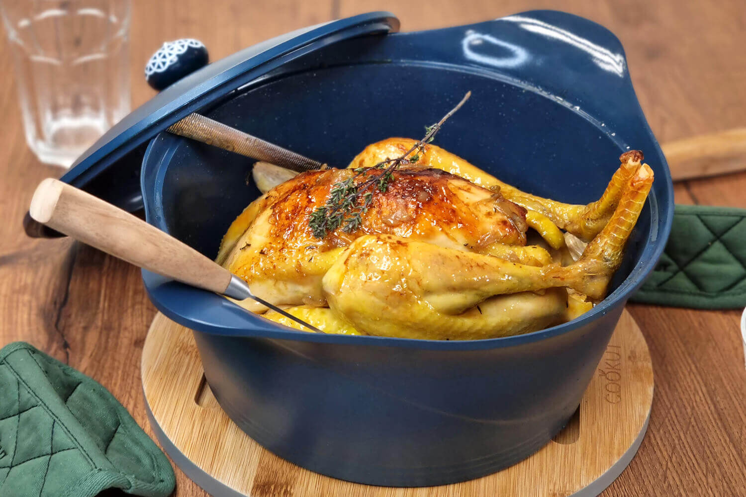 Facile à manipuler grâce à ses deux anses latérales, elle se complète par des maniques en silicone ou en coton pour une utilisation sécurisée. Son couvercle à picots permet l’auto-arrosage des viandes, garantissant des plats tendres et savoureux. Complétez le couvercle avec une poignée pour une manipulation encore plus aisée.
