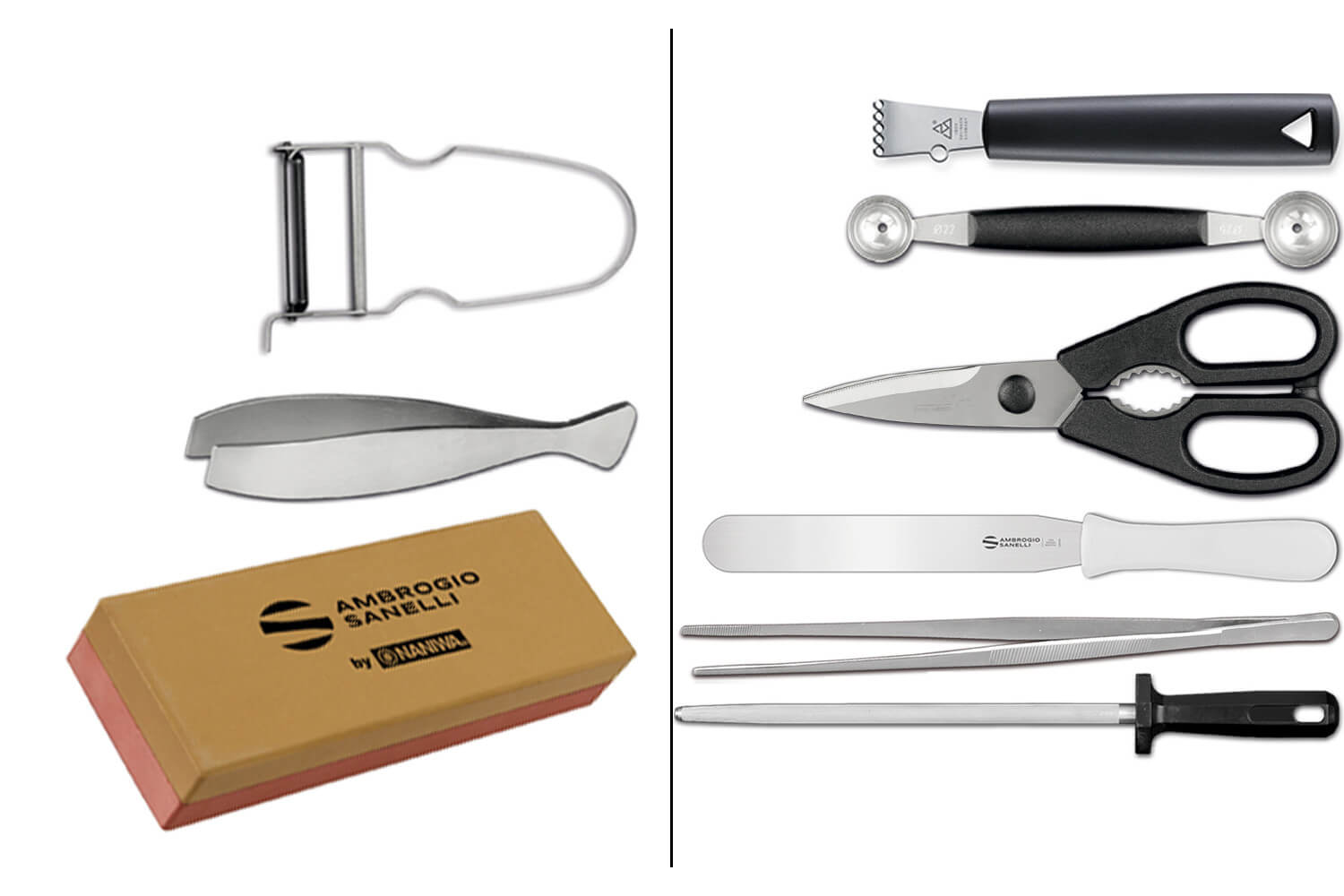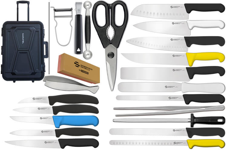 Cette valise Caravel est composée de 13 couteaux de cuisine professionnels Supra de la marque Ambrogio Sanelli et de 9 ustensiles de cuisine :