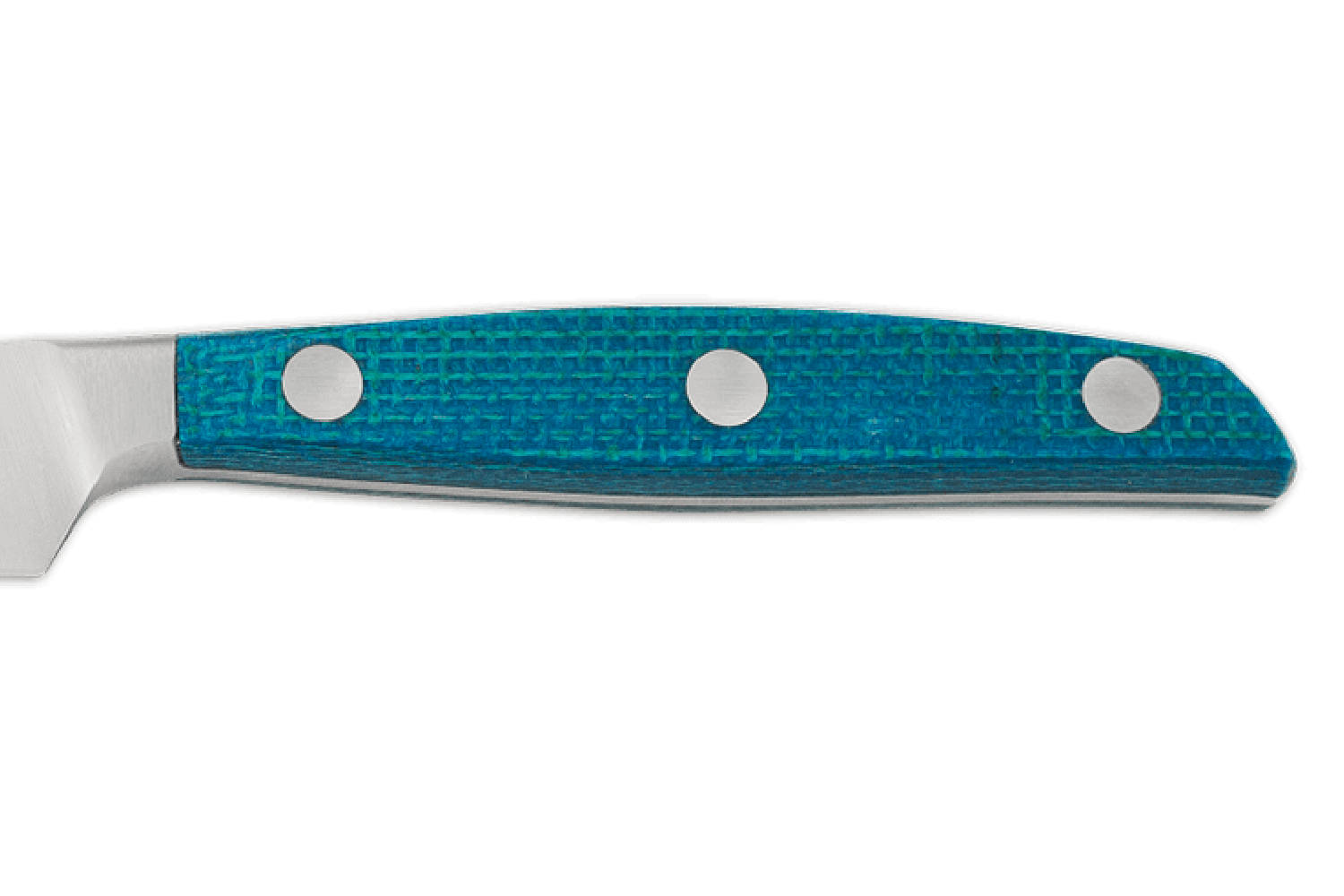Il dispose d'un manche en micarta d'un éclatant bleu turquoise avec des rivets en acier inoxydable. Le micarta est un matériau robuste, résistant aux températures élevées et à l´humidité ambiante.