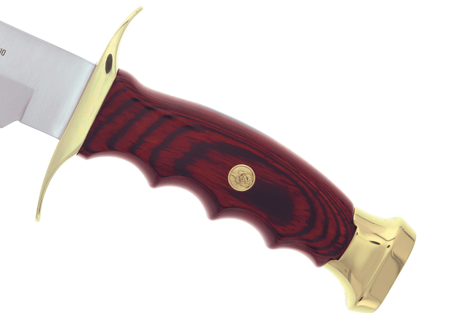 Ce couteau a tout pour plaire. Il possède un joli manche en stamina wood. Il s'agit d'un composite haut de gamme fait d'essence naturelle et peint avec de magnifiques couleurs foncées. De plus, le manche présente une rainure de doigts pour une adhérence parfaite. Cette texture évitera à votre main de glisser pendant l'usage. Notez également qu'une garde de sécurité protège votre index lors d'une découpe intensive.
