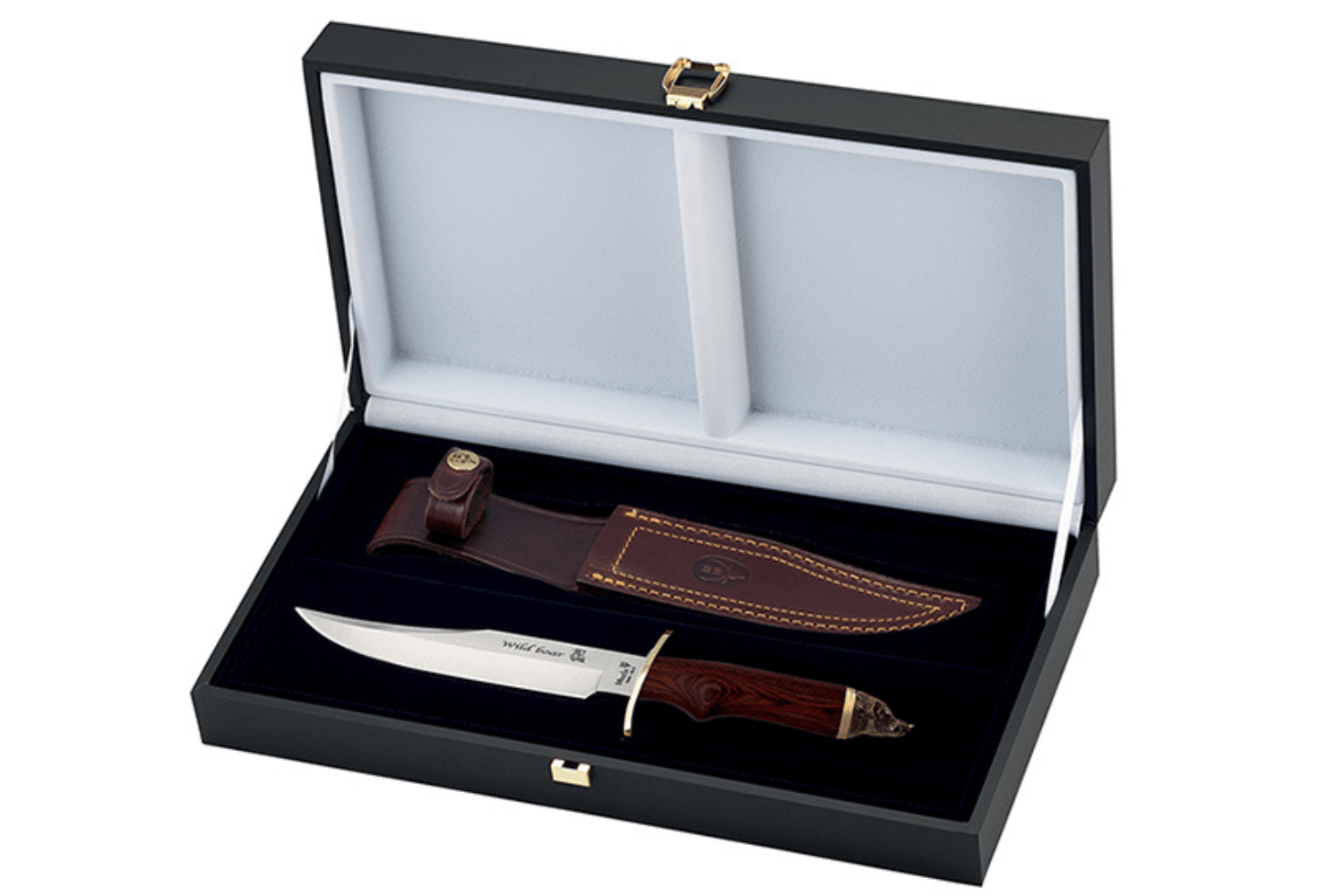 Cerise sur le gâteau, le couteau est livré dans un coffret-cadeau. Vous y trouverez le Muela Wildboar et son étui en cuir indispensable pour le transport lors de vos parties de chasse.