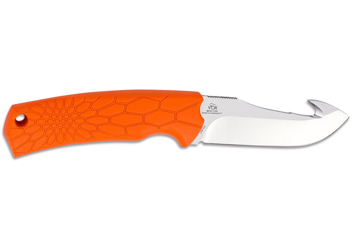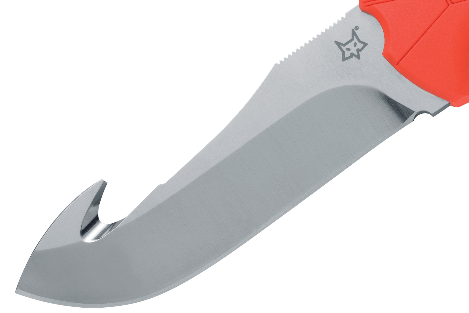 Le Core Orange dispose d'une lame du style guthook (crochet). Ce tranchant est fabriqué en acier inox BECUT. Ce type d'acier allie ténacité, rétention du fil du tranchant et résistance à l'usure. Pour plus de robustesse, votre lame a subi une finition dite en stonewashed.