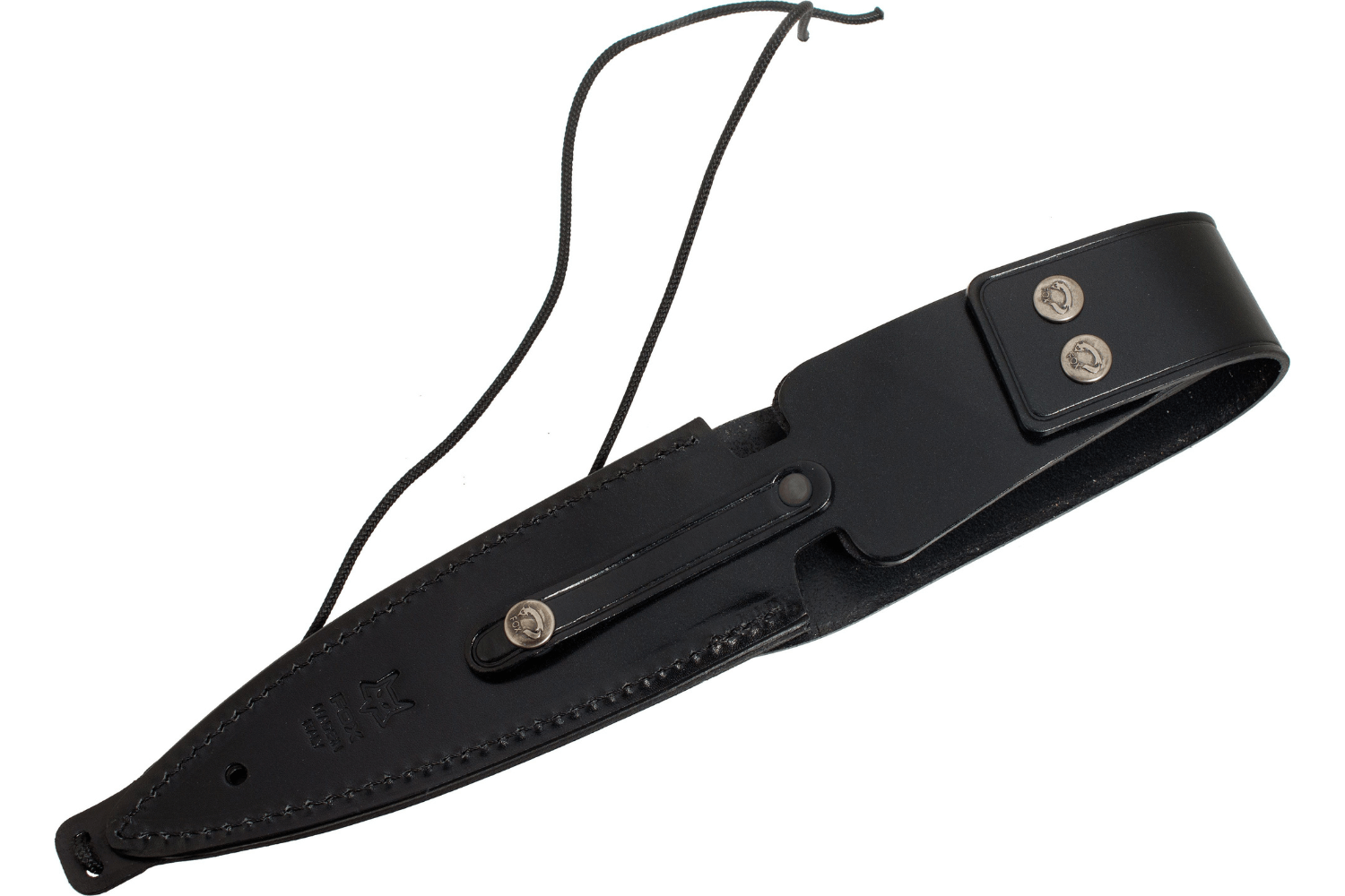 L'outil est livré avec un joli étui en cuir noir compatible MOLLE.