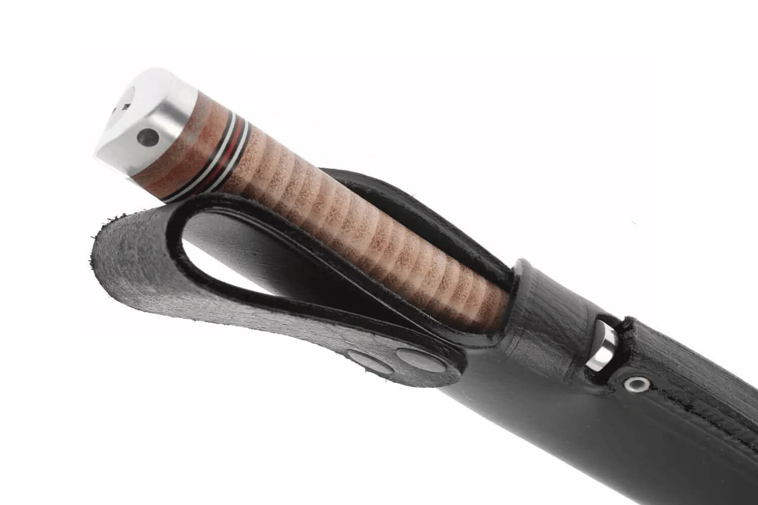 Manche en cuir + pommeau : prise en main sûre et ferme