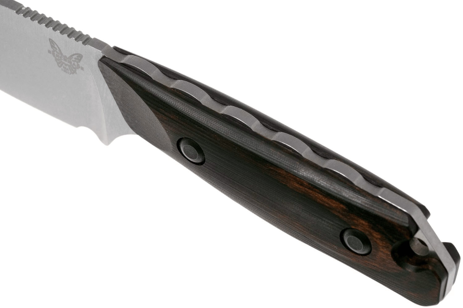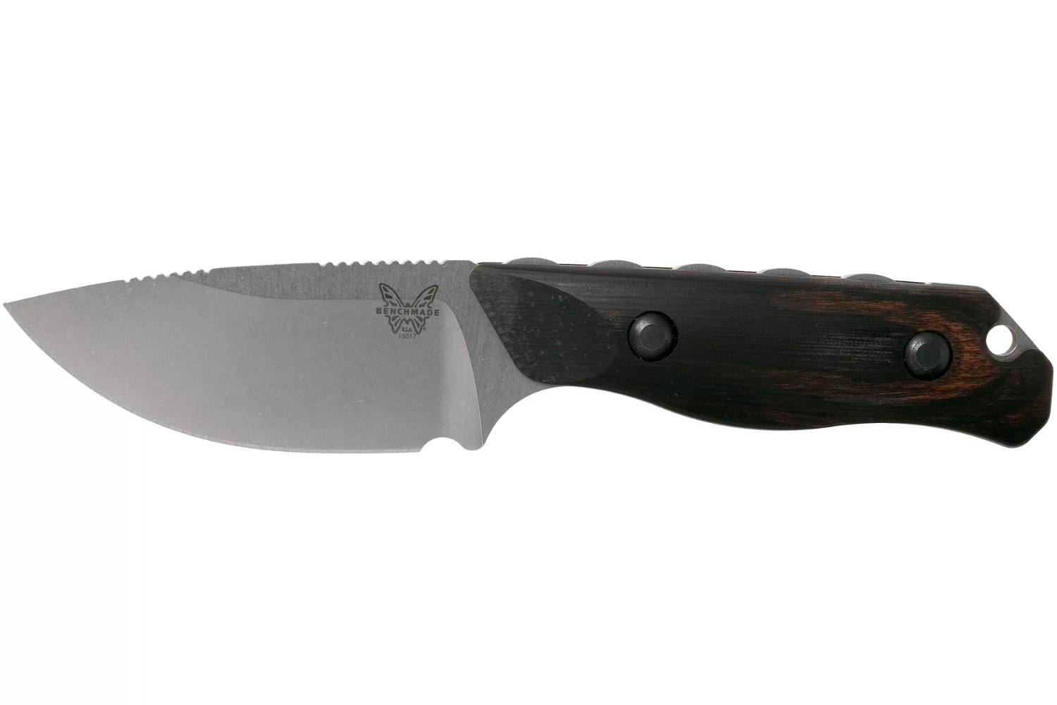 Pour le manche, Benchmade a opté pour du Dymondwood. Ce bois stabilisé est composé de couches de bois imprégnées de résine synthétique. Cela confère au couteau l'apparence chaleureuse du bois tout en lui procurant la robustesse du polymère. De plus, le bois stabilisé est beaucoup plus résistant aux changements de températures, à l'humidité et à l'usure qu'un bois non traité.