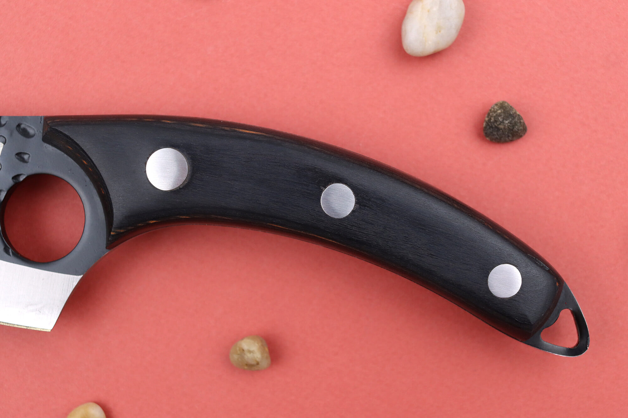 Le manche de ce couteau viking est conçu en bois d'ébène, une essence robuste et durable avec une densité élevée pour une meilleure résistance à l'humidité. Trois rivets permettent d'assurer une solidité accrue.