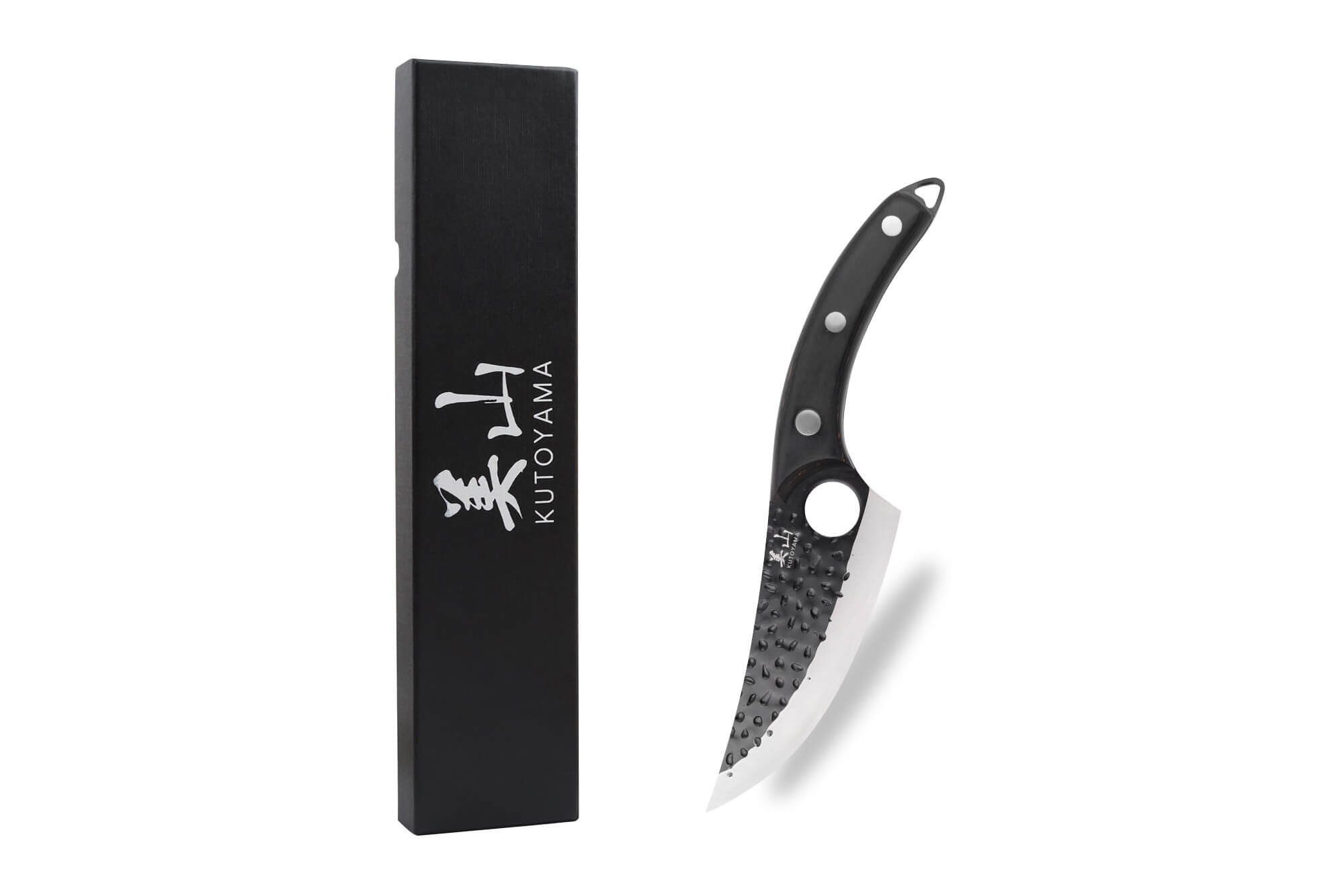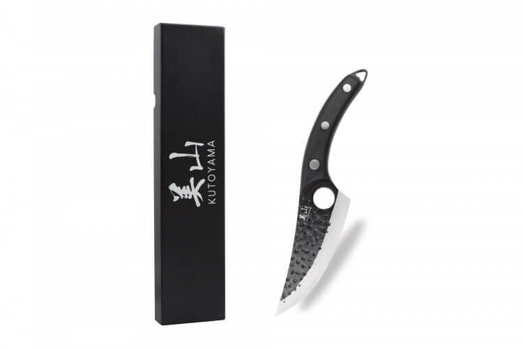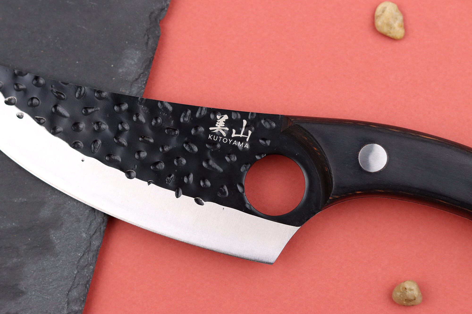 La lame, martelée pour empêcher les aliments d’adhérer lors de la découpe, arbore une teinte noire pour un aspect visuel brut.