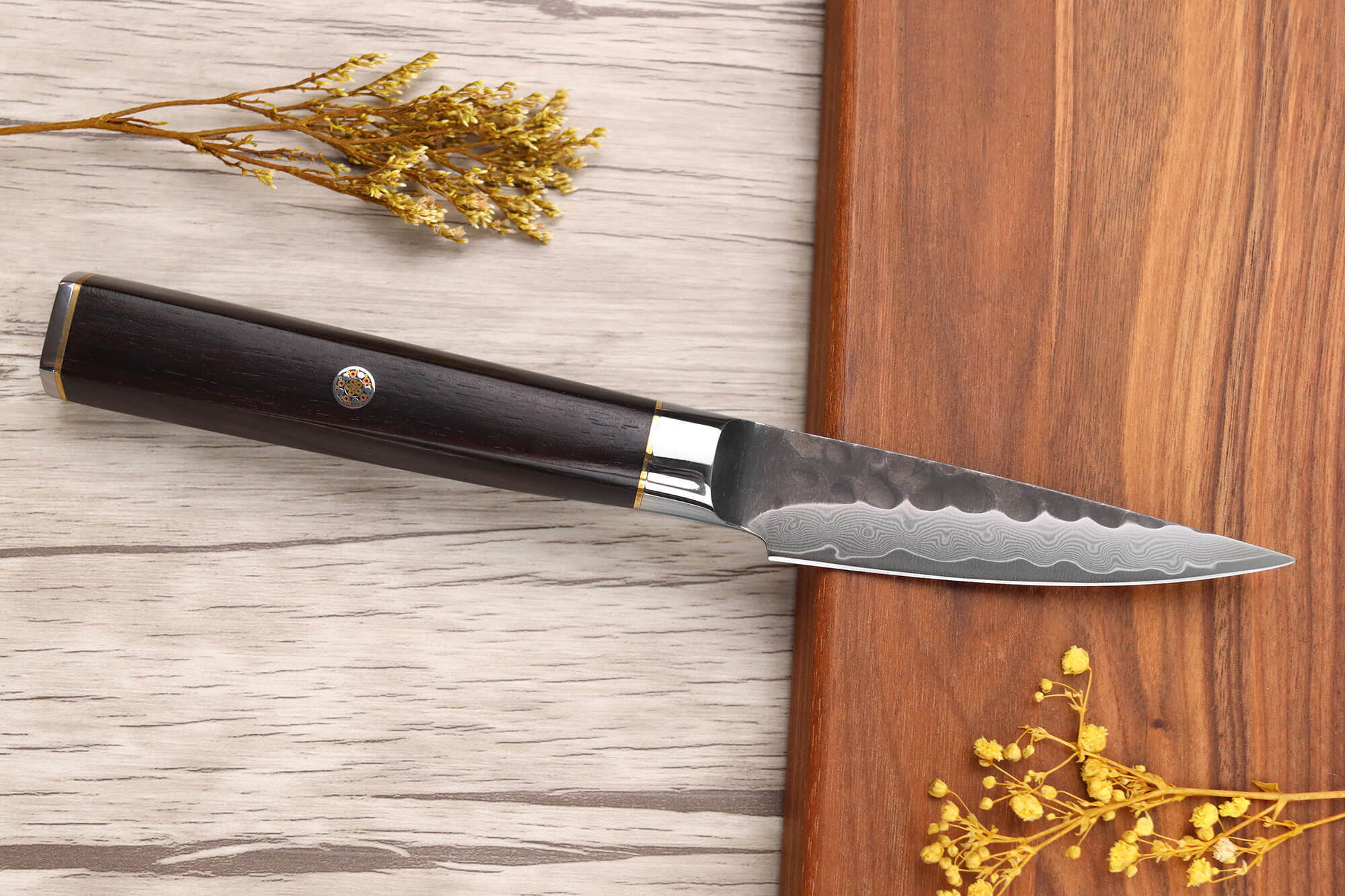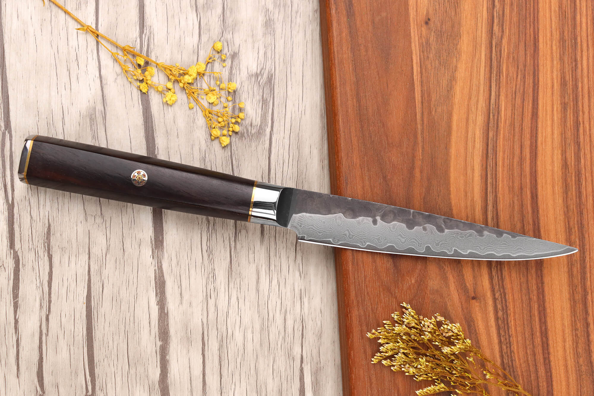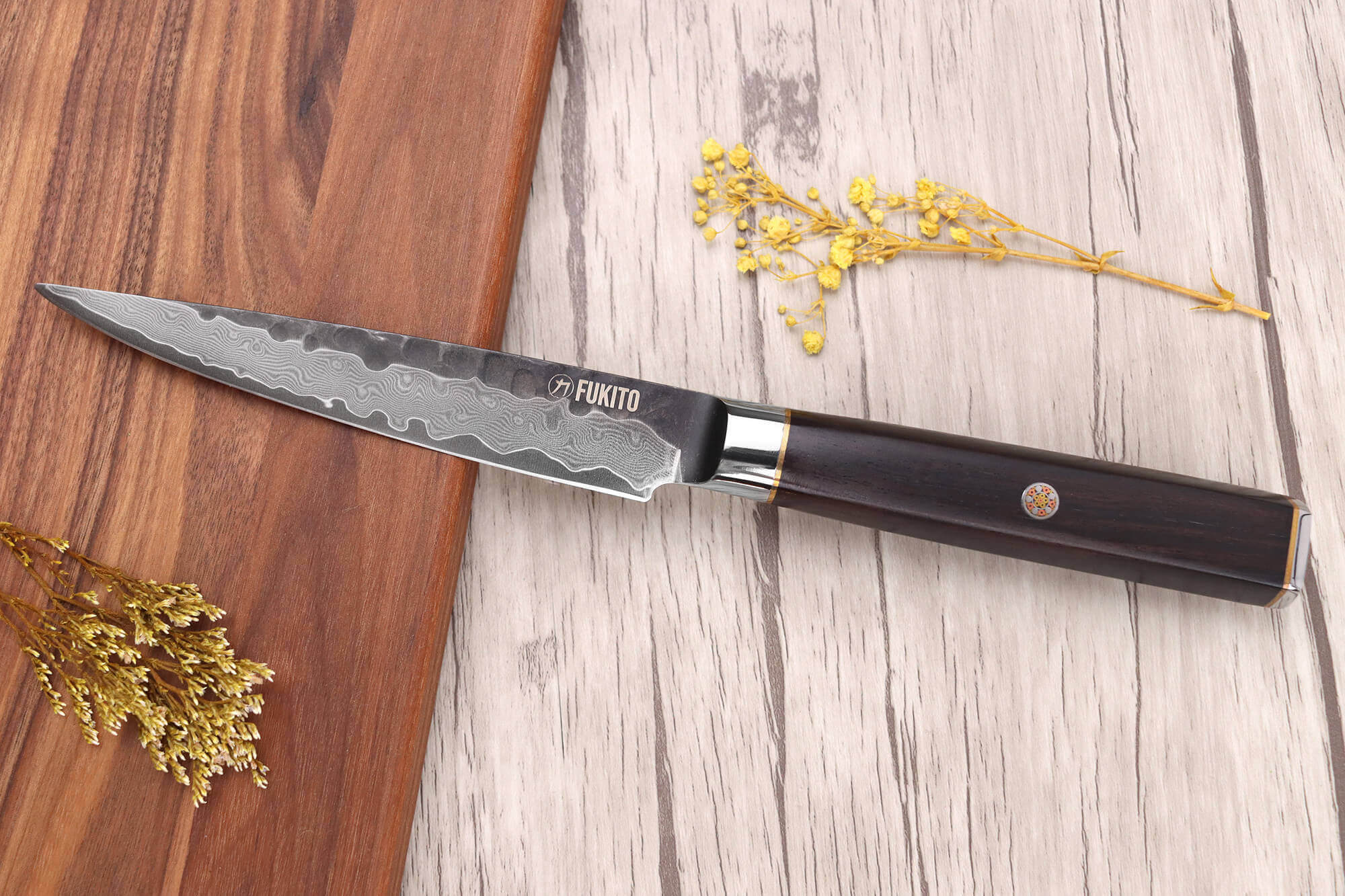 Le noyau de ces couteaux Fukito est en acier japonais VG10, conçu par la réputée Takefu Special Steel. Cet alliage est riche en carbone (d'environ 1%), ce qui augmente sa dureté. Avec une dureté de 60HRC sur l'échelle de Rockwell, ces couteaux offrent une excellente performance de coupe et une grande durabilité du tranchant.
