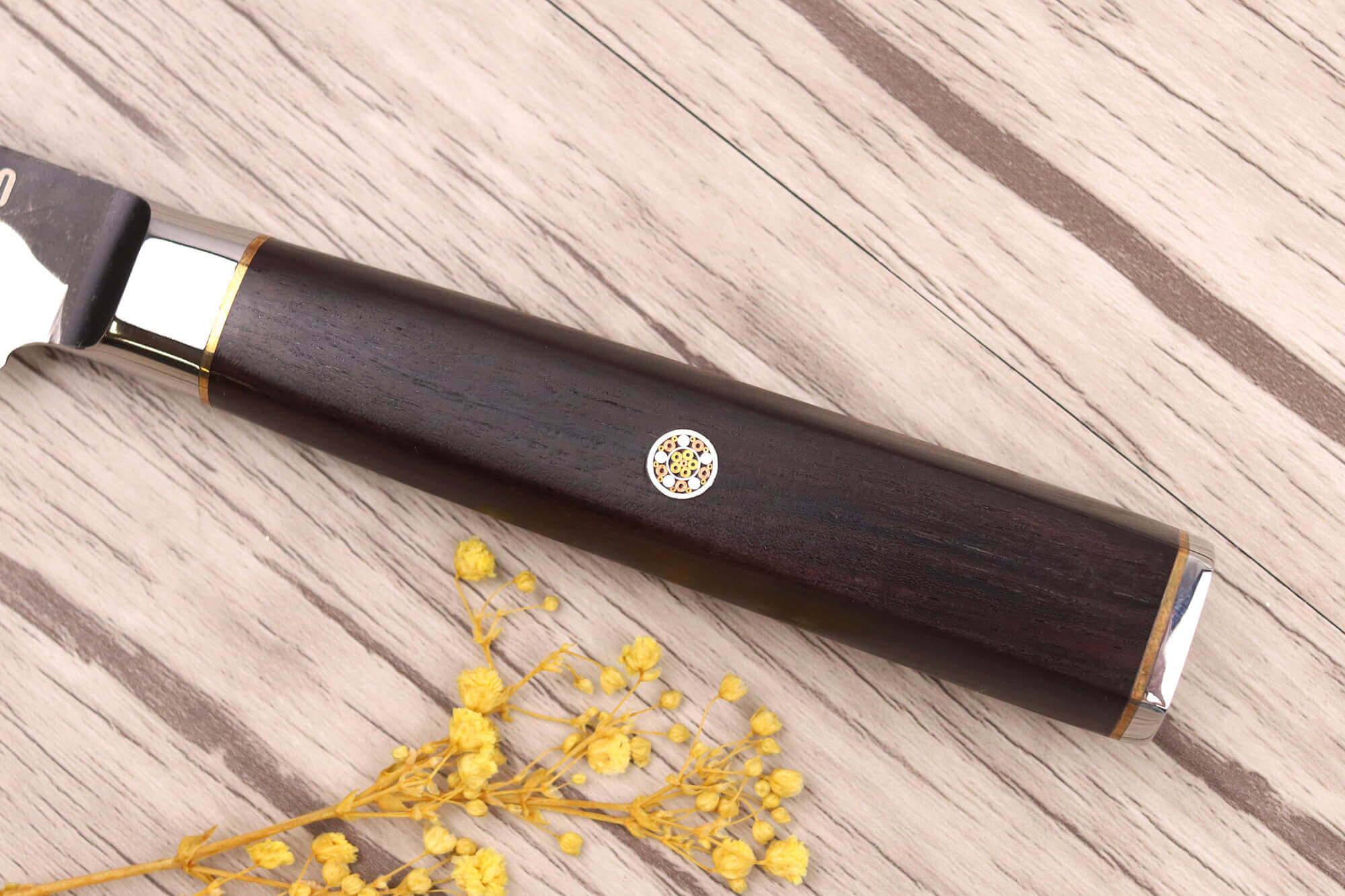 Le manche de ces couteaux est conçu en bois d’ébène, une essence exotique reconnue pour sa robustesse et sa durabilité. Ce bois dense offre une excellente résistance à l'humidité et aux déformations. Sa teinte sombre et son veinage naturel apportent une touche d'élégance distinctive à chaque couteau Fukito.