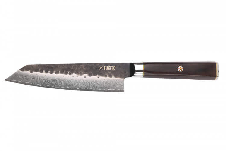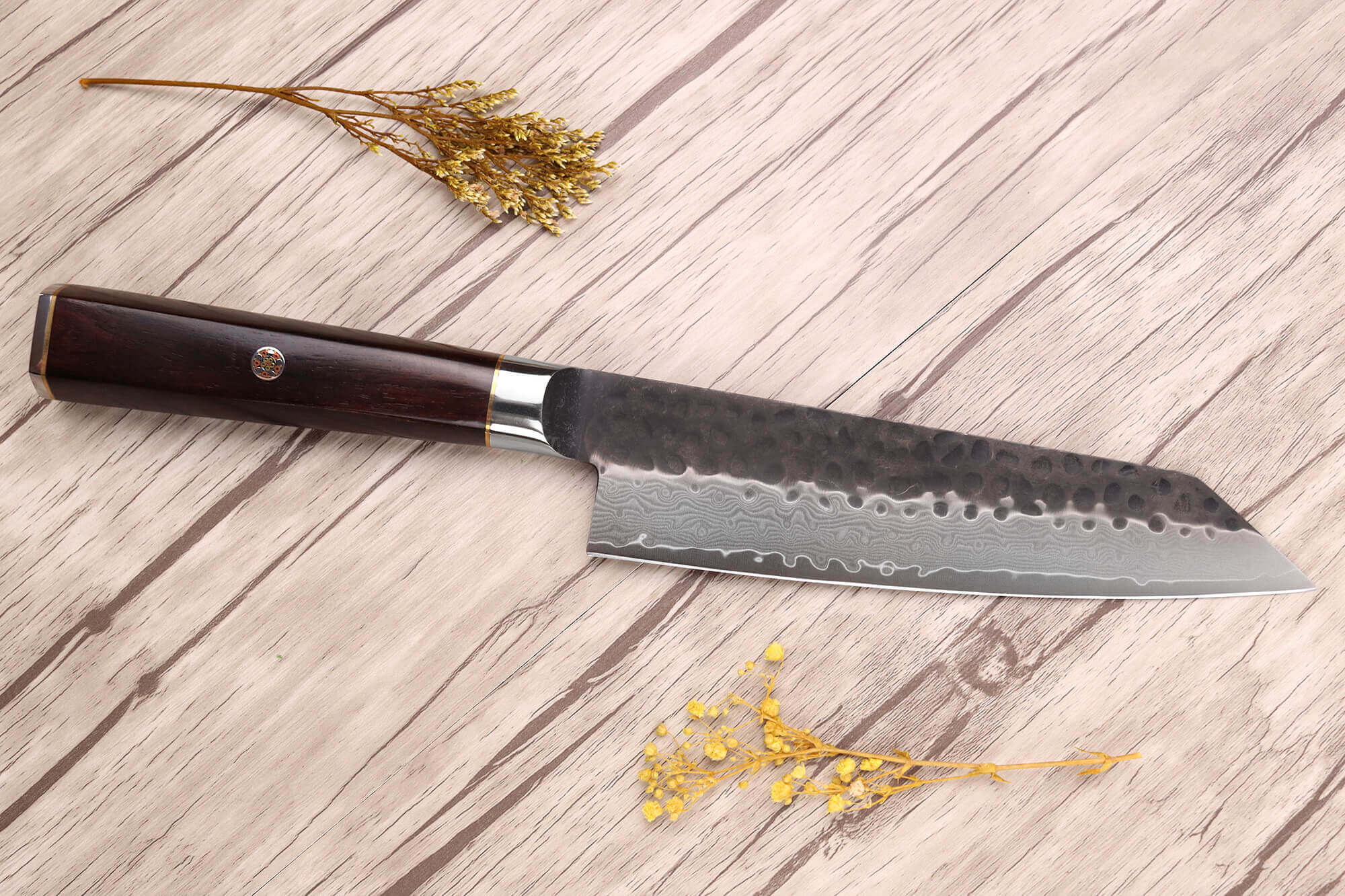 De plus, la surface de la lame de votre kiritsuke a été martelée, ce qui lui donne du caractère. Ce martelage n’est pas seulement décoratif, il empêche aussi les aliments de coller à la lame lors de la découpe, améliorant ainsi l’efficacité en cuisine.