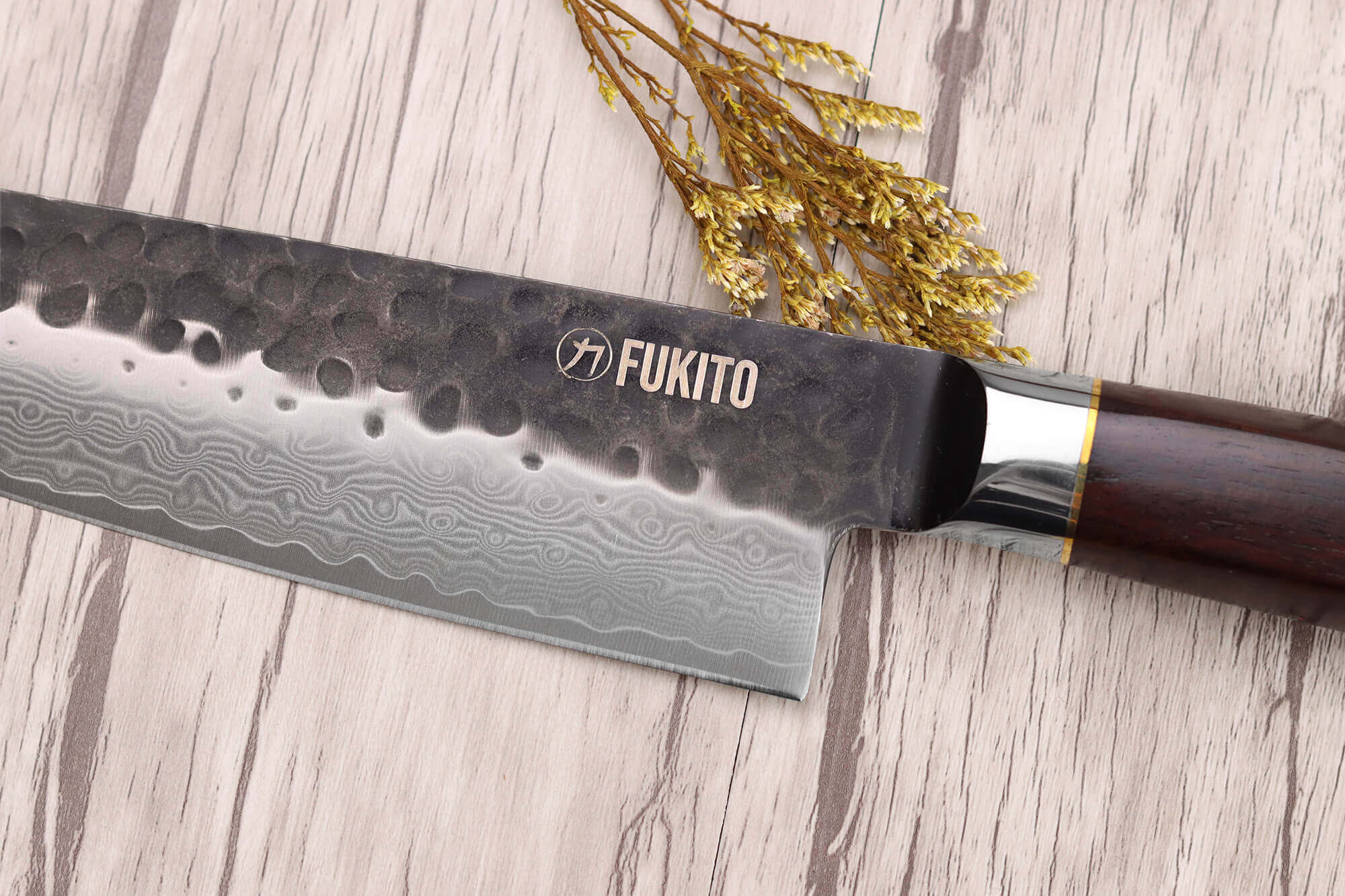 La lame de ce couteau Fukito est conçue avec une structure en acier damassé, une technique qui consiste à forger un noyau en acier rigide, ensuite recouvert de multiples couches d’acier plus souple. Ce procédé protège le cœur de la lame tout en équilibrant sa dureté, offrant ainsi une résistance optimale !