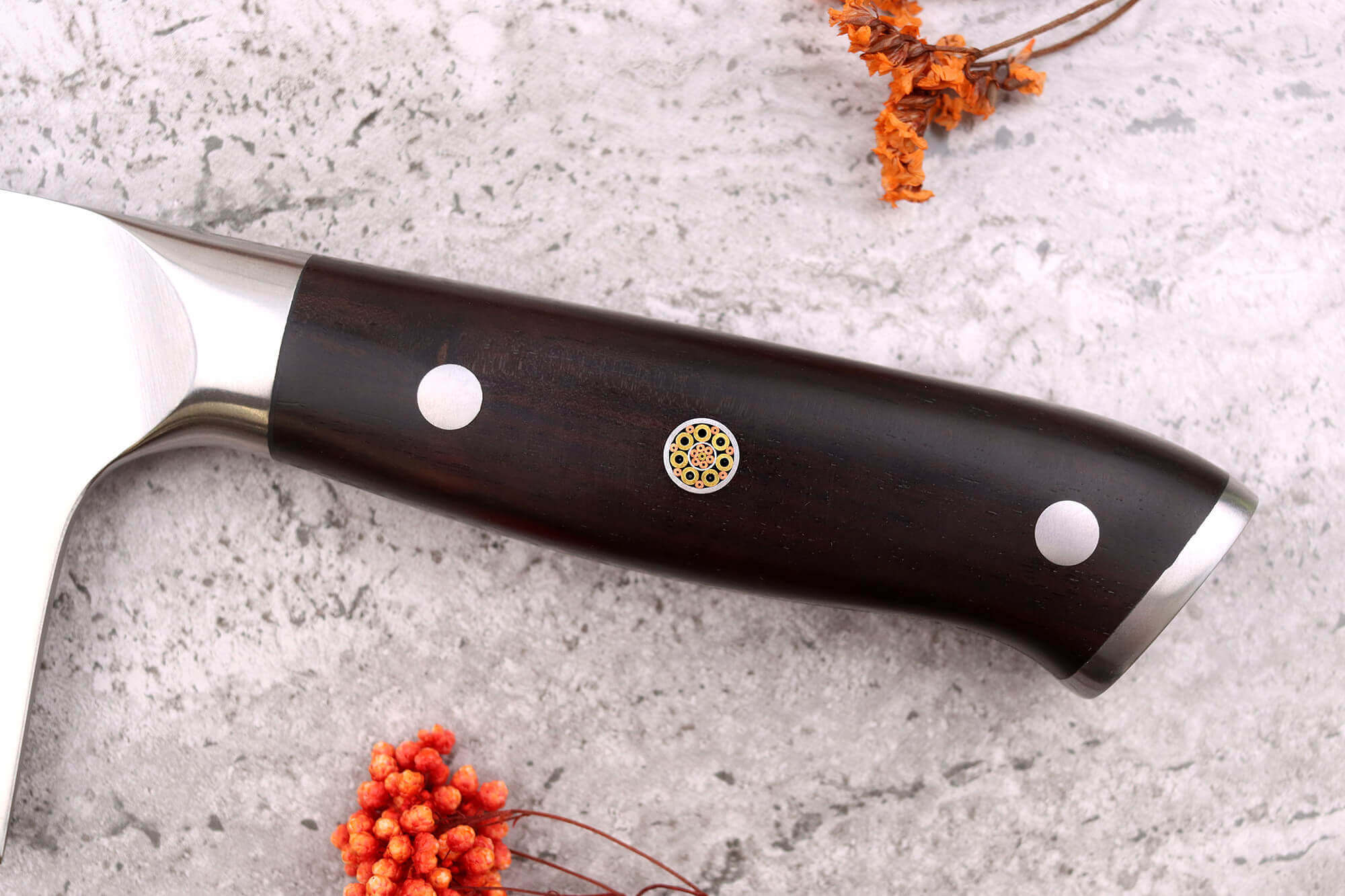 La lame de ce couteau de cuisine est fabriquée en acier inoxydable allemand 1.4116, comparable au X50CrMov15. Cet alliage, enrichi à environ 15% de chrome, offre une excellente résistance à la corrosion, ce qui le rend idéal pour une utilisation en cuisine.