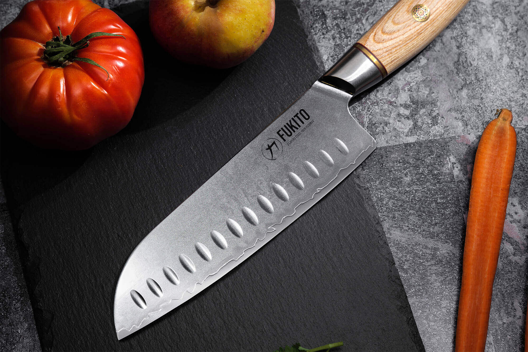 Ce couteau santoku Fukito Pakka San Mai est un modèle ultra polyvalent puisqu'il vous permet de découper les légumes, ou bien la viande, ou encore les herbes fraîches ! Il agit comme un couteau de chef. Sa lame alvéolée permet de rendre la surface de coupe moins adhérente. En effet, des micro bulles d'air se créent entre l'aliment et la lame, au creux des alvéoles, pour que les aliments collent moins à l'acier.