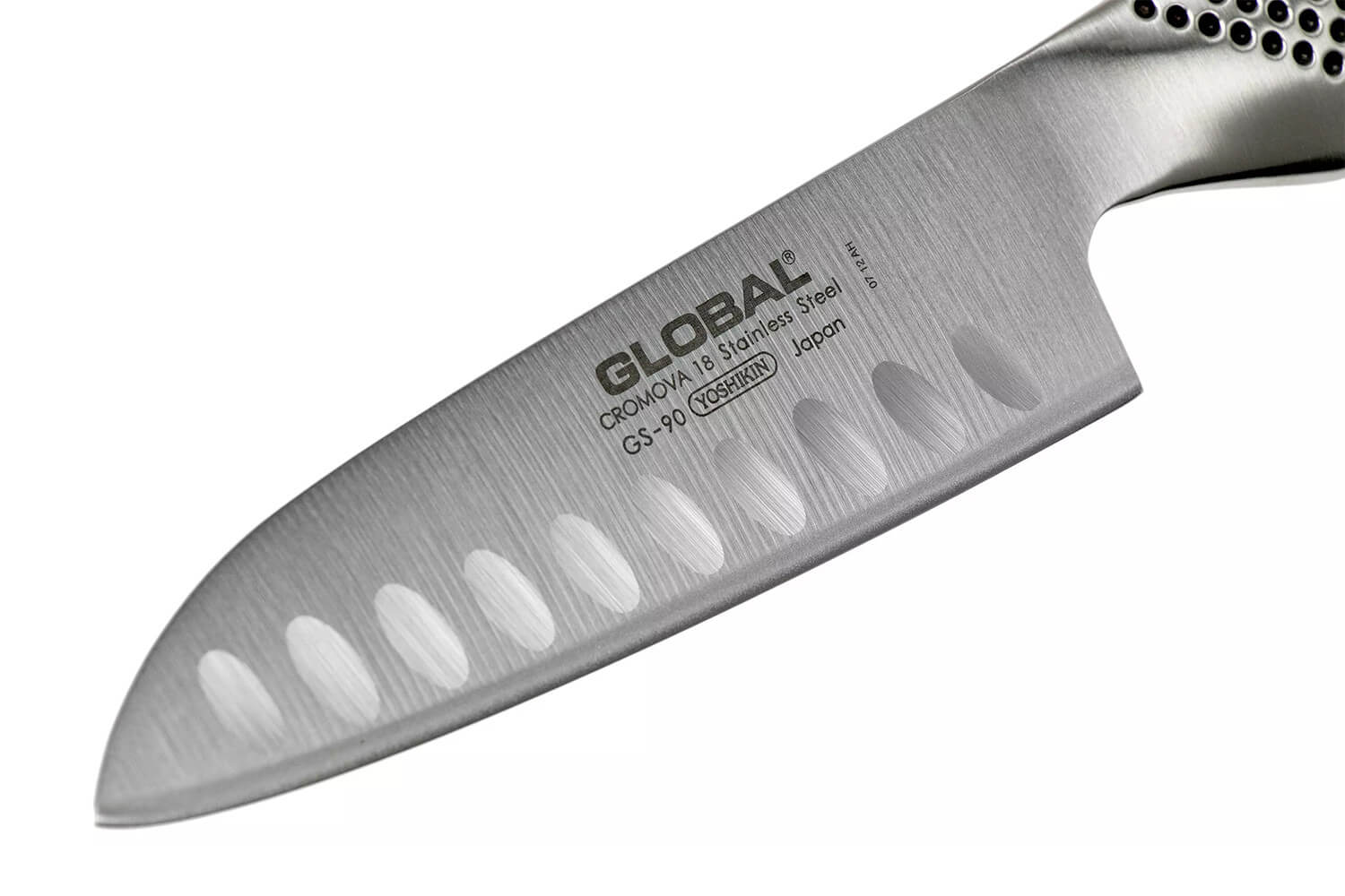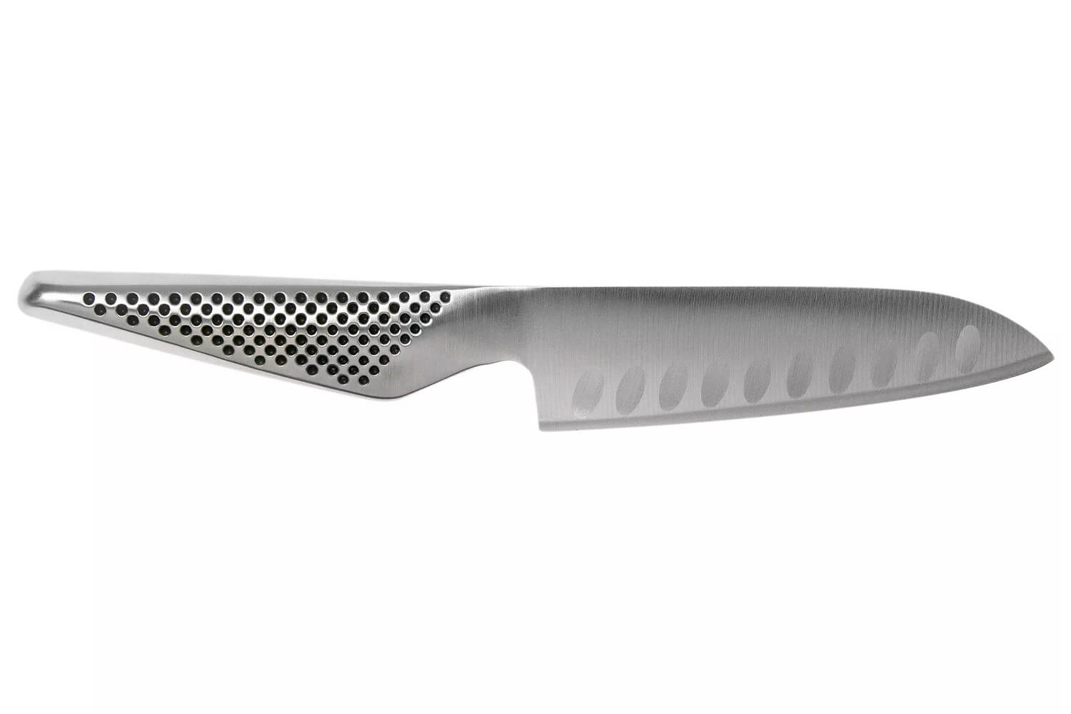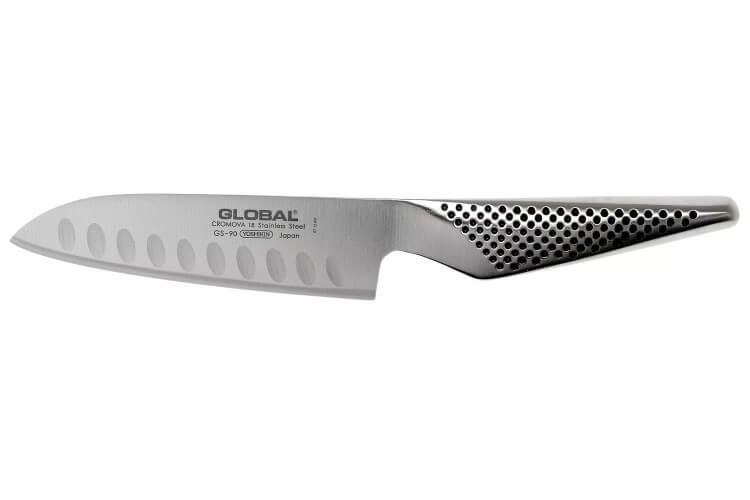 Le couteau santoku Global GS90 est la nouvelle version du GS37 : la seule différence se trouve au niveau des alvéoles qui sont légèrement inclinées à la verticale pour améliorer l'anti-adhérence.