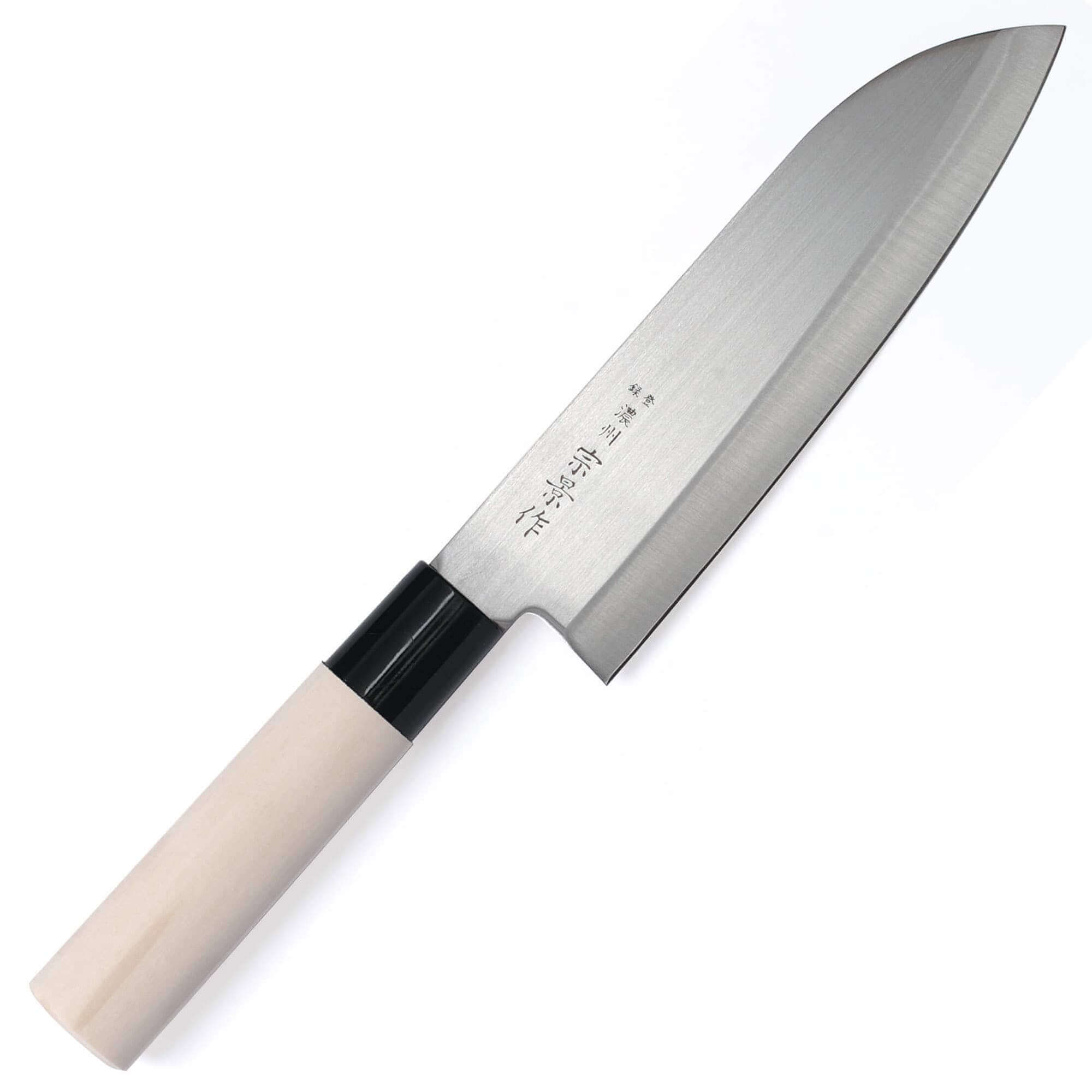 Le manche des couteaux est en bois d'honoki non traité, qui a été emboité sur la lame, puis complété par une virole en polymère noir. Le manche est monté en emboitement par fixation avec clavette en bambou, et non cimenté. En raison des normes d'hygiènes européennes, ces couteaux ne pourront pas être utilisés en milieu professionnel, car les aliments pourraient s'insérer dans l'espace non-cimenté.