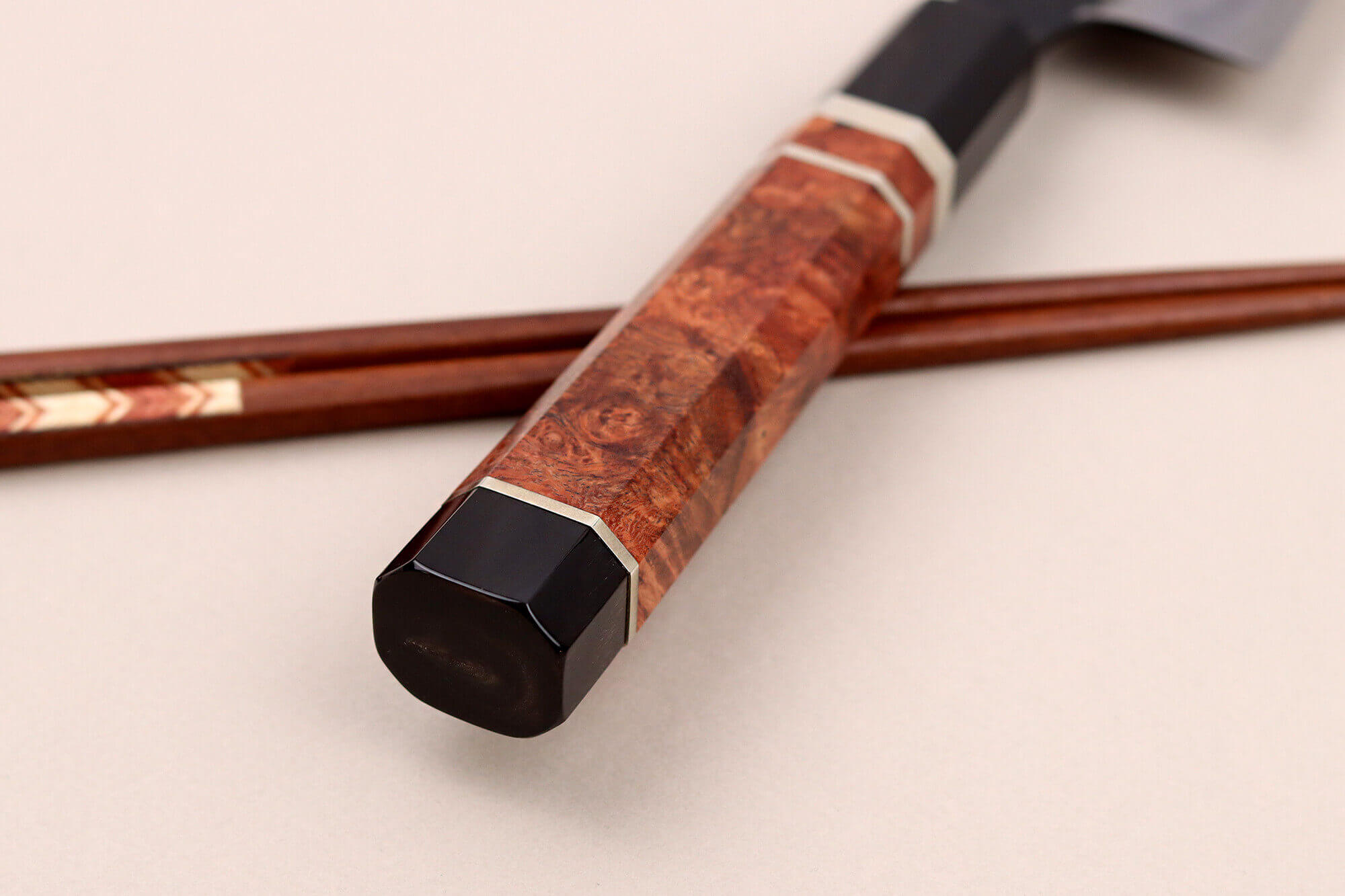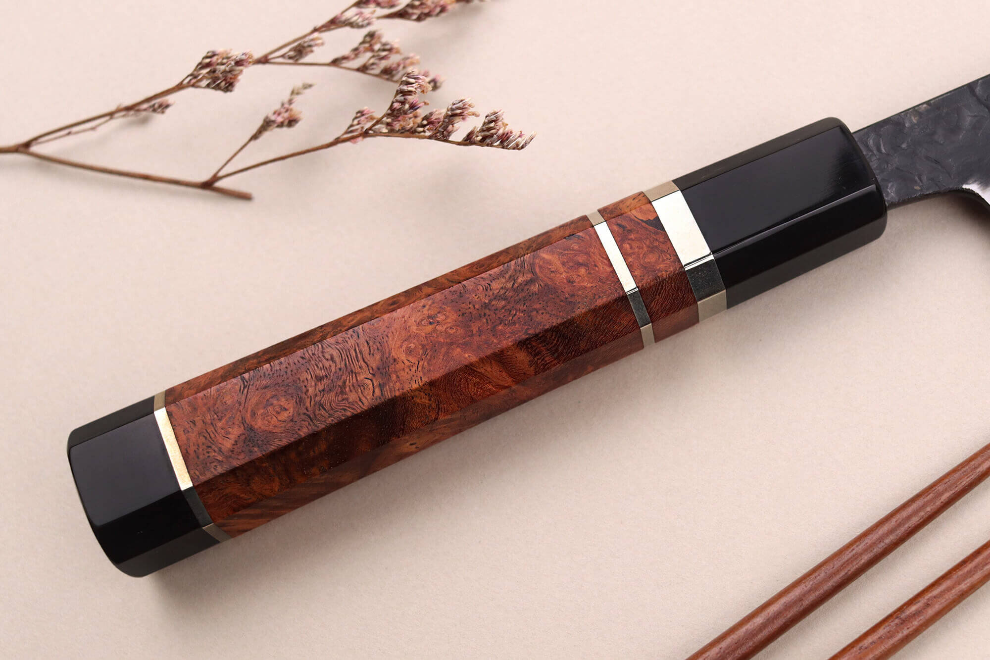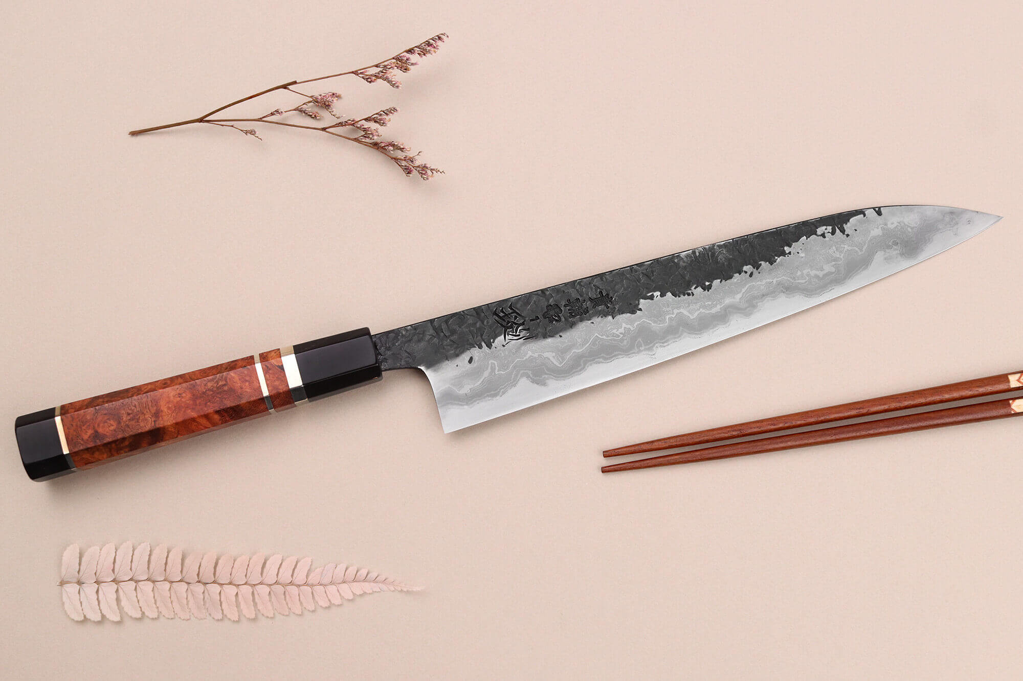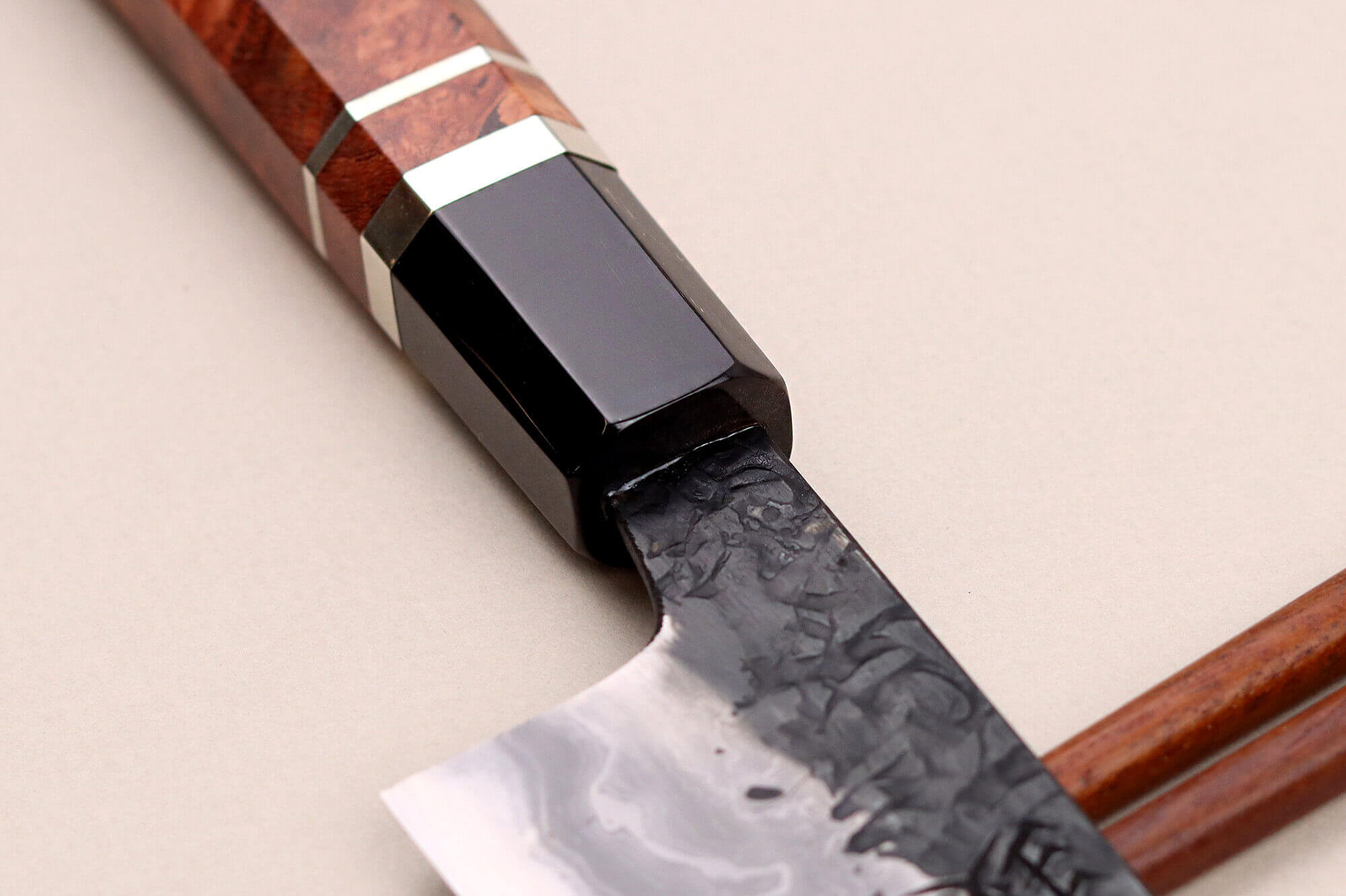 Le damas de cette lame a été entièrement façonné à la main par l'artisan Kisuke Manaka, un expert dans l'art du laminage. Pour réaliser ce motif unique, il utilise la technique du Warikomi, un processus complexe qui exige une grande précision. L'acier souple est chauffé à haute température, fendu pour y insérer une barre d'acier dur, puis soudé avec une poudre spéciale. Ce processus traditionnel, que Manaka-san maîtrise parfaitement, est long et minutieux.