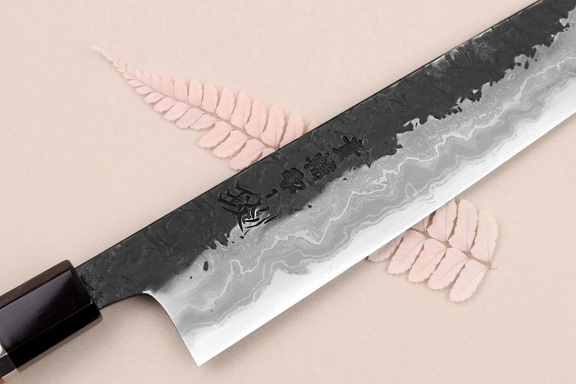 Cette lame arbore une finition brute de forge, lui conférant un aspect sombre et authentique, caractéristique de l'artisanat traditionnel japonais. La lame, avec ses motifs de martelage variés, renforce encore cet aspect artisanal. Enfin, des kanjis gravés à la main par Manaka-san apportent une touche personnalisée et unique à ce couteau damassé.