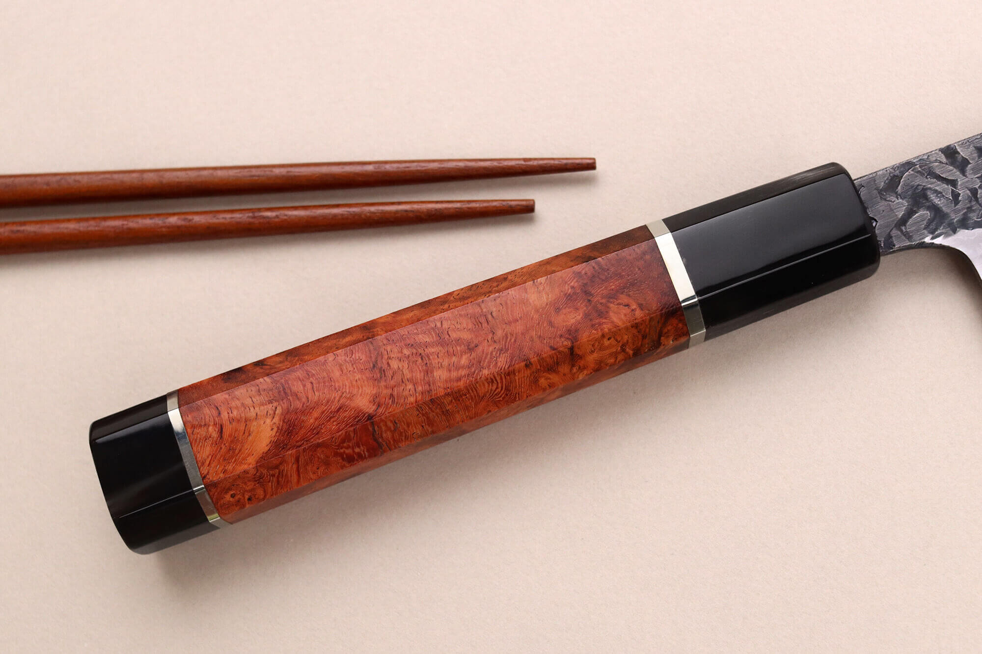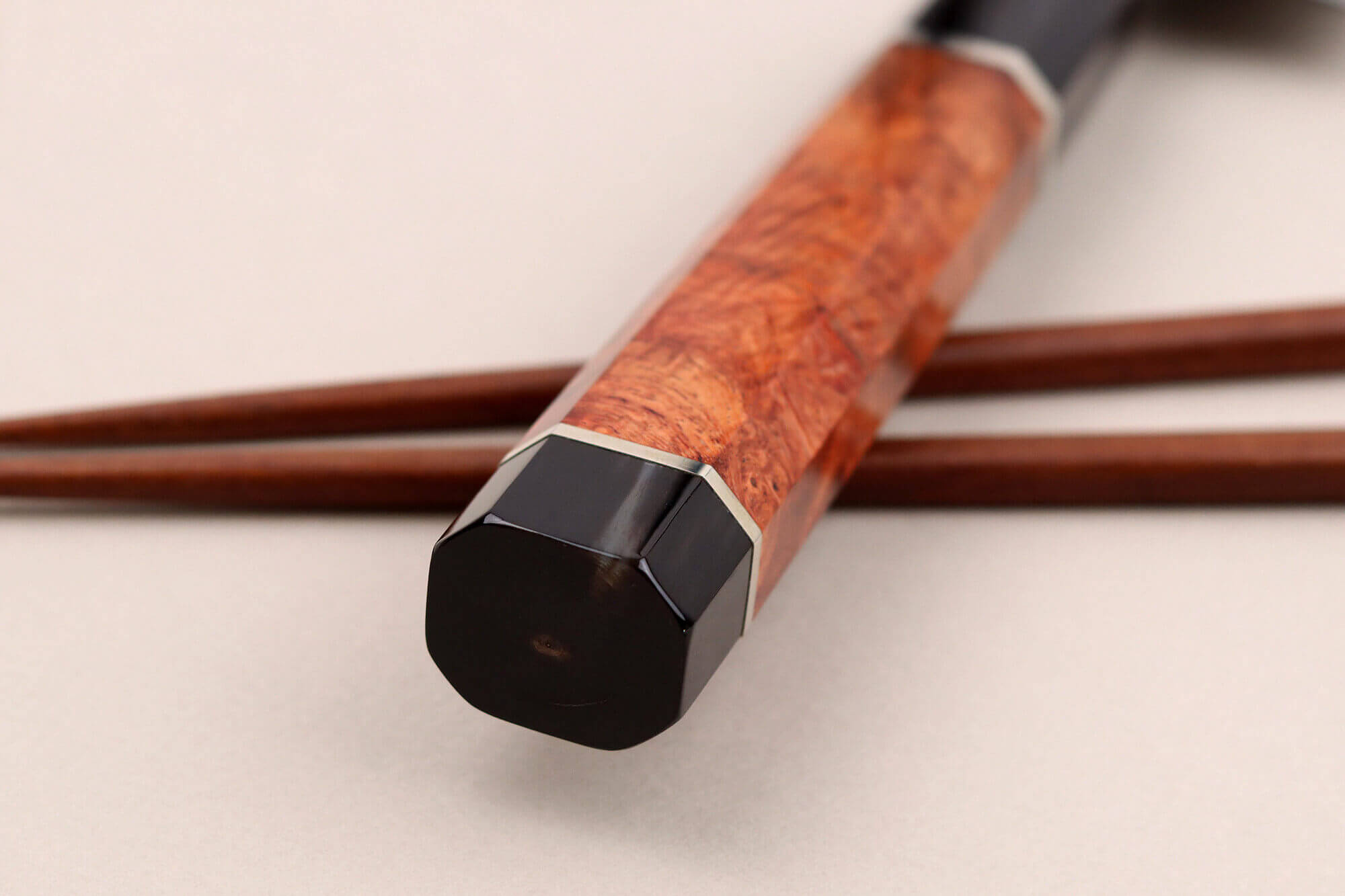 Votre couteau sujihiki japonais dispose d'un manche fabriqué en bois de cognassier, une essence durable avec une résistance aux variations de températures. C'est un bois apprécié pour ses nuances chaudes et son visuel chaleureux, ainsi que pour son élégant veinage. Le bois étant un matériau vivant, chaque manche est unique !