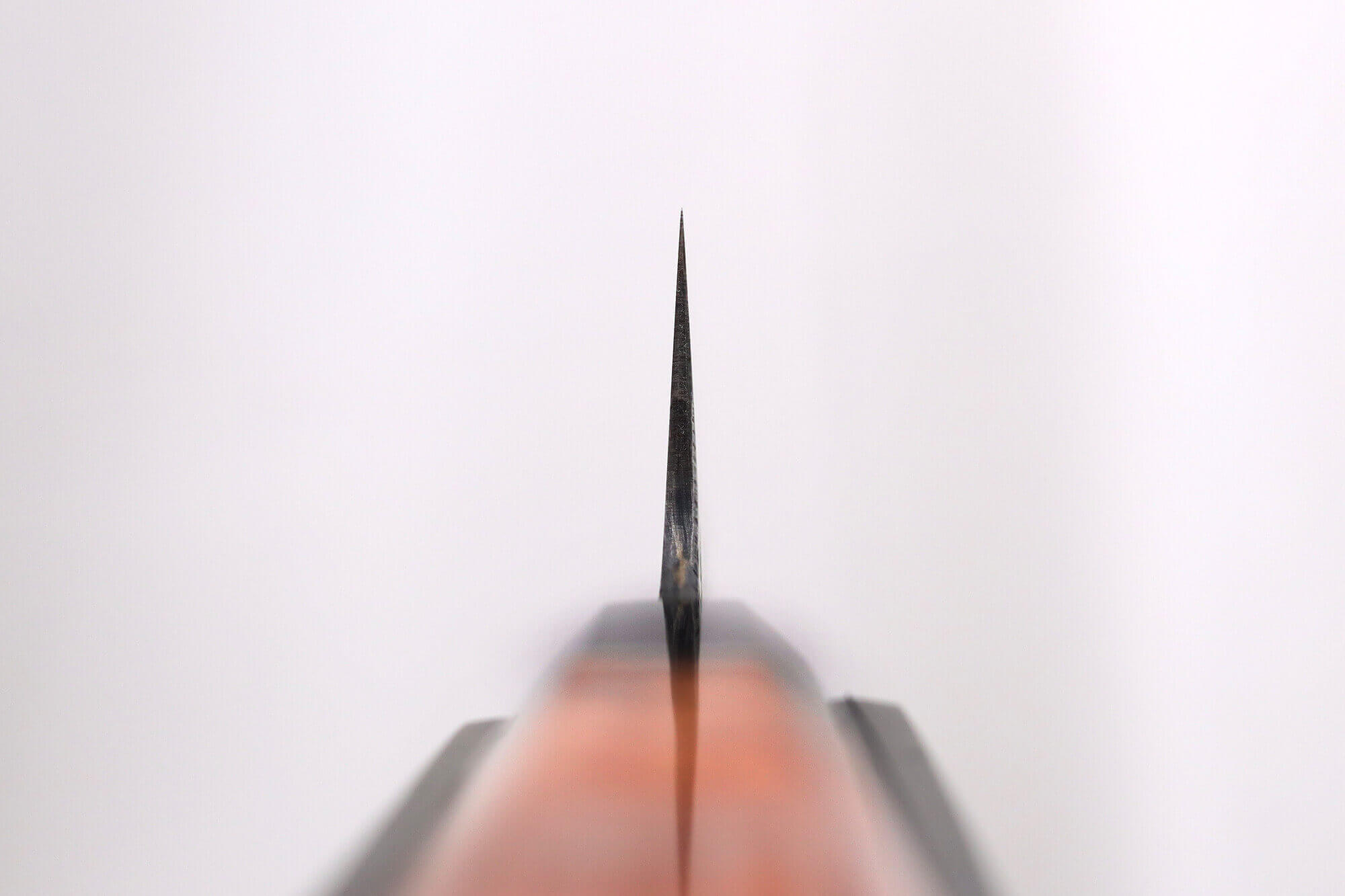 L'acier Aogami #1 est composé d'une haute teneur en carbone atteignant environ 1,3%. Cet élément-clé permet d'augmenter la dureté d'un acier, sachant que plus une dureté est élevée, plus il dispose d'une meilleure efficacité de coupe. Sur l'échelle de Rockwell, sa dureté est de 63HRC : vous bénéficiez d'un fil de coupe performant et d'une excellente rétention du tranchant !