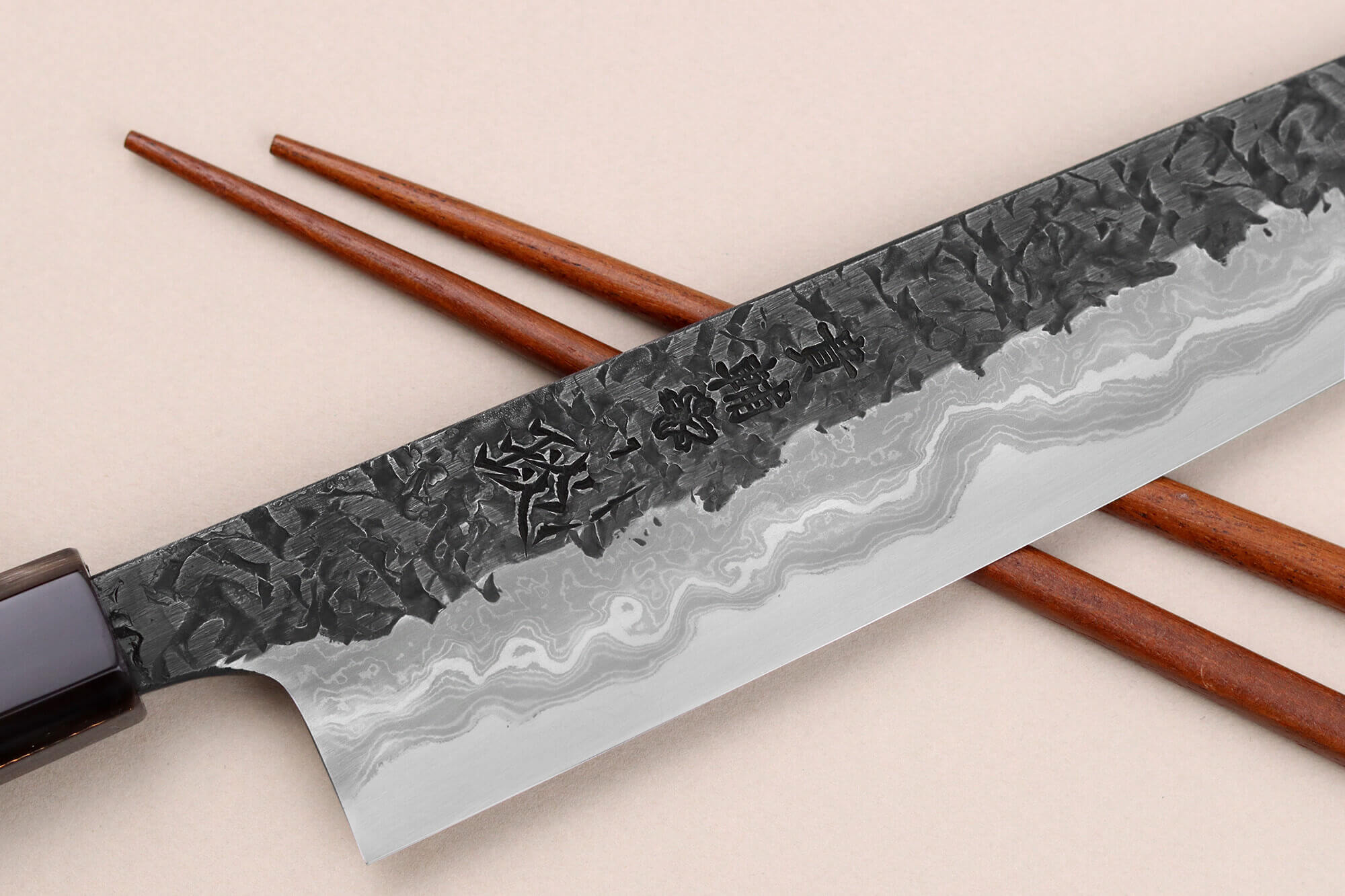La surface de cette lame présente une finition brute de forge qui offre un aspect sombre à votre couteau de cuisine japonais. Cette finition traditionnelle donne du caractère à votre couteau japonais car sa lame n'a pas été polie. De plus, cette lame a été martelée avec divers motifs pour ajouter plus d'authenticité. Aussi, des kanjis ont été gravés à la main par l'artisan Manaka.
