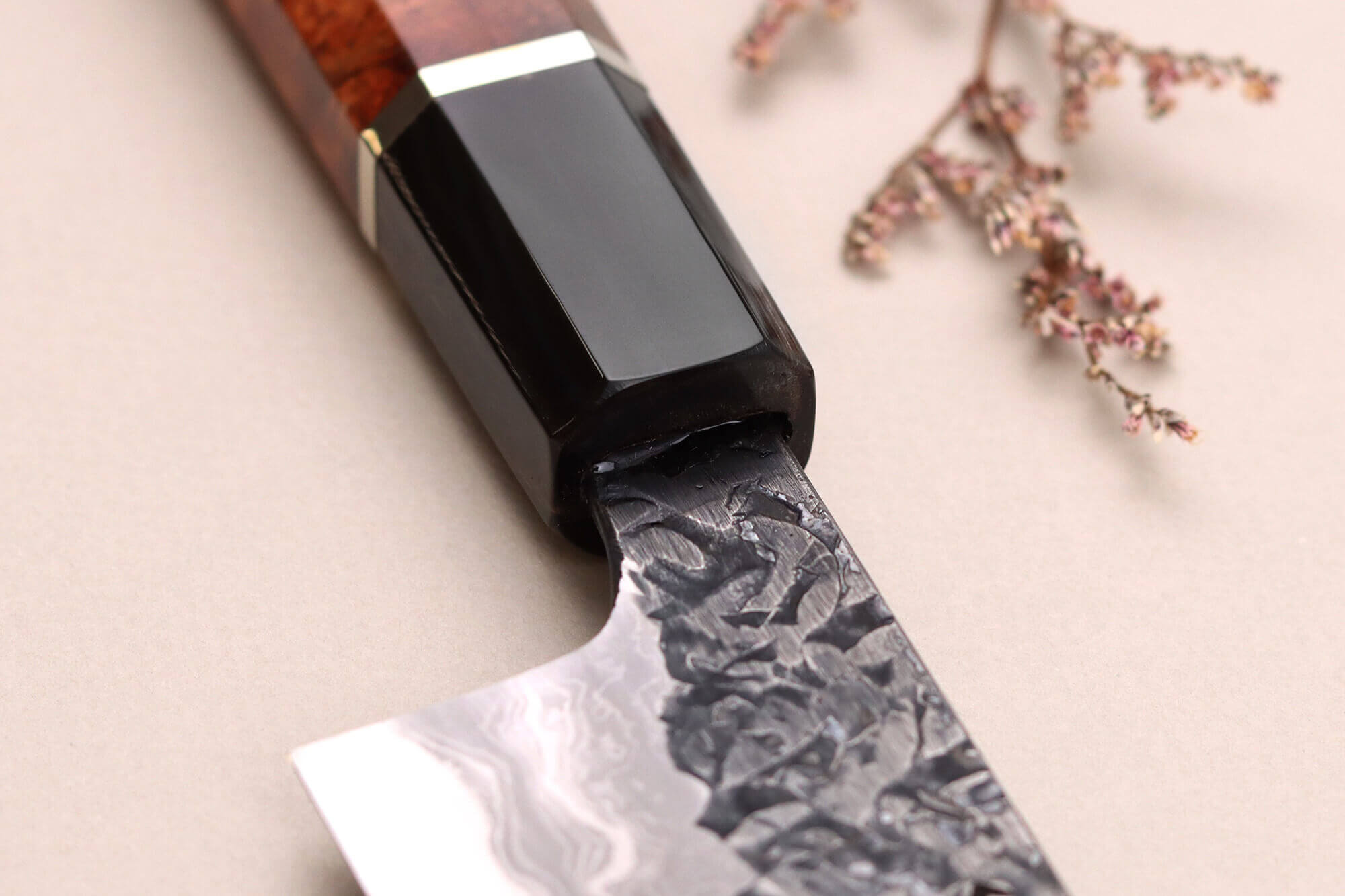 Le damas de cette lame a été réalisé entièrement à la main par l'artisan Kisuke Manaka, qui maîtrise le laminage du damas à la perfection. Pour forger son damas, il utilise le processus Warikomi qui nécessite une grande précision : un acier souple est chauffé à haute température, puis il est fendu pour y insérer une barre d'acier rigide avec une poudre spéciale, les matériaux sont ensuite soudés ensemble. Ce procédé demande beaucoup de temps, Manaka san n'utilise que des techniques traditionnelles pour forger ses couteaux artisanaux !