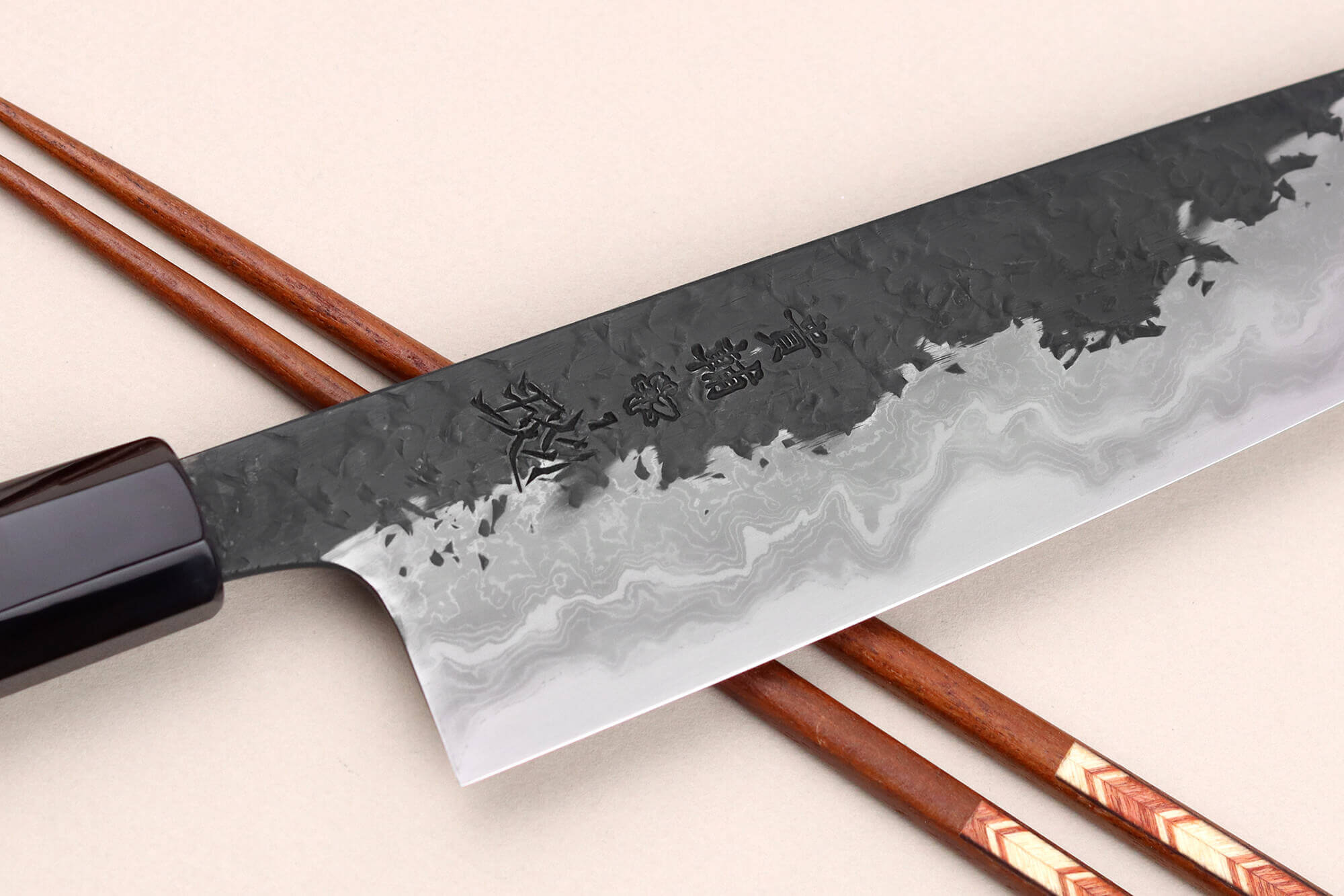 Le damas ne se limite pas à un aspect fonctionnel, il offre également un véritable attrait esthétique ! La superposition des différentes couches d'acier est visible sur toute la partie inférieure de la lame, créant de délicates vagues aux motifs aléatoires. Chaque couteau Kisuke Manaka présente ainsi un motif unique !