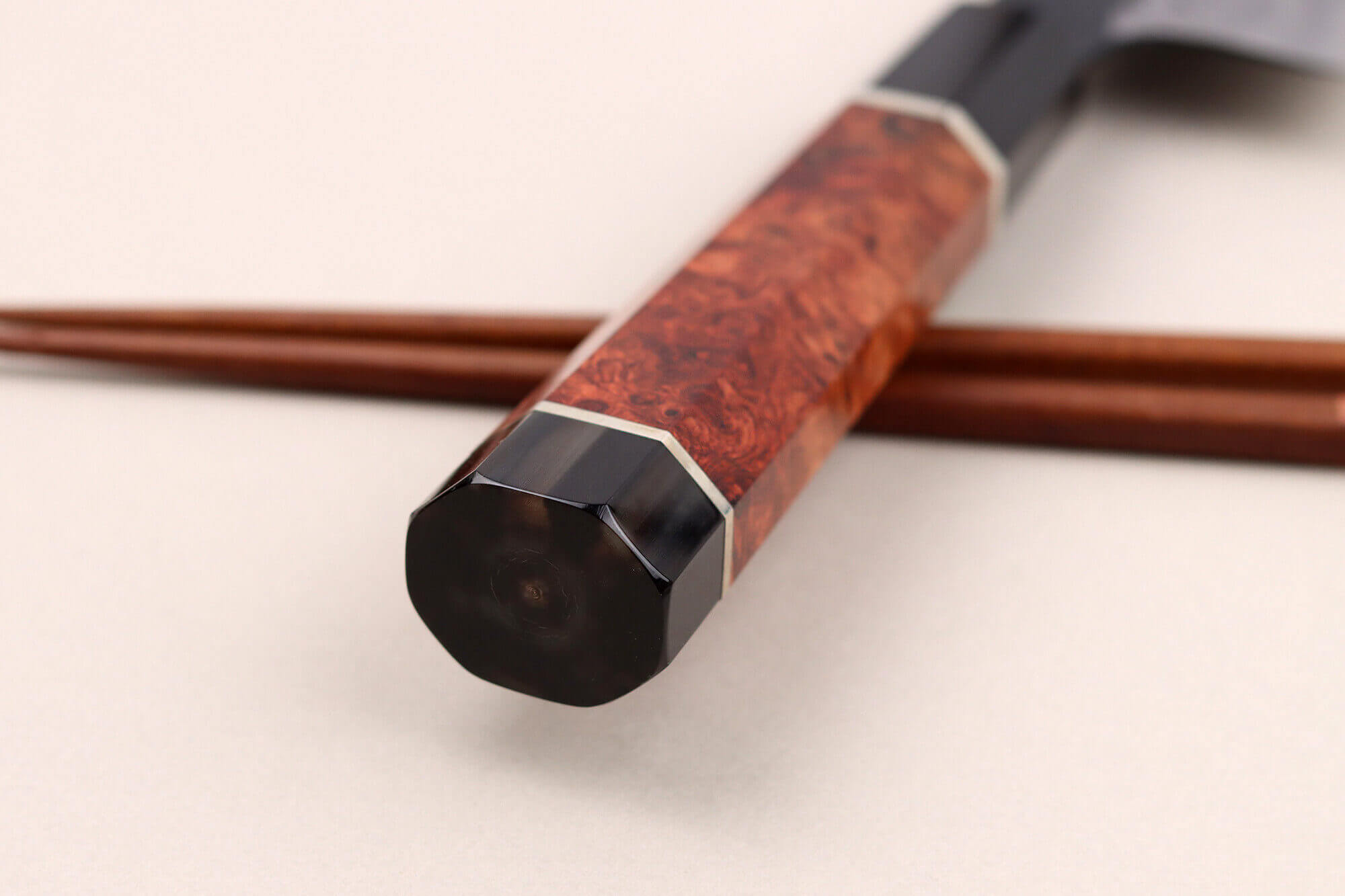 Enfin, de la pâte à bois est appliquée à l'endroit où la lame rencontre le manche, comblant les petits interstices. Ce détail assure une parfaite étanchéité, empêchant l'infiltration d'eau ou de résidus alimentaires.