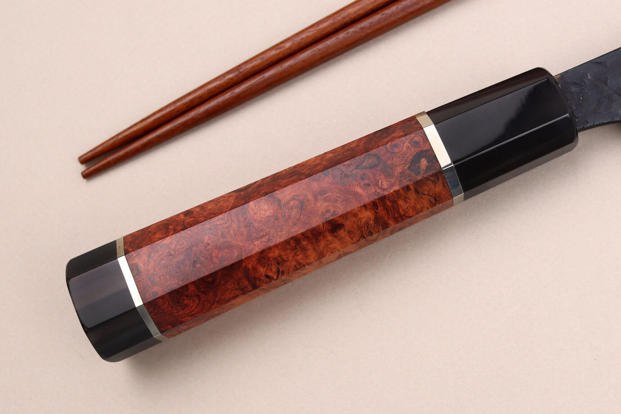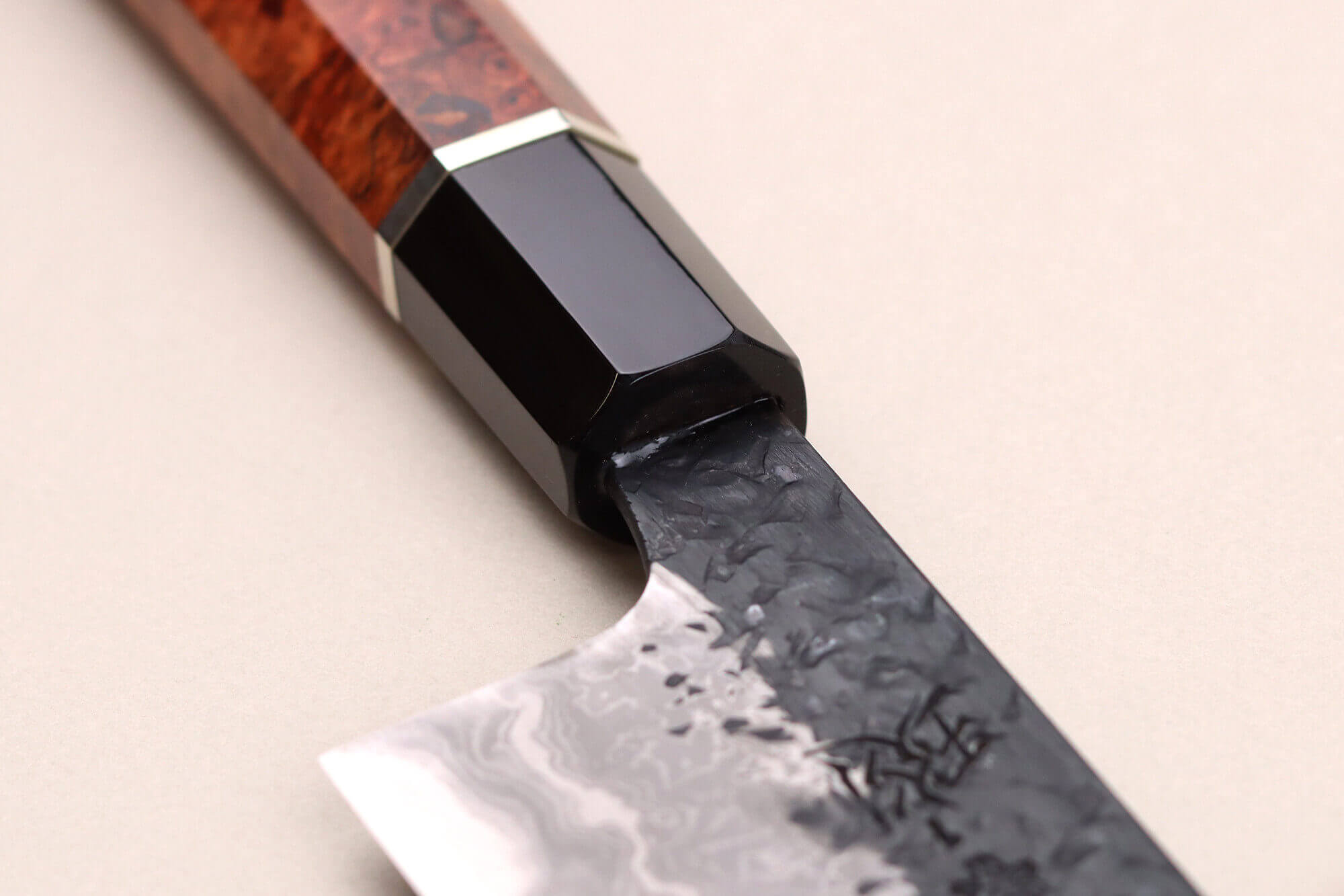 Le damas de cette lame a été entièrement réalisé à la main par l'artisan Kisuke Manaka, qui excelle dans l'art du laminage du damas. Pour créer ce damas unique, il utilise la technique du Warikomi, un procédé exigeant une grande précision. L'acier souple est chauffé à haute température, fendu pour y insérer une barre d'acier rigide, et soudé avec une poudre spéciale. Cette méthode traditionnelle, que Manaka san maîtrise parfaitement, requiert beaucoup de temps !
