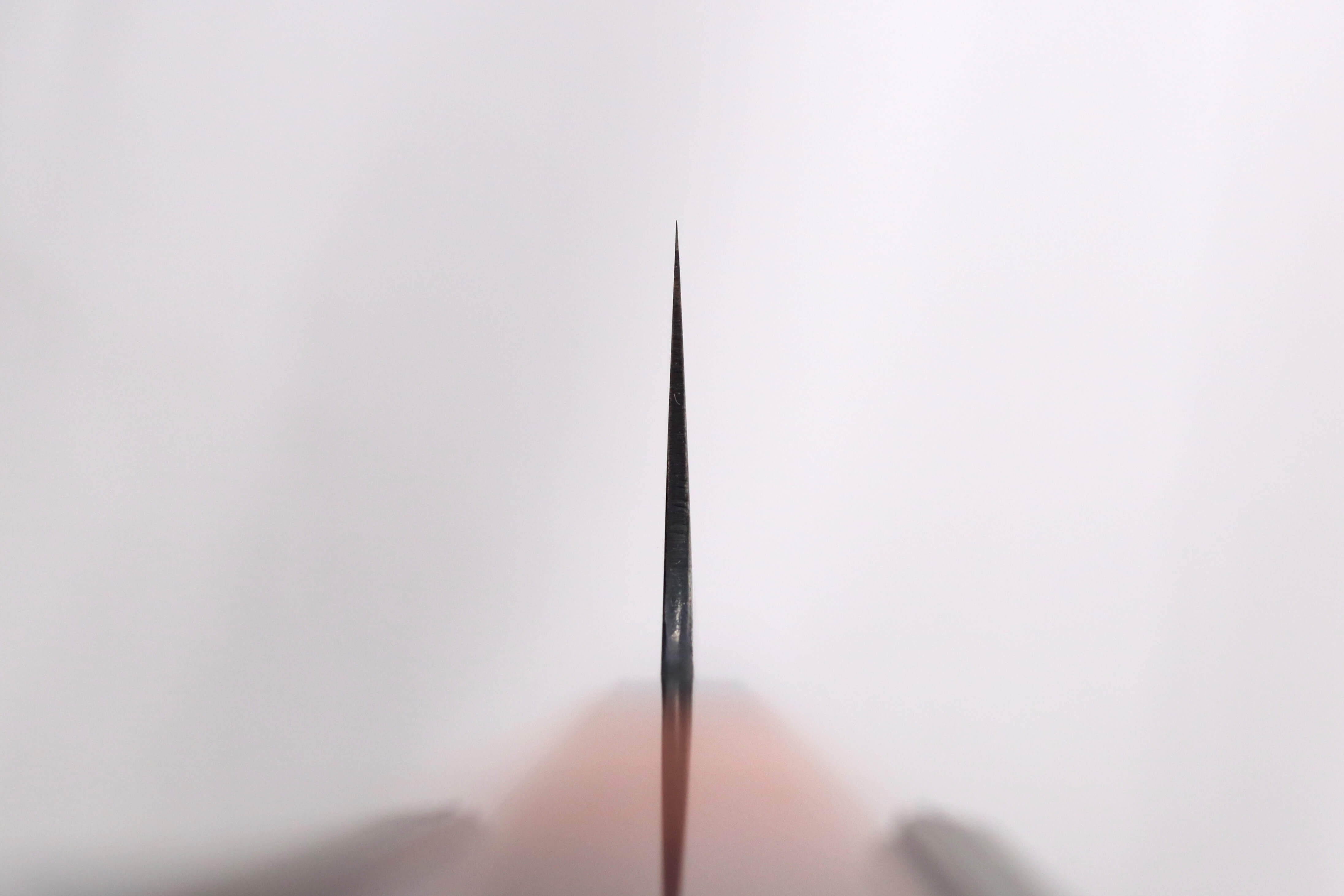 Le tranchant de cette lame a également été affûté à la main par le forgeron, utilisant des pierres à aiguiser de différents grains pour une précision optimale. L'émouture est de type plate (flat), ce qui confère à la lame une grande finesse, offrant un tranchant rasoir et facilitant la pénétration dans les aliments. L'émouture plate est reconnue pour son apparence soignée, sa solidité, et sa relative facilité à reproduire.