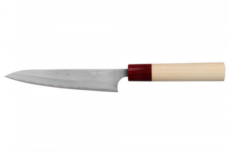 Ce couteau universel présente une lame de 15cm à la structure en San Maï (qui signifie "3 couches"), typiquement japonaise. Cette technique consiste à forger un noyau en acier rigide qui est, par la suite, recouvert d'une couche d'acier plus souple qui se replie sur elle-même. Ainsi, le cœur est protégé et la lame possède un équilibre optimal pour une résistance accrue.