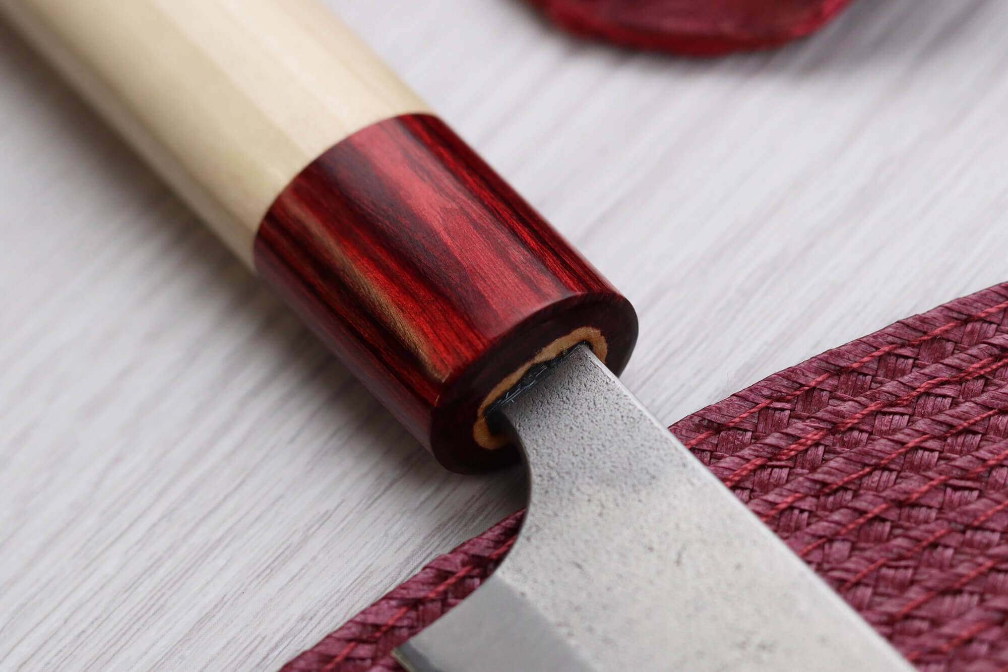 Pour compléter le manche, une mitre en pakkawood rouge est ajoutée pour faire le lien avec la lame. C'est une matière composite à partir de bois laminé et de résine qui a l'aspect d'un véritable bois, tout en ayant des capacités résistantes accrues.