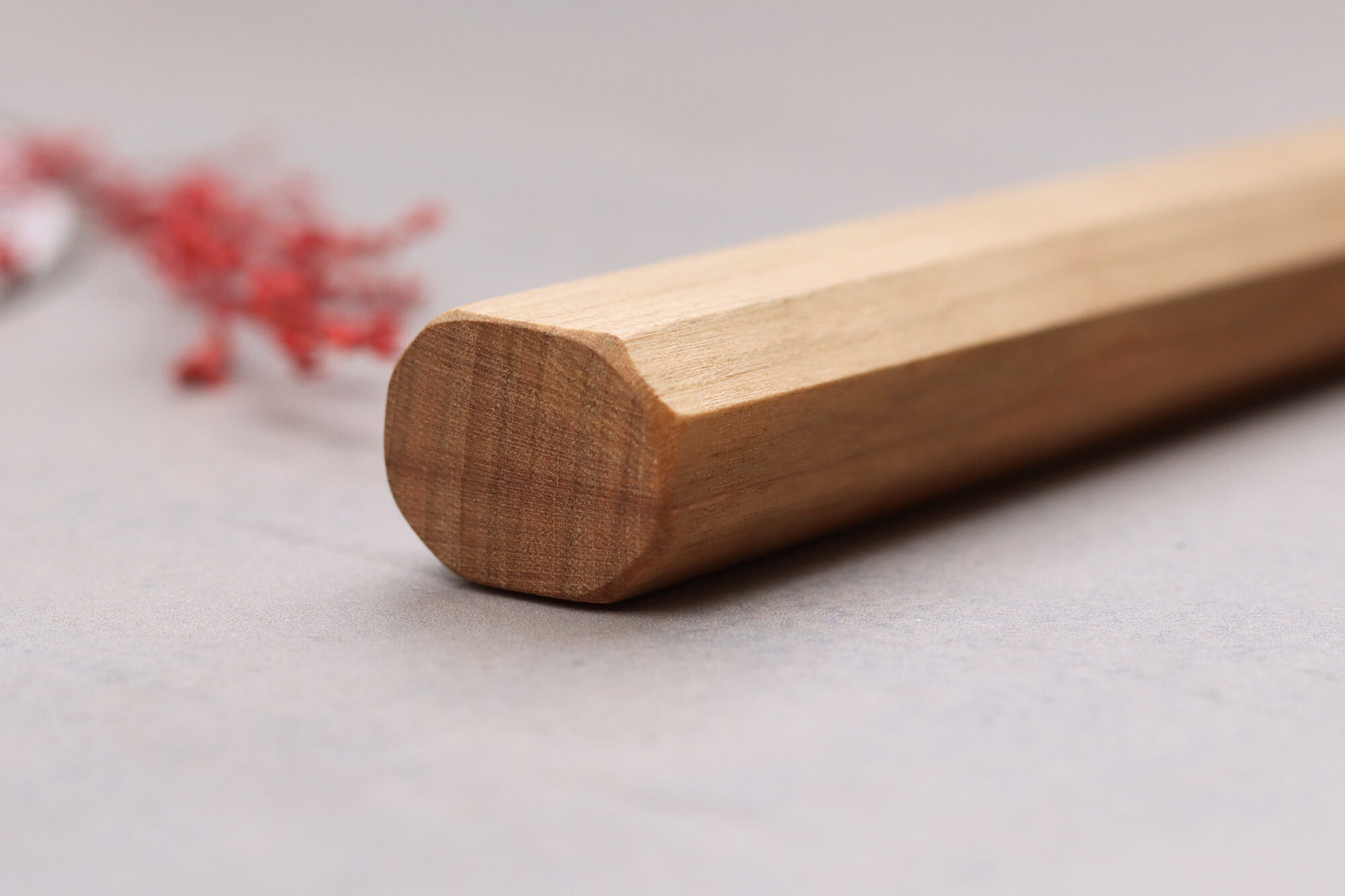 Il a été réalisé en bois de cerisier, une essence sacrée au Japon car il est la métaphore de la nature éphémère, de la beauté des choses et de la vie. Le cerisier est un bois mi-dur robuste et léger, qui possède une longue durabilité. Son coloris brun se pare de reflets rouges à rosés qui sont visibles une fois le couteau exposé à la lumière.
