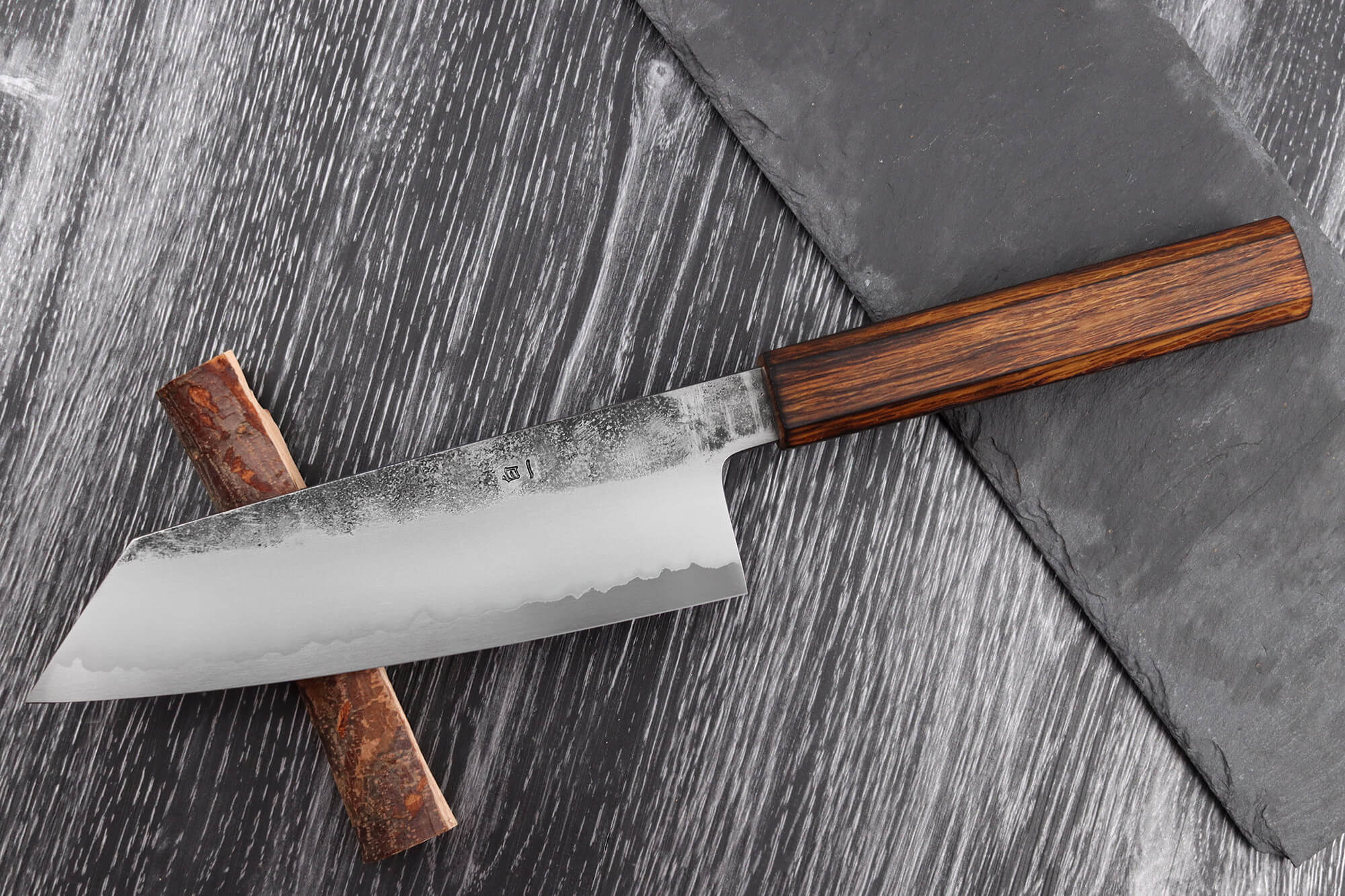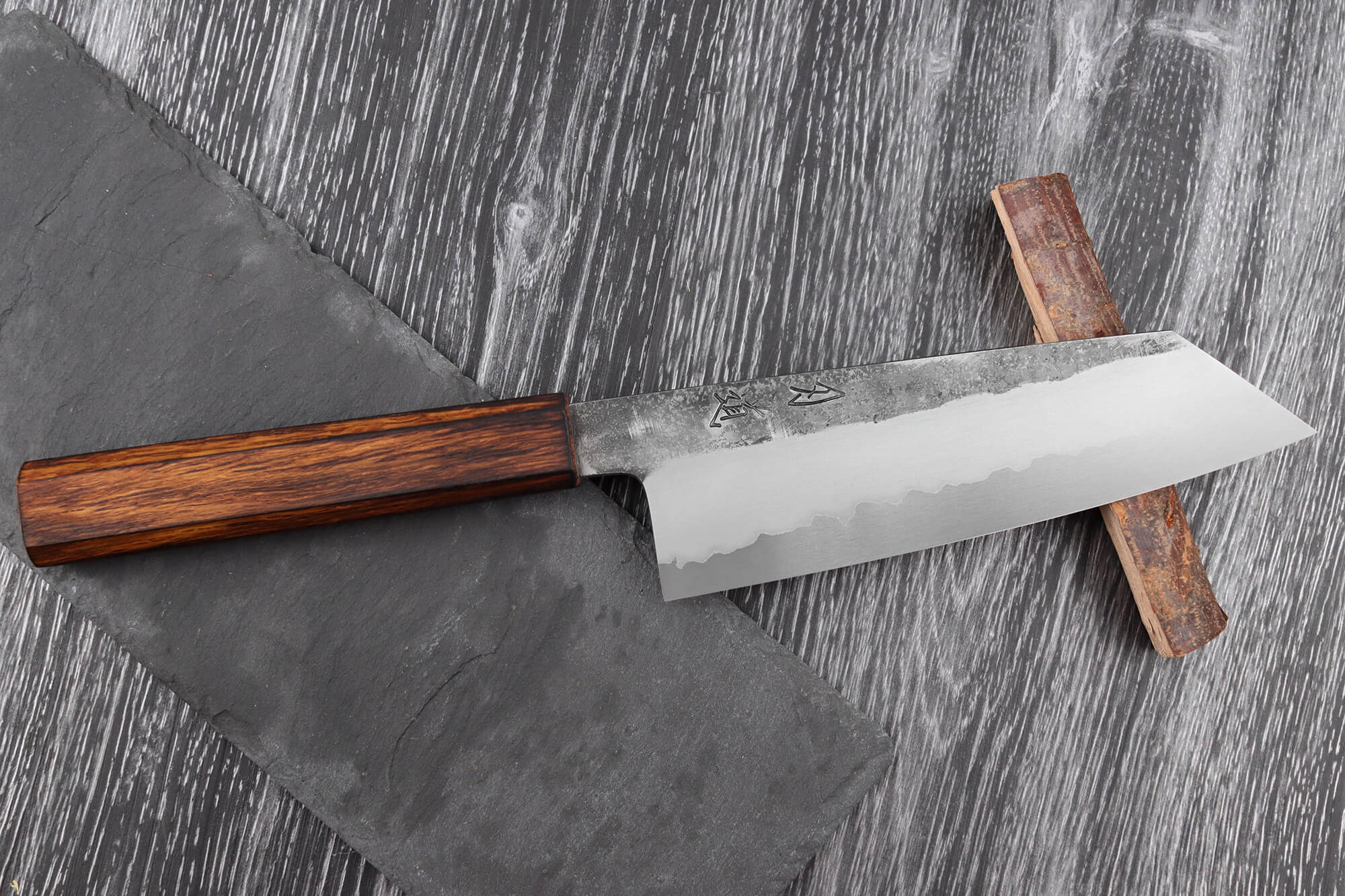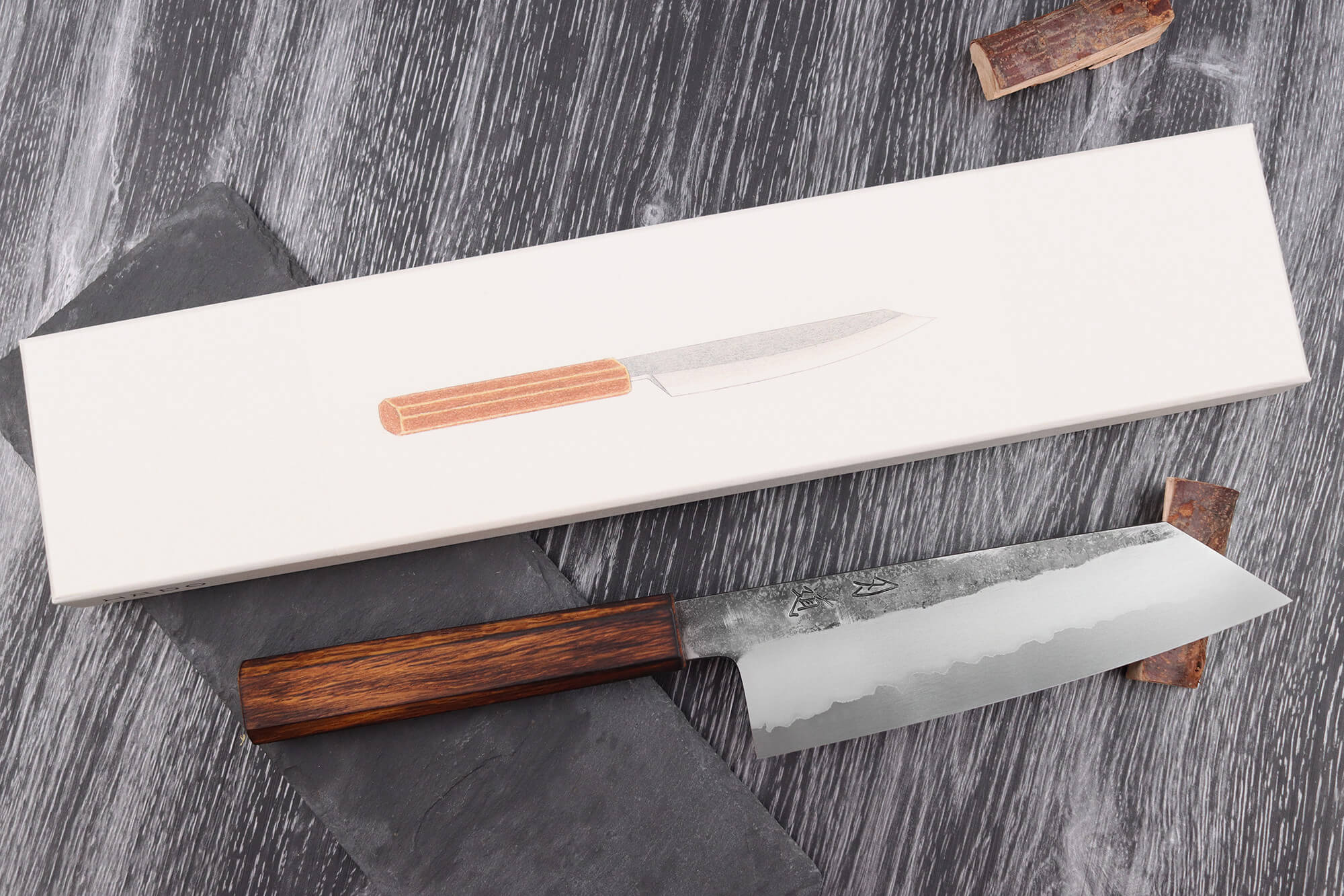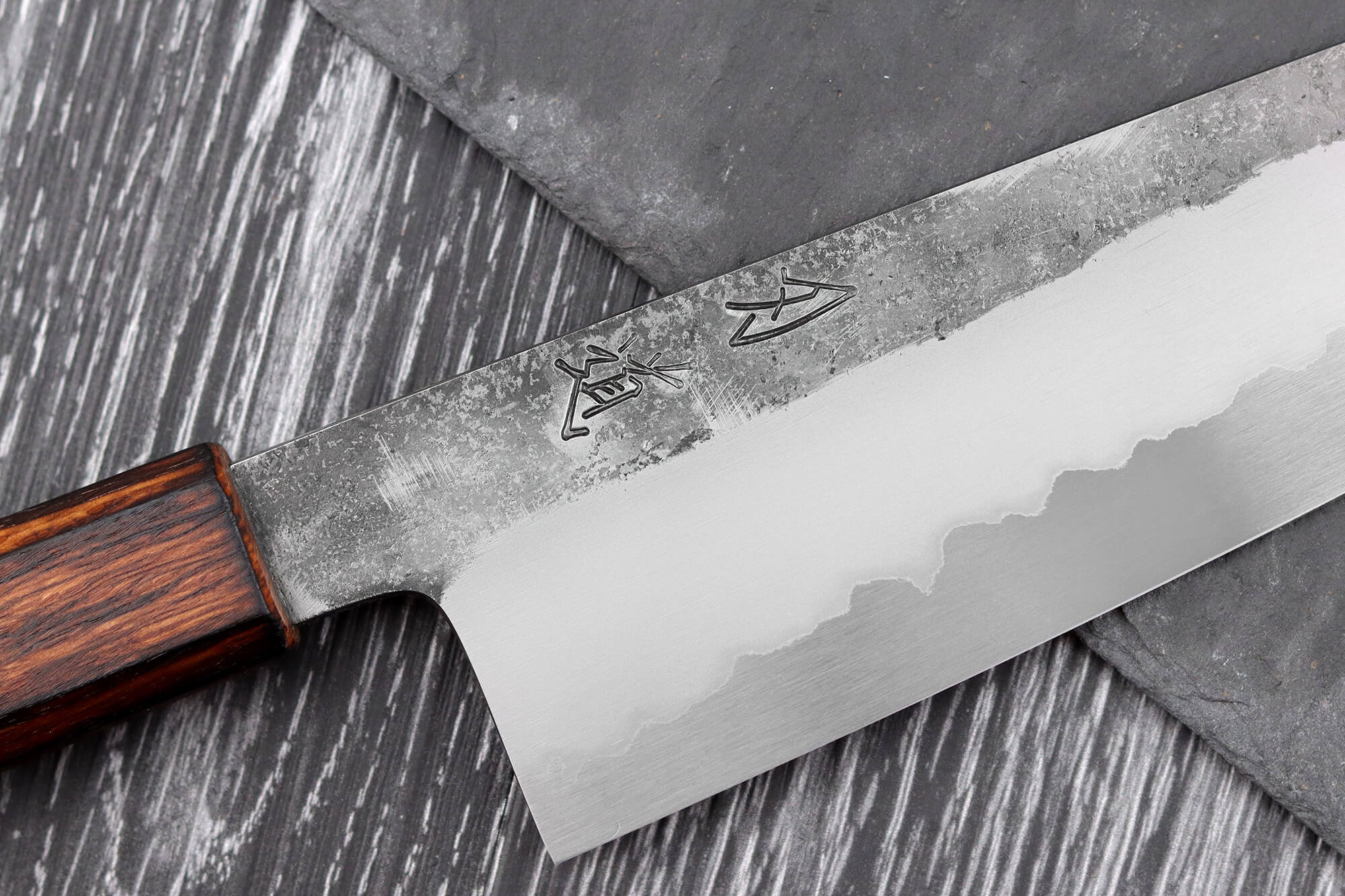 Ce couteau bunka a été forgé par Yoshikazu Tanaka, Maître Artisan Traditionnel certifié et renommé de la ville de Sakai. Issu d’une lignée de forgerons depuis quatre générations, il est célèbre pour sa capacité à marier des matériaux haut de gamme avec un design fidèle aux traditions japonaises. Une fois forgé, le couteau a été affûté par Tadataka Maruyama, maître aiguiseur de l’atelier Hado. Grâce à son travail méticuleux à la main sur une meule, Tadataka a apporté au couteau une netteté remarquable, assurant une performance de coupe incomparable.