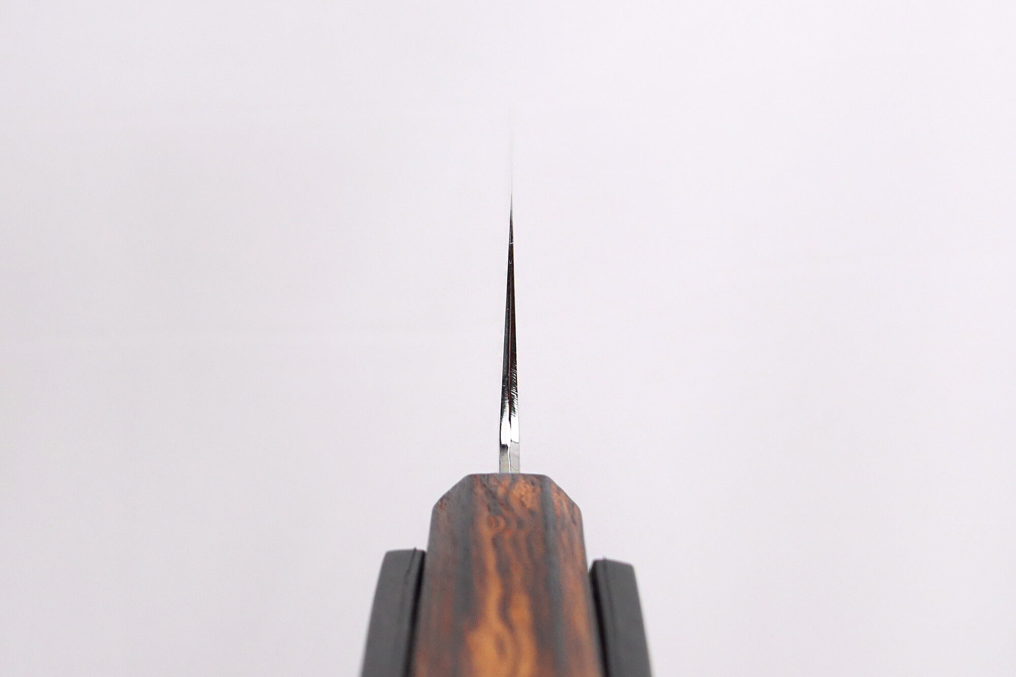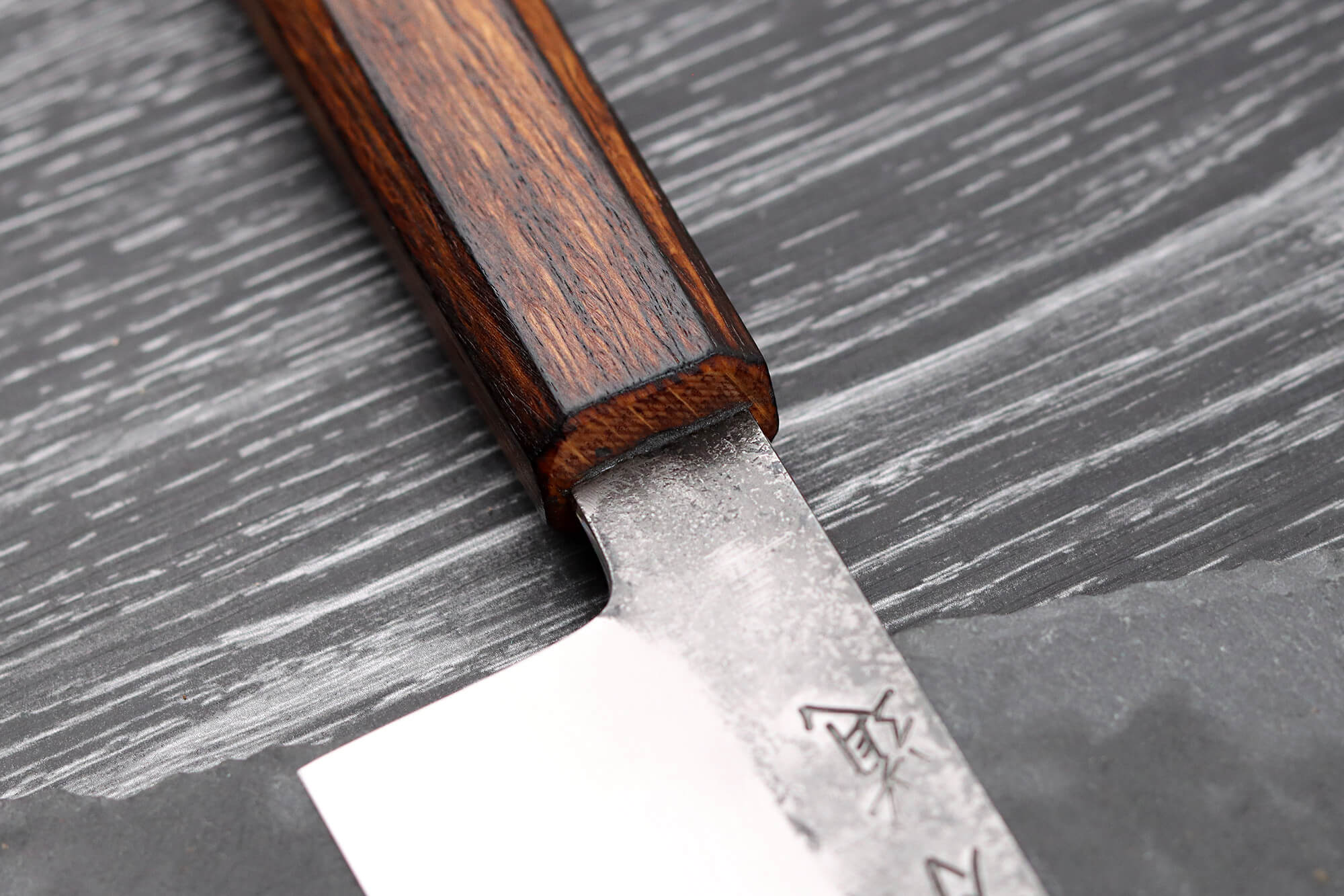 La lame de ce couteau de cuisine japonais a été soigneusement polie sur sa partie inférieure, lui conférant une finition élégante. La partie supérieure, en revanche, arbore une finition nashiji, qui ajoute une dimension visuelle unique à ce couteau artisanal japonais. Cette texture particulière évoque le nom de la gamme, Kirisame, signifiant "fine pluie" en japonais, un effet voulu et maîtrisé par Yoshikazu Tanaka pour refléter cette esthétique délicate.