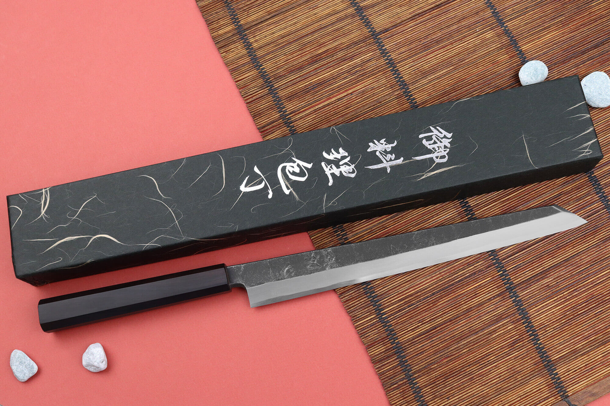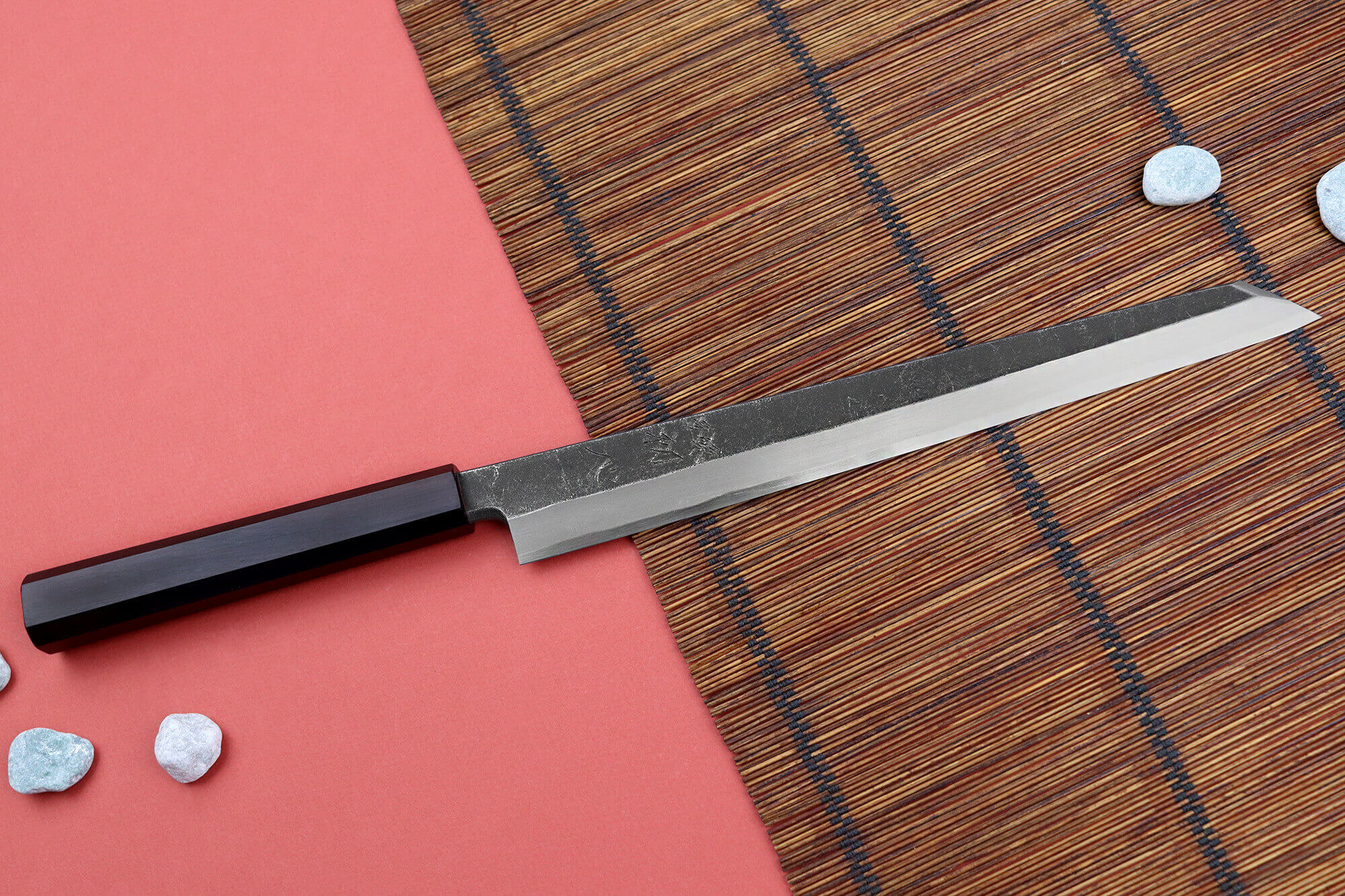 La marque japonaise Hatsukokoro propose des couteaux de cuisine de qualité, fabriqués par des artisans renommés. Ce couteau yanagiba kiritsuke incarne le savoir-faire de Toru Tamura, qui a forgé la lame, et de Tateo Myojin, qui a assuré un aiguisage méticuleux.