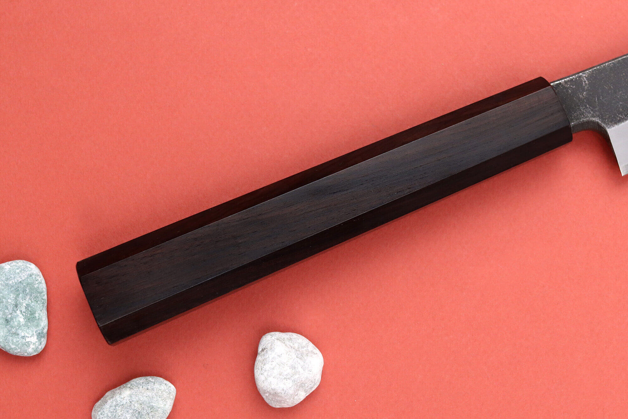 Ce couteau artisanal japonais présente un manche octogonal, adapté à toutes les mains pour une prise en main confortable. Il est conçu pour offrir une ergonomie optimale, idéale lors des longues sessions de préparation en cuisine.