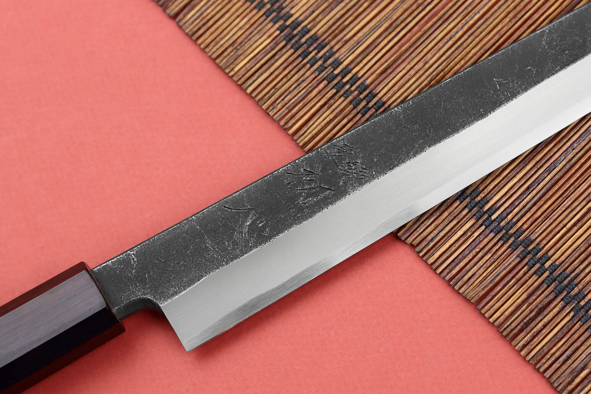 La surface de la lame présente une finition brute de forge, non polie, qui lui confère un aspect sombre et authentique, prisé par les chefs japonais pour son caractère traditionnel ! La lame est également ornée de kanjis gravés à la main, ajoutant une touche supplémentaire d’authenticité.