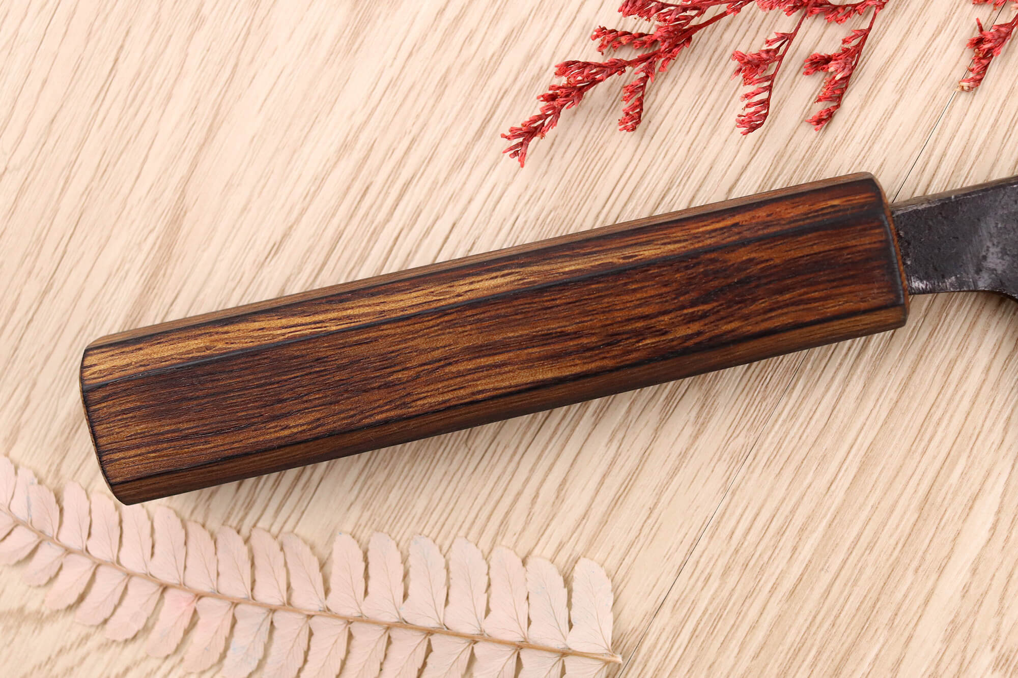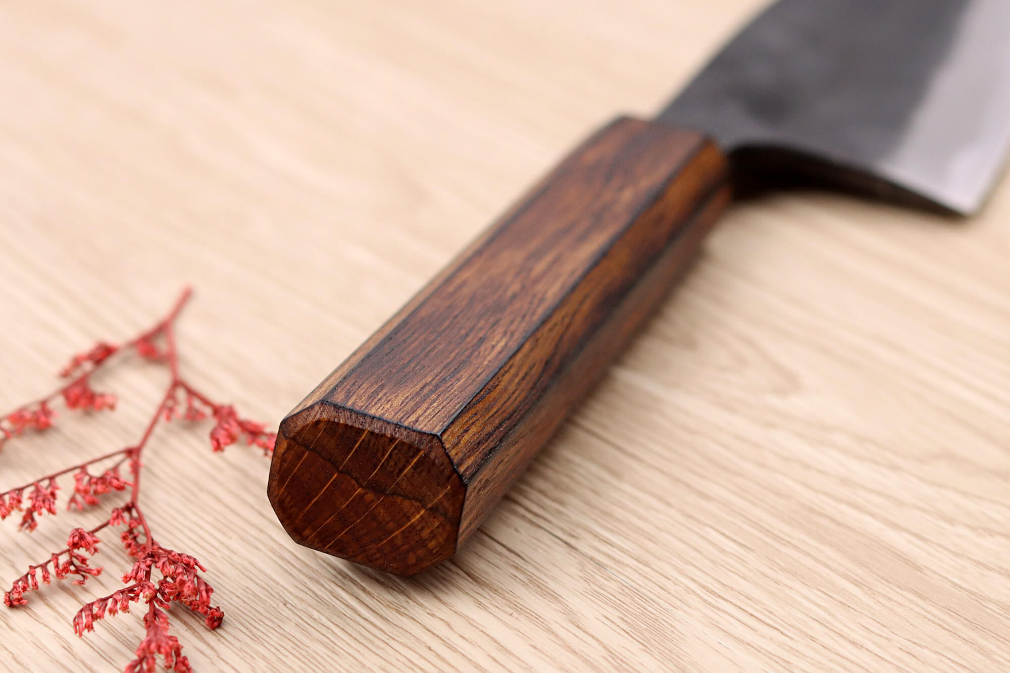 Le manche est réalisé en bois de chêne fumé, sélectionné pour sa résistance et sa noblesse visuelle : il contraste élégamment avec la lame brute et résiste à l’usage.