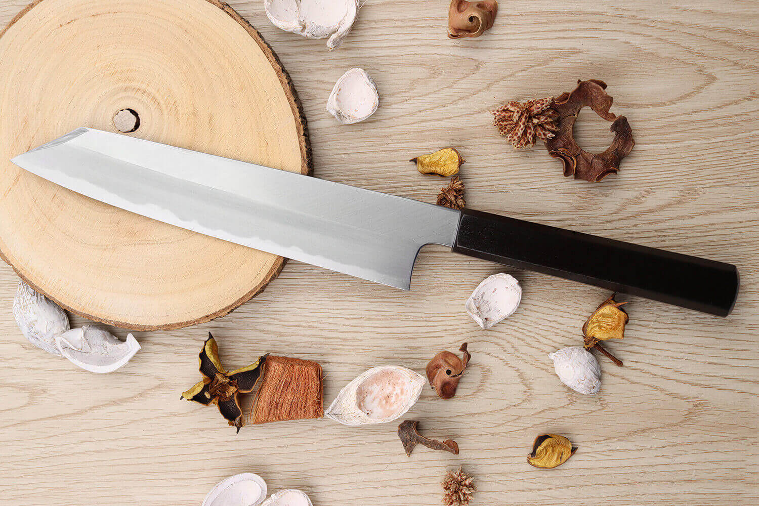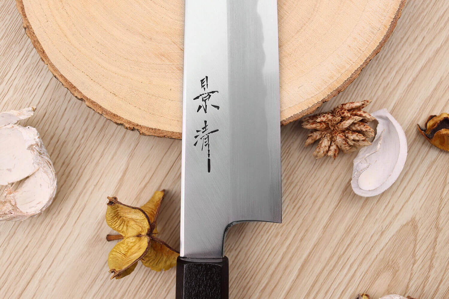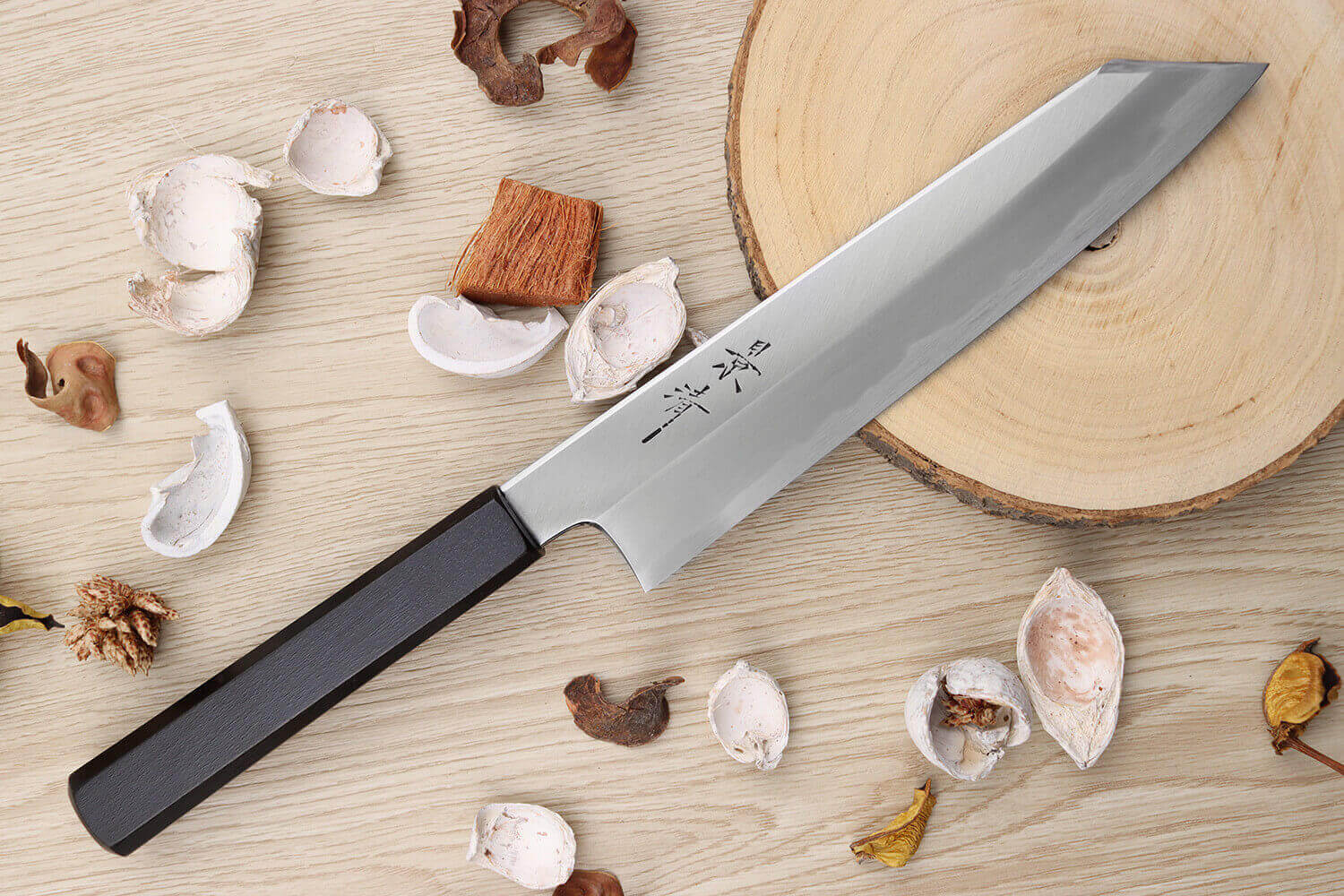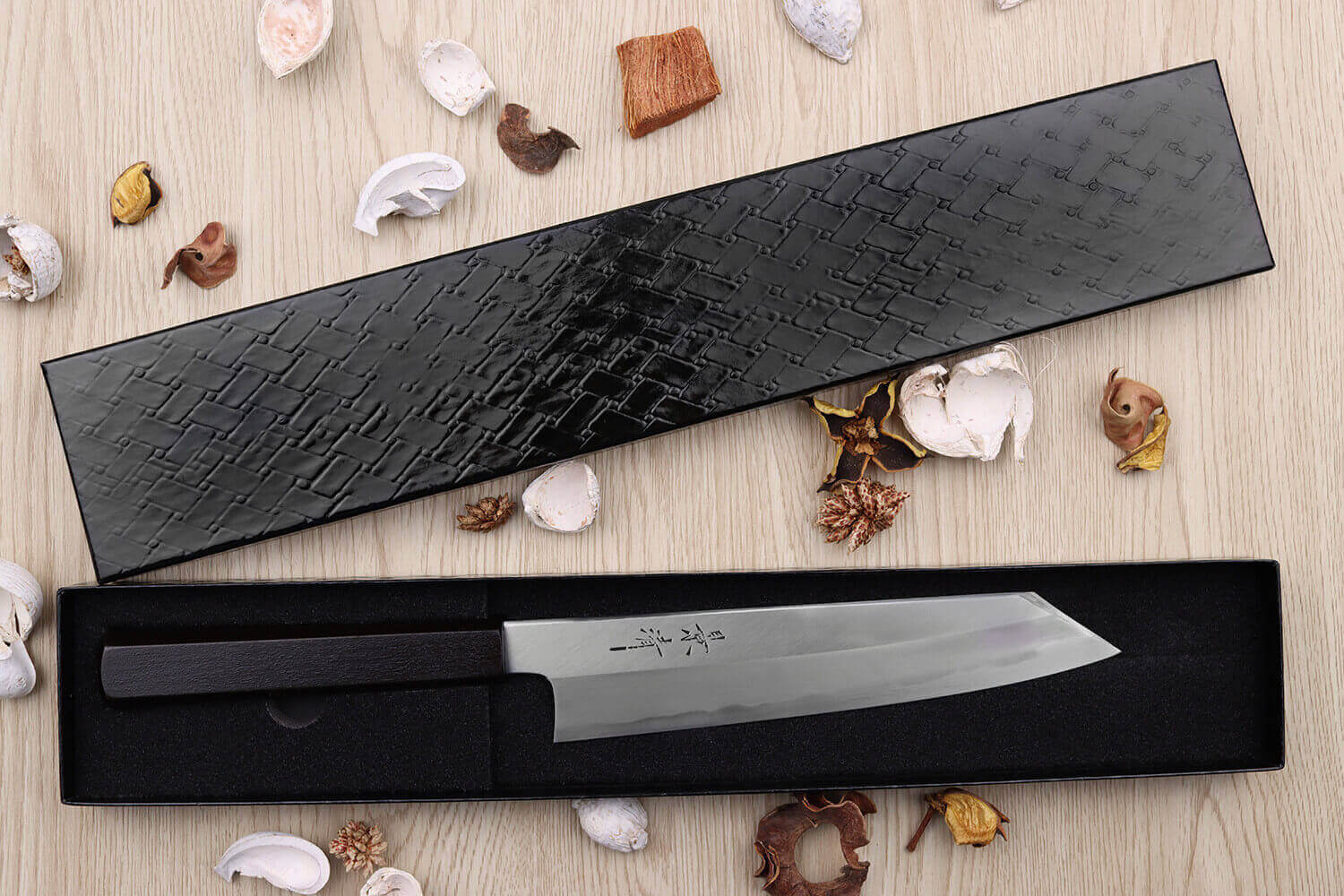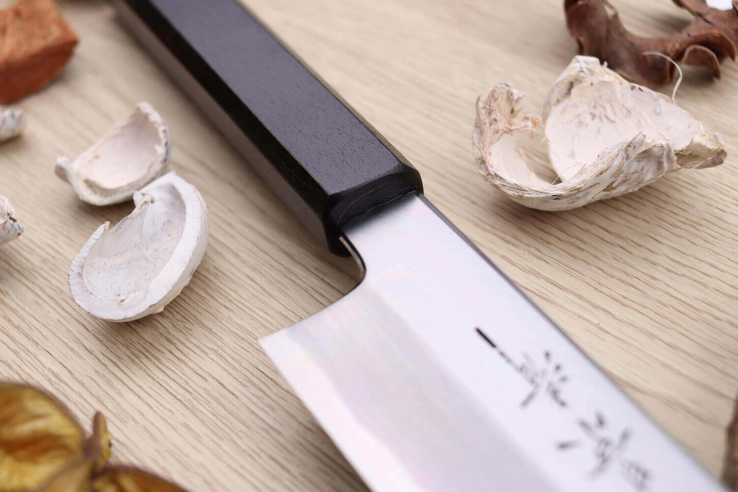 Le manche est réalisé en bois de magnolia, une essence robuste que l'on rencontre souvent dans la coutellerie japonaise. Taillé de façon octogonale, il convient au cuisinier droitier comme au cuisinier gaucher, et reste très agréable en main. Le magnolia est ensuite laqué de façon traditionnelle, par un artisan expert de la préfecture de Nagano. Il devient alors entièrement noir, une teinte profonde qui l'enveloppe complètement.