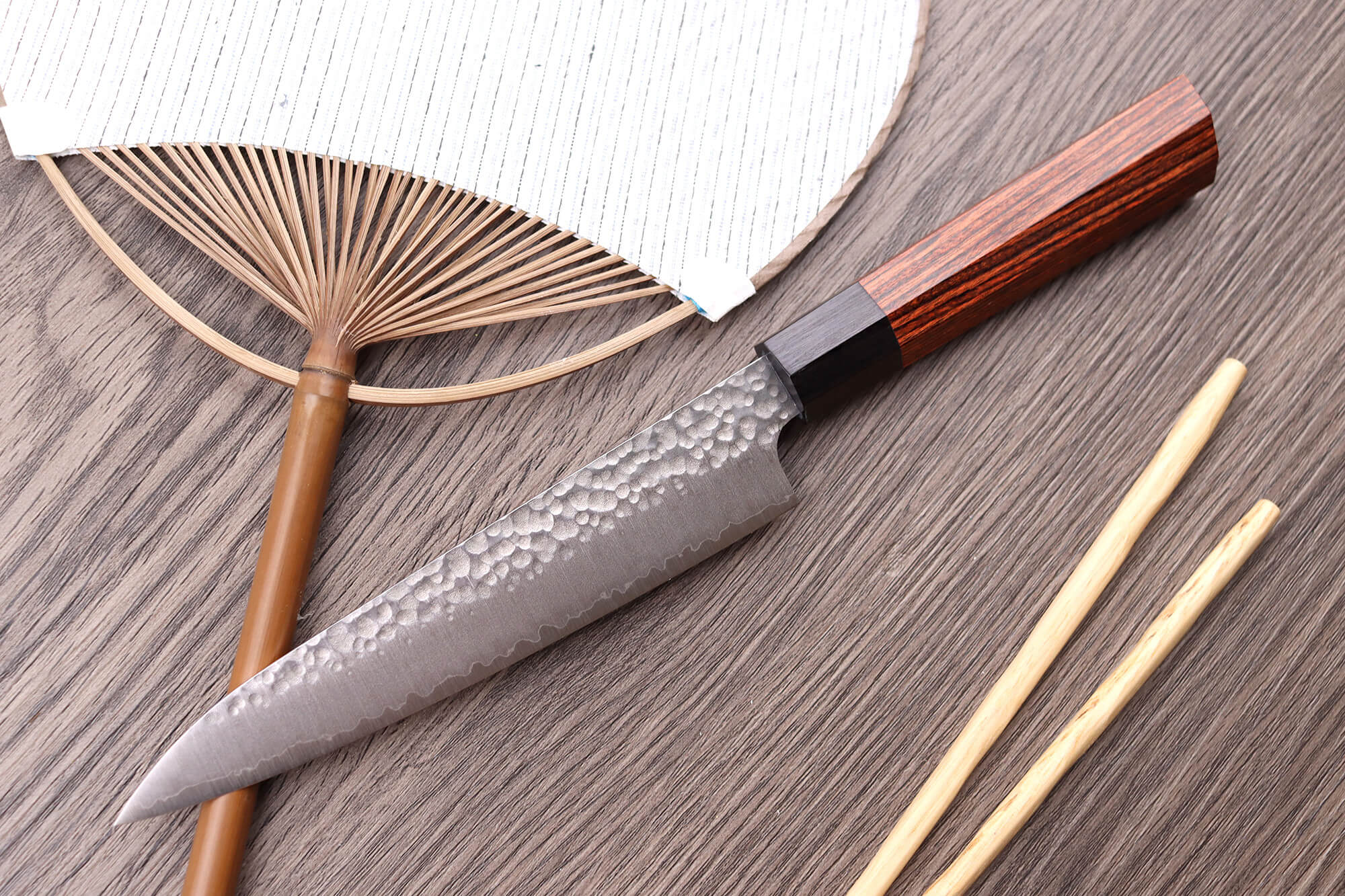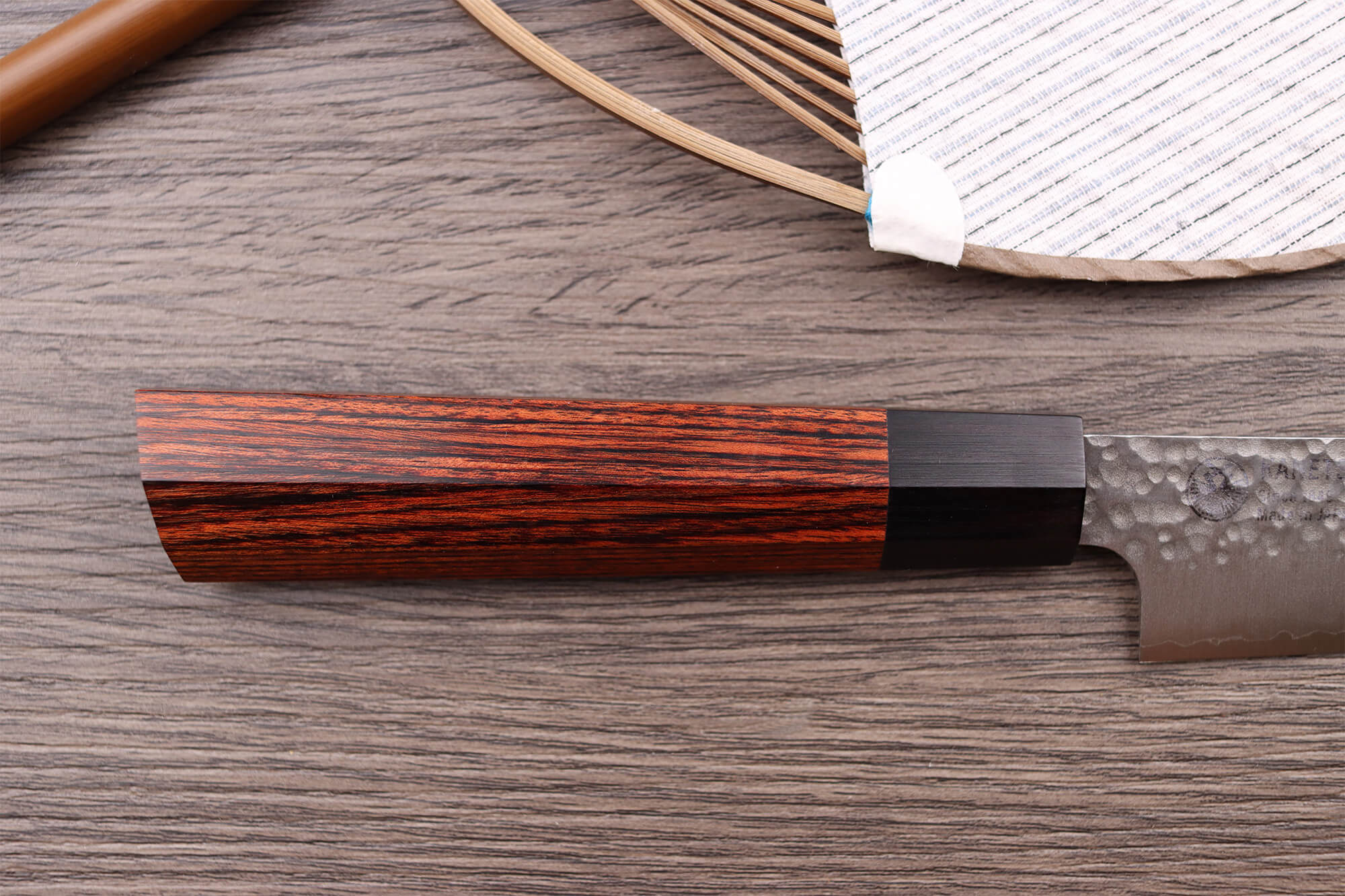 Le manche de ce couteau japonais est réalisé en bois de pakka (aussi appelé Pakkawood). C'est un matériau composite qui mélange la résine et le bois laminé, ces deux derniers étant compressé à chaud pour les assembler. Le résultat est naturel et pourrait se confondre avec du bois, grâce aux veines uniques que l'on peut admirer sur chaque couteau. La mitre du couteau, faite du même matériau, est quant à elle de couleur noire.