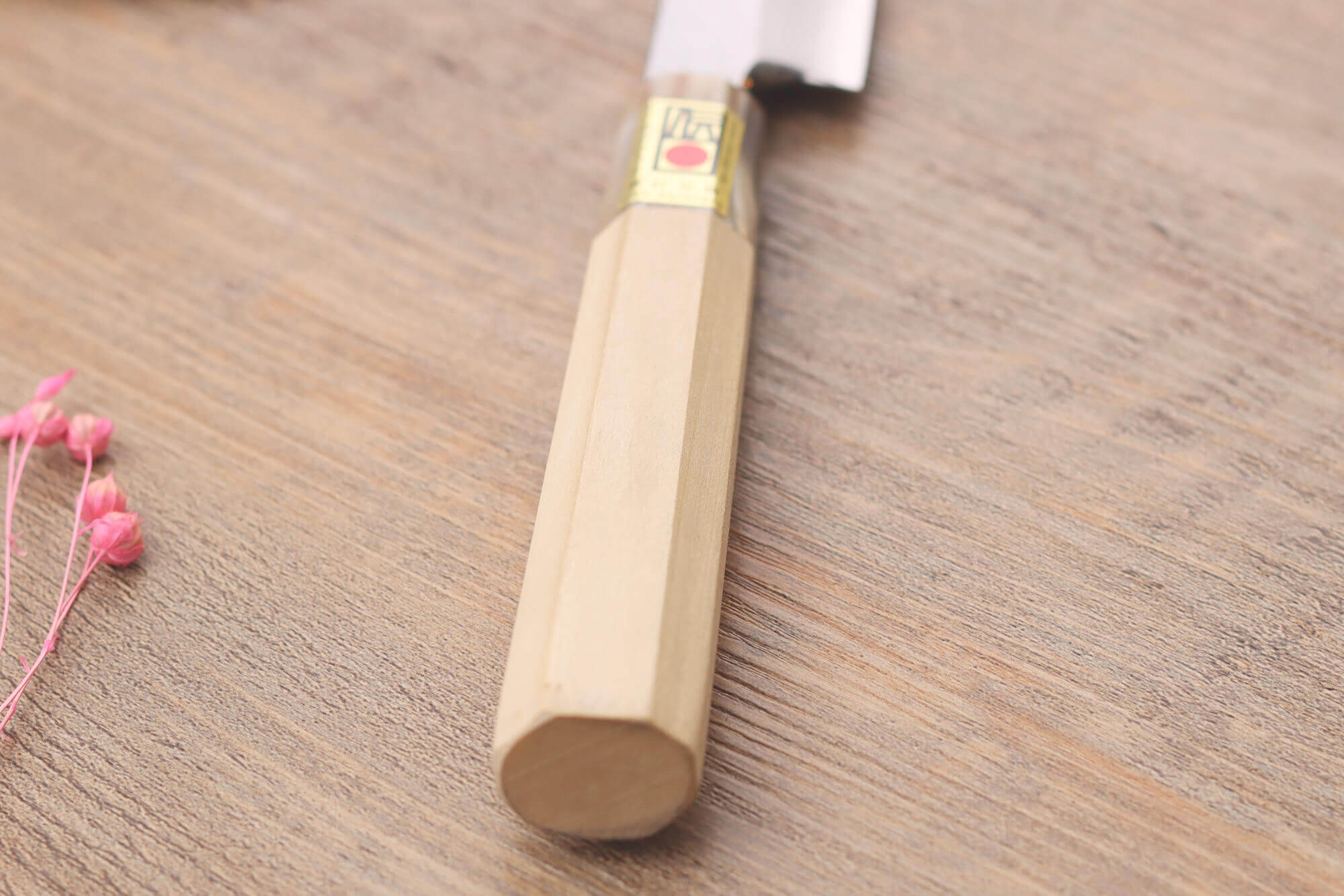 Il est aussi important de noter que la lame s'intègre dans le manche en laissant le machi apparent : c'est la partie d'acier supplémentaire située à la jointure de la lame et de son insertion dans le manche. On pourrait penser que la lame ne s'insère pas correctement dans le manche, mais non, cet écart est bel et bien volontaire ! Il s'agit d'une tradition de la ville de Sakai : en jouant sur le centre de gravité du couteau, on parfait son équilibre.