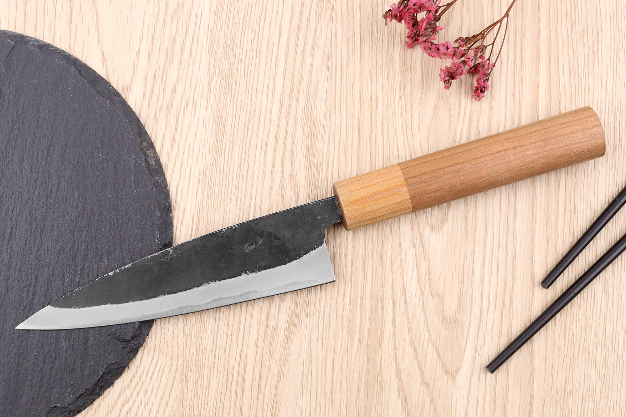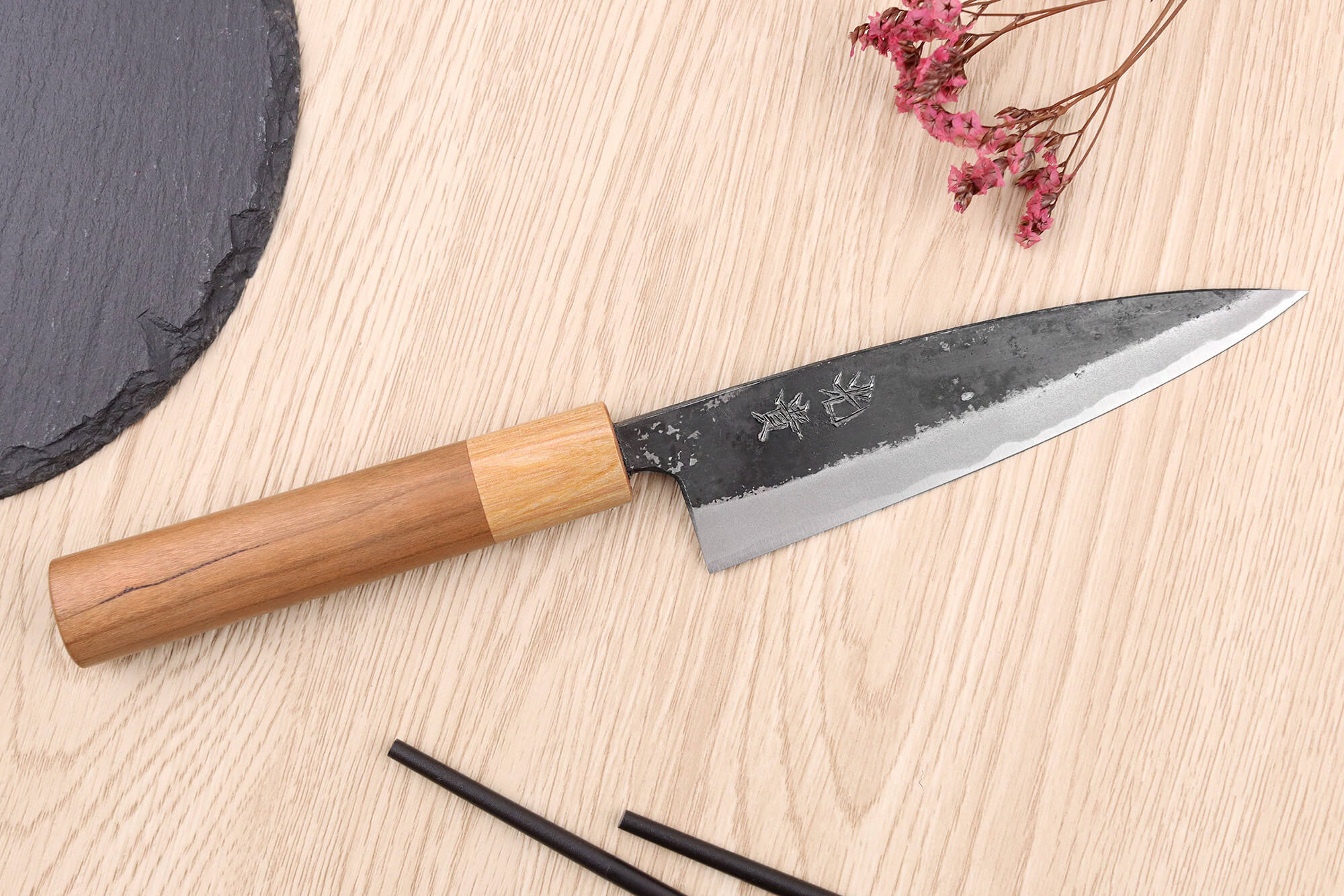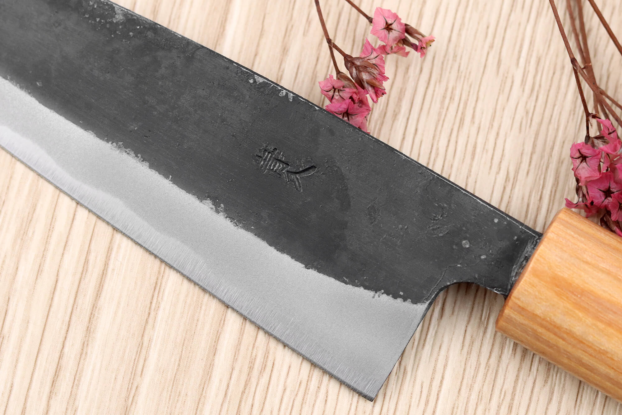 La finition brute de forge affiche un esthétisme brut et authentique, et les kanjis gravés à la main apportent une touche artisanale unique à votre couteau de cuisine japonais.