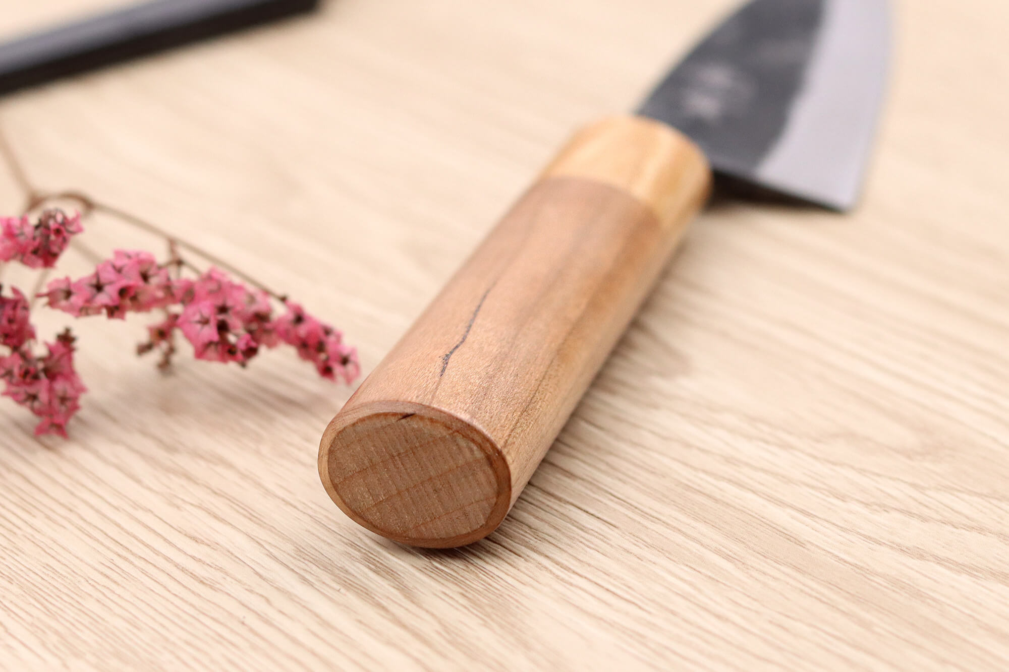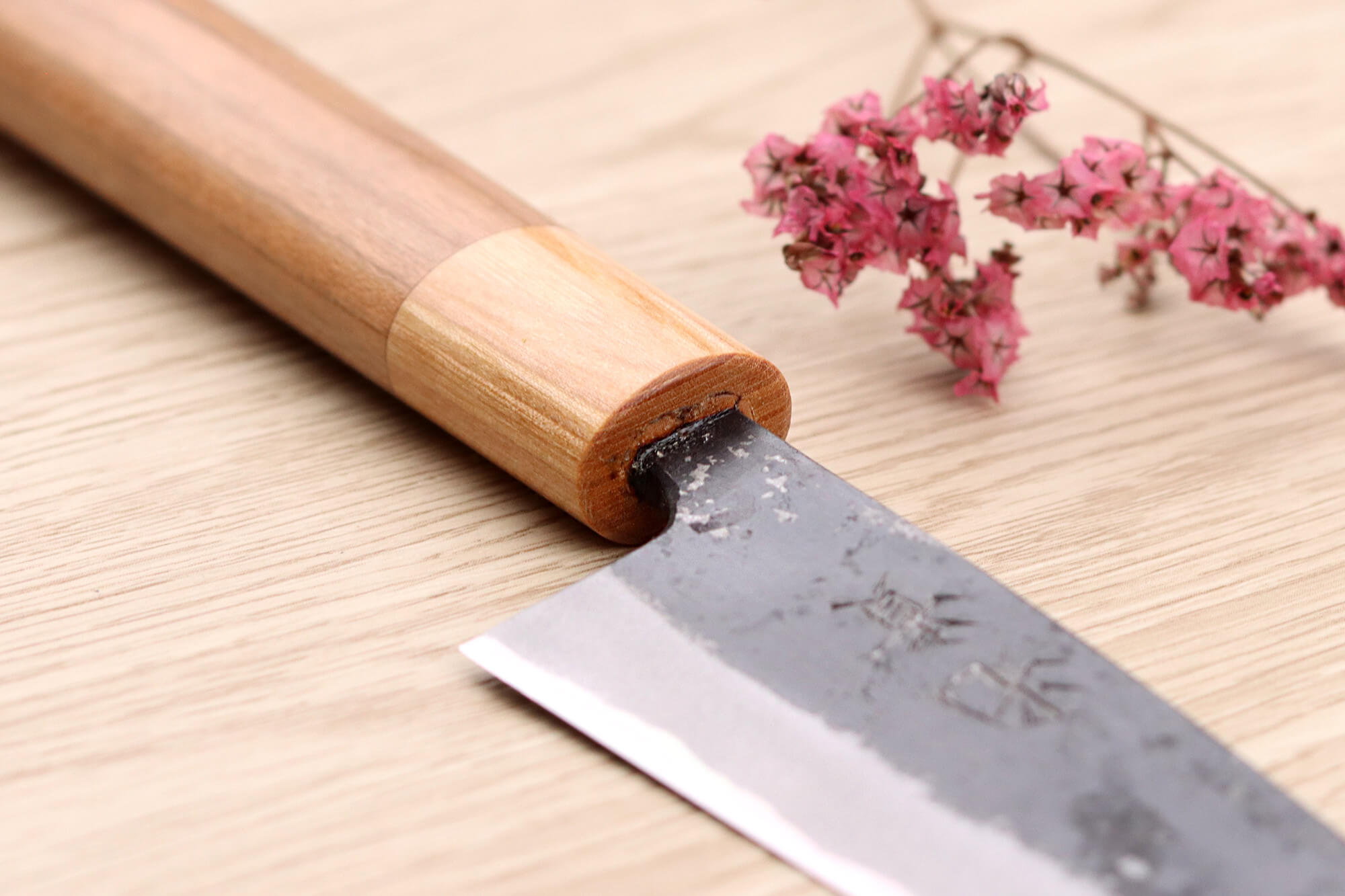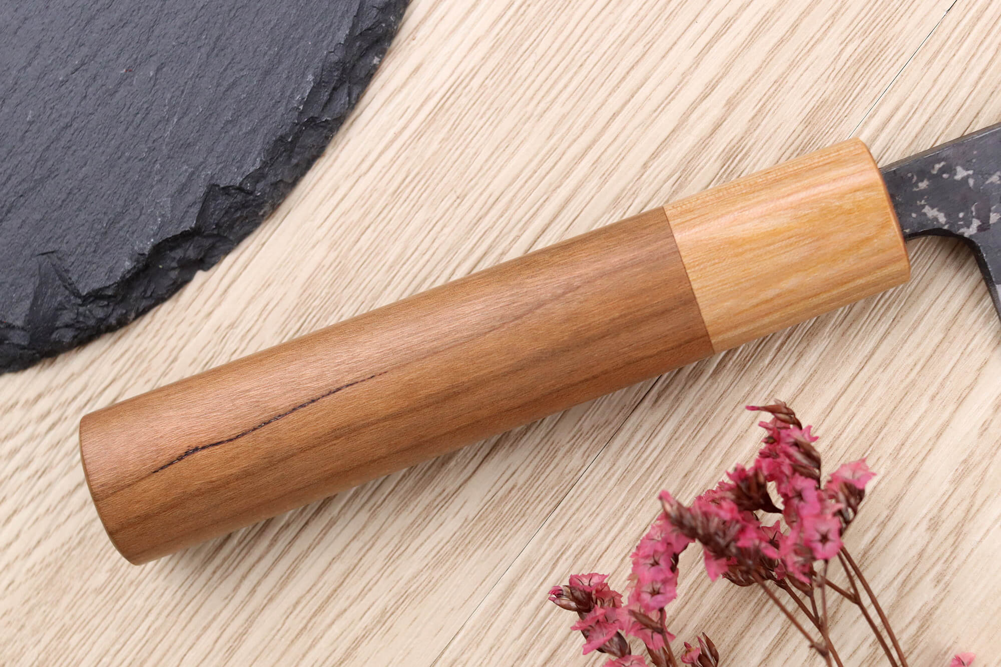 Le manche de votre couteau artisanal japonais est fabriqué en bois de cerisier, une essence naturelle appréciée pour sa teinte claire et chaleureuse. Il est complété par une mitre en pakkawood blanc, un composite durable et stable réalisé à partir de résine et de bois laminé.